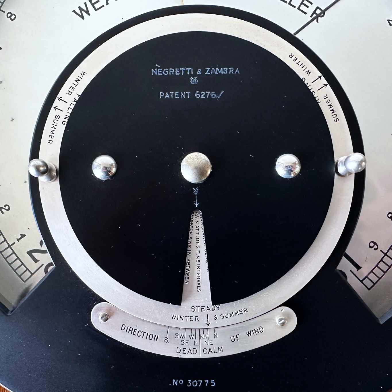 The central scale is surrounded by a ¾”wide black painted bezel which supports a 4.5” diameter central weather forecaster. The forecaster was introduced by the firm in 1915 (Patent No: 6276/15 & logo to the central plate), as a separate instrument which could be purchased in various standalone forms or within a set which included a portable aneroid barometer, and it proved to be extremely popular. To develop their product, the weather forecaster was also applied as a fixed and integral part of this larger scale domestic weather foreteller. Using the direction of the wind and barometer reading it became possible for the user to be able to forecast changes in the weather for the coming 12 hours.