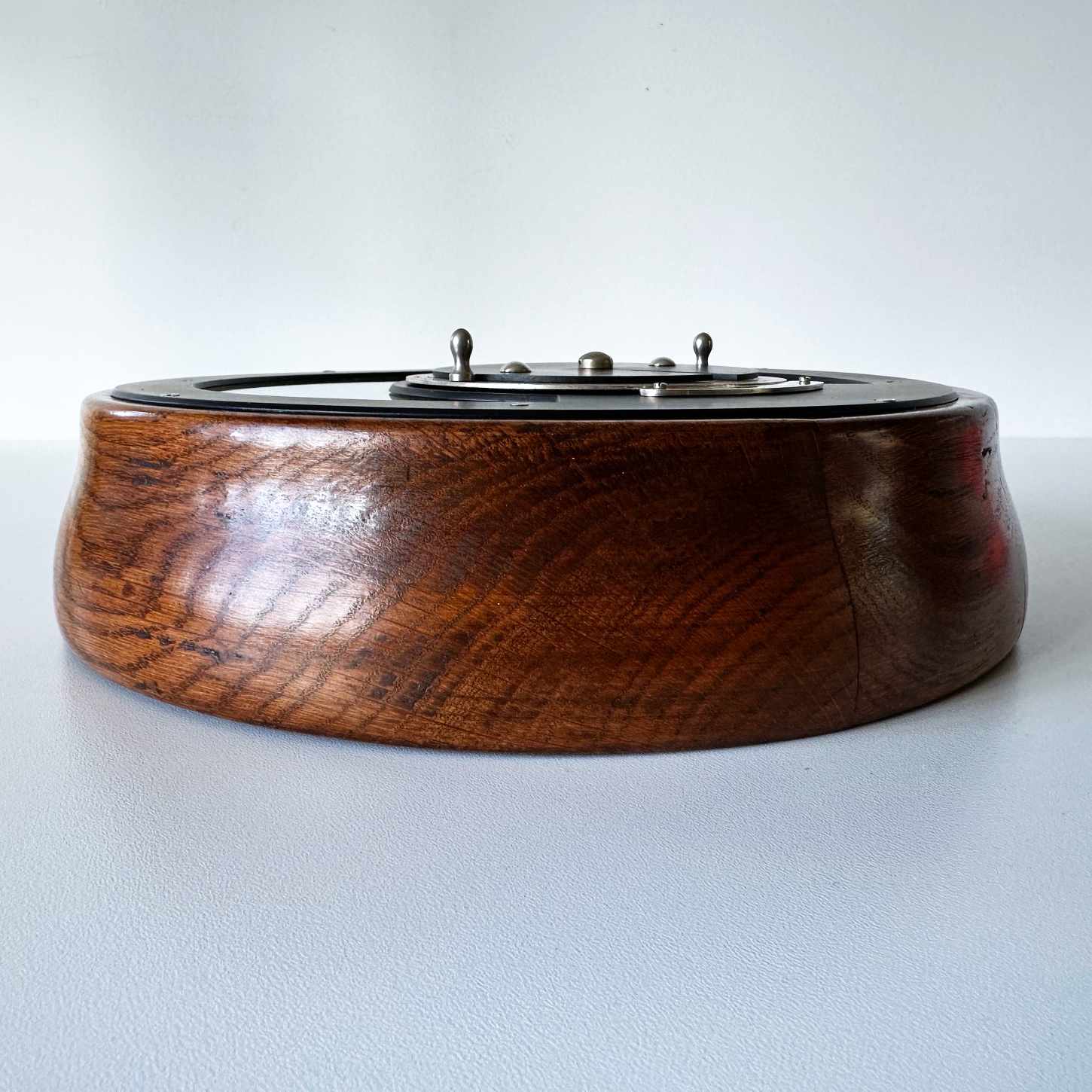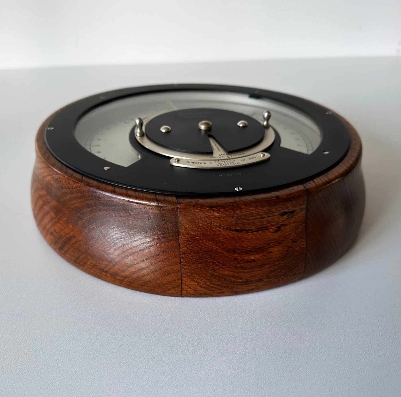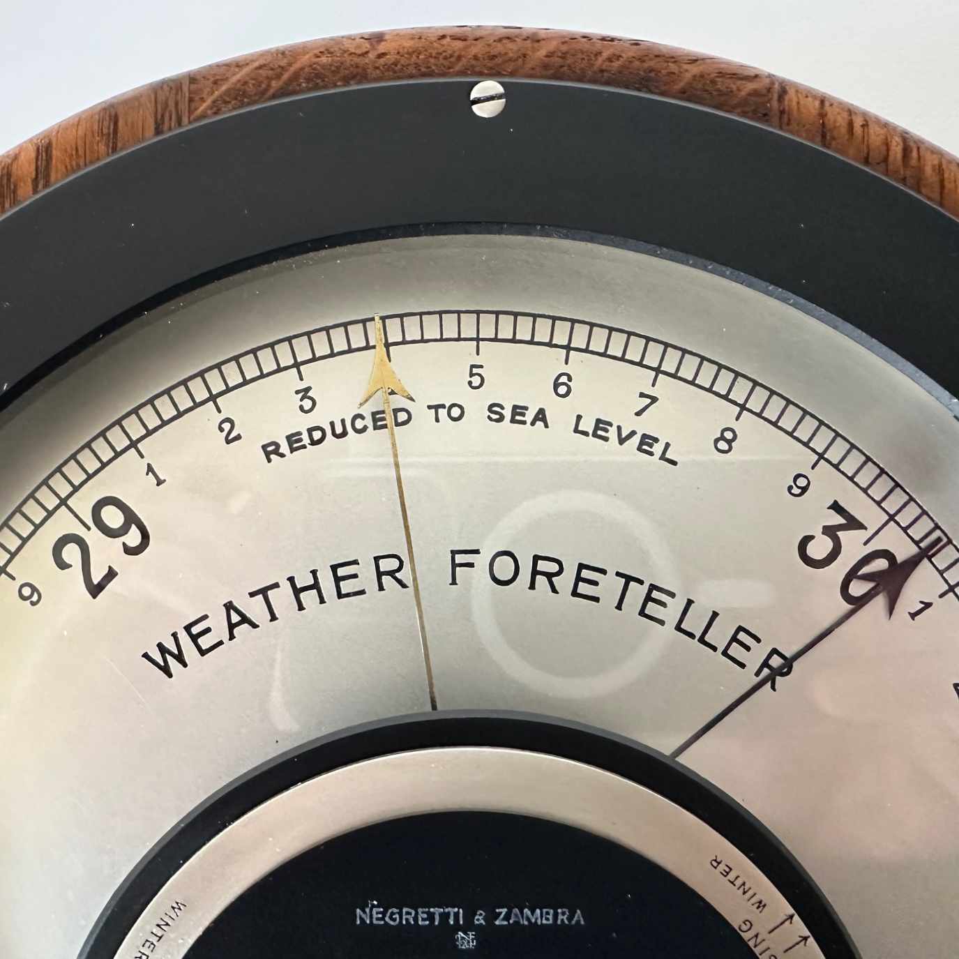In this case, the forecaster is comprised of two concentric rings with the prevailing barometer trends on the lower ring and a smaller scale below to align it to current wind direction. With both of these aligned, the top plate which operates the brass set pointer on the dial is then adjusted to the current pressure reading. The setting of these positions will then reveal a weather reading in the cut-out section on the central plate. An ingenious way of bringing two separate products together to create a single harmonious instrument.