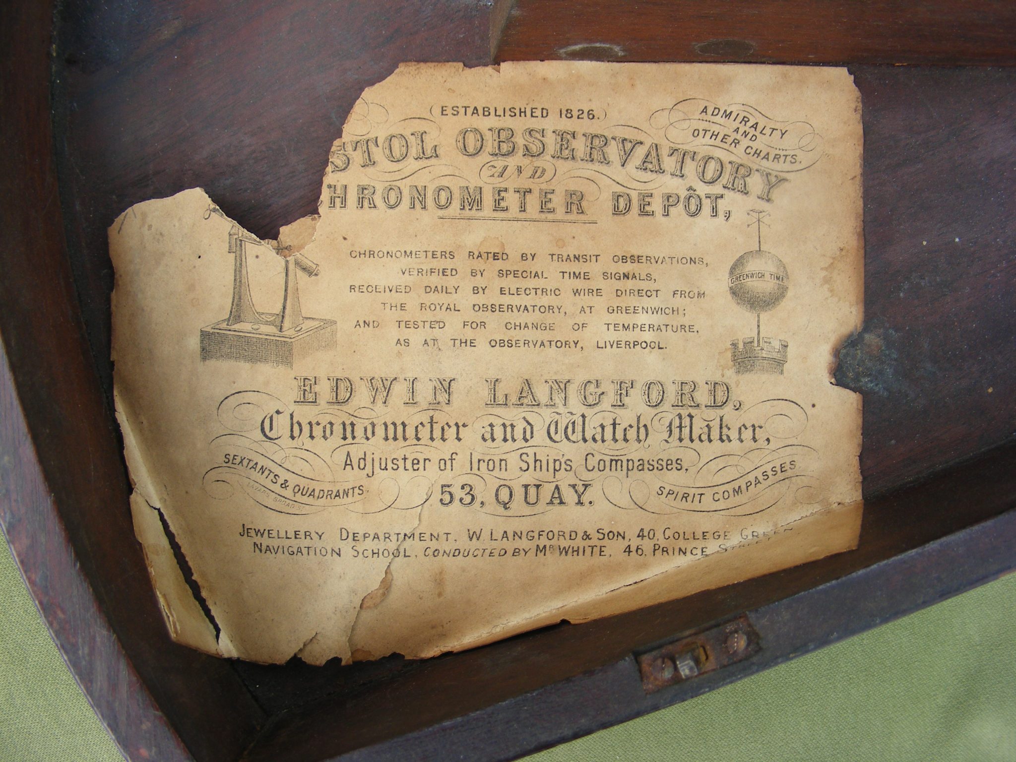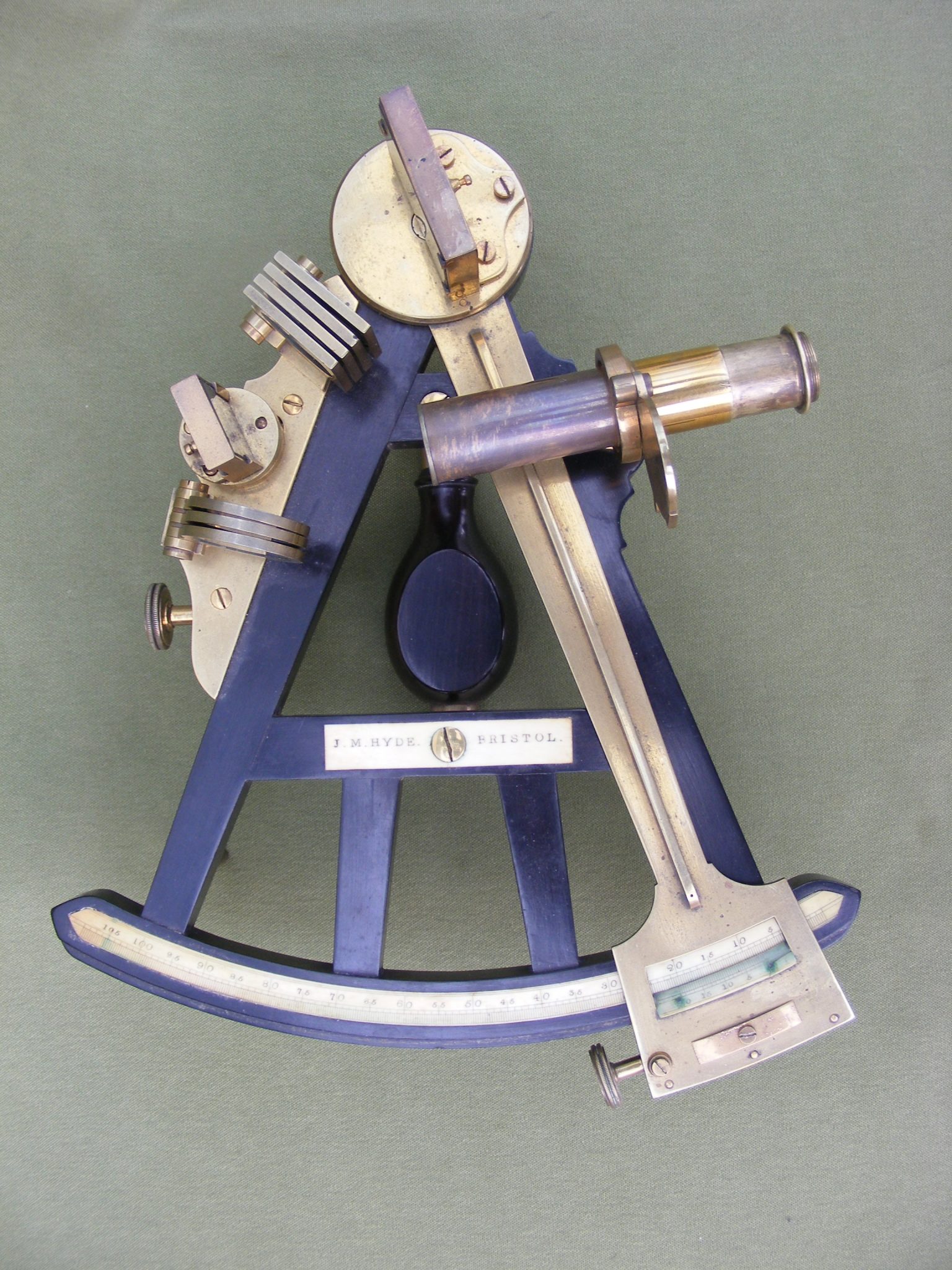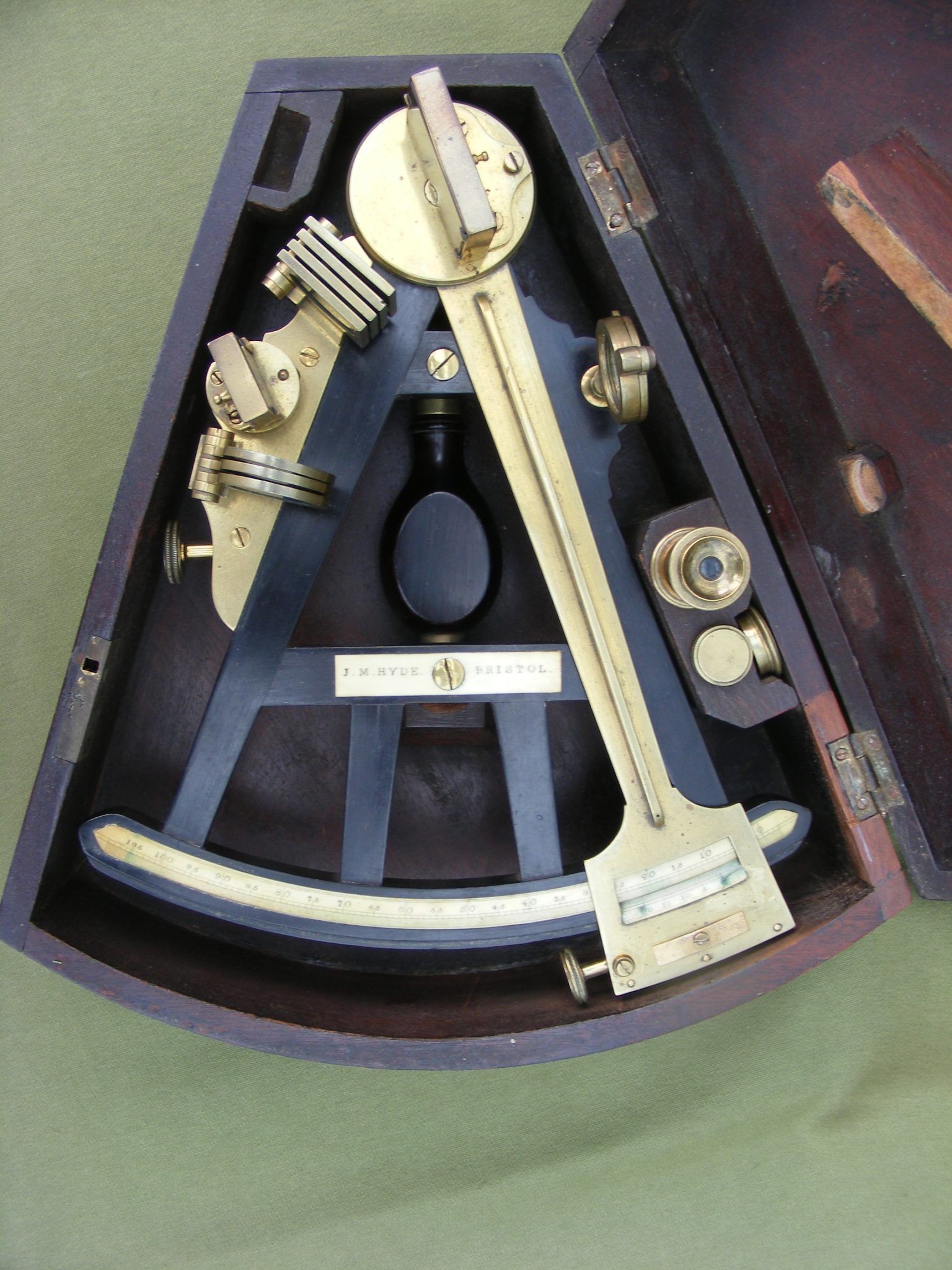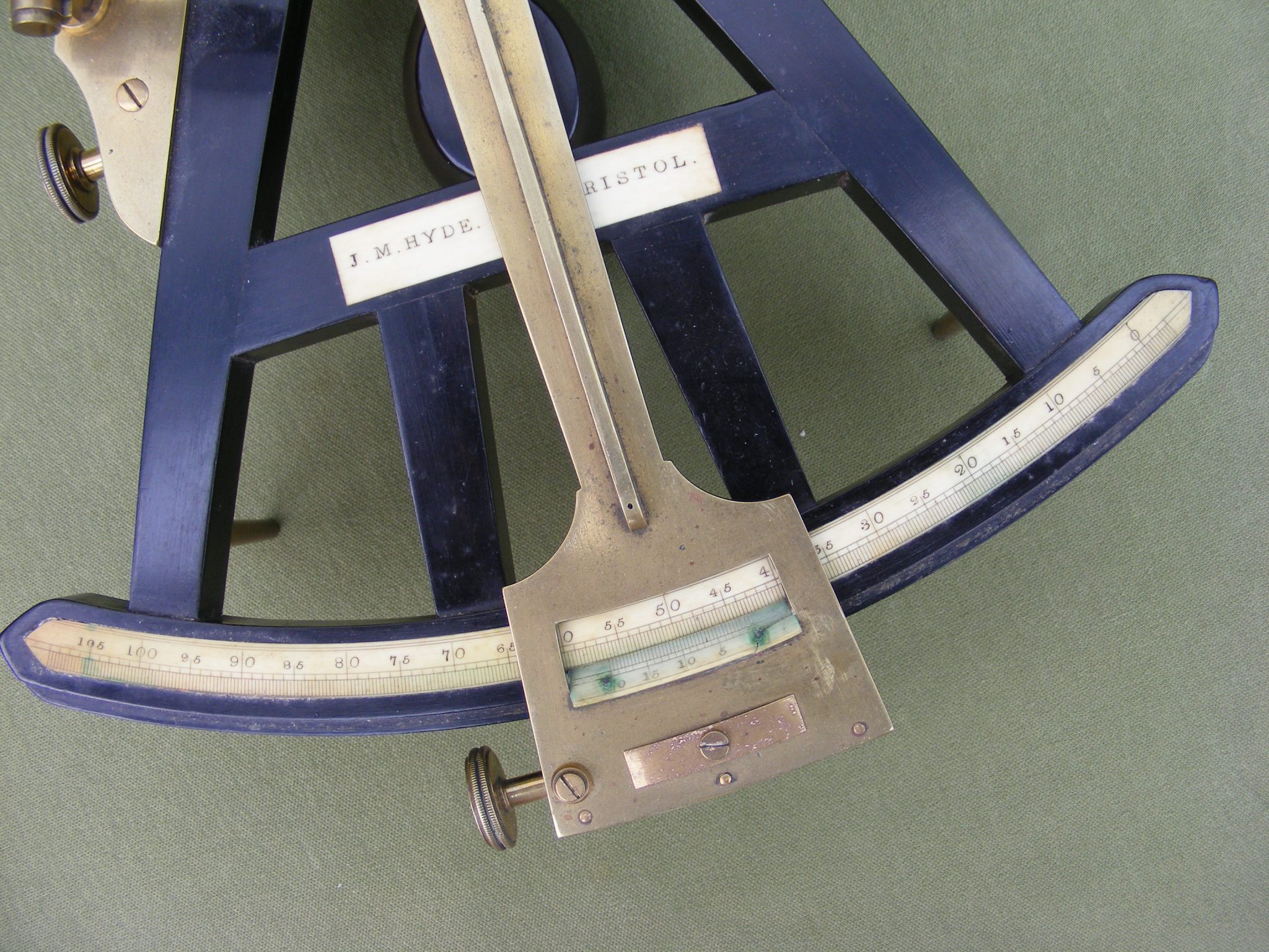 GOOD MID 19TH CENTURY OCTANT SIGNED: J M HYDE. BRISTOL. RADIUS 8.3/4" INCHES, SCALE MINUS 3 DEGREES TO 109 DEGREES DIVIDED IN 20' MINUTE DIVISIONS, VERNIER READING TO 1' MINUTE OF ARC. COMES WITH ERECTING TELESCOPE, FILTER CAP & ADJUSTING KEY IN ORIGINAL MAHOGANY KEYSTONE BOX ( SMALL REPAIR ) JOHN MOOR HYDE.