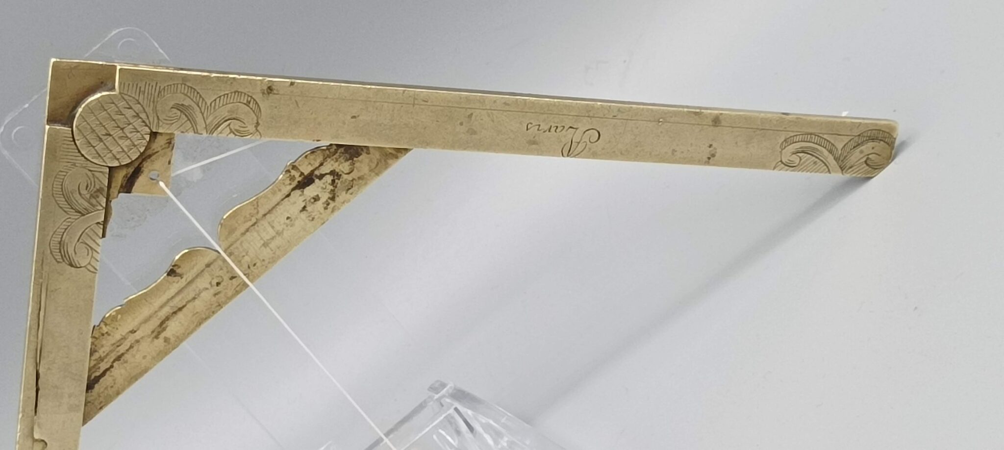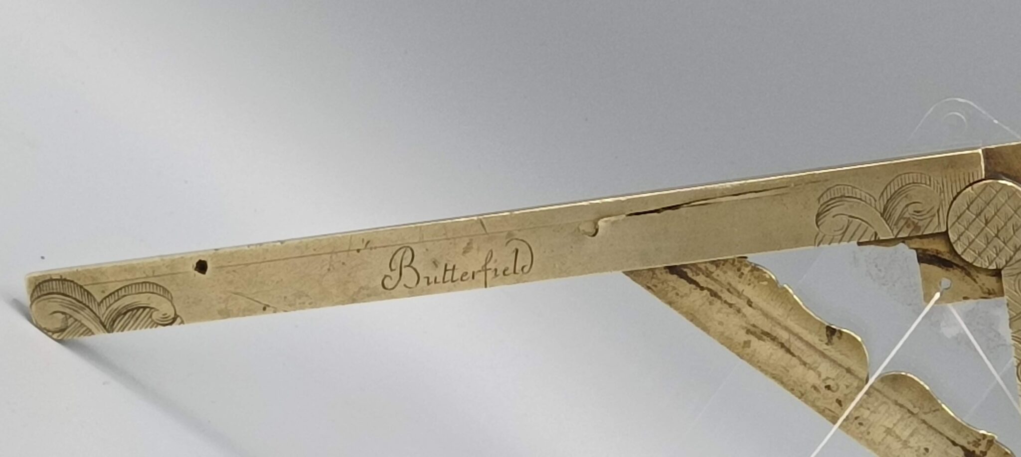 A 18×2.5cm (7 1/16/” x 1”) close folding brass “Pied de Roy” with decoratively shaped joint element, hand-graved “Butterfield AParis” and “Pied de Roy”.
