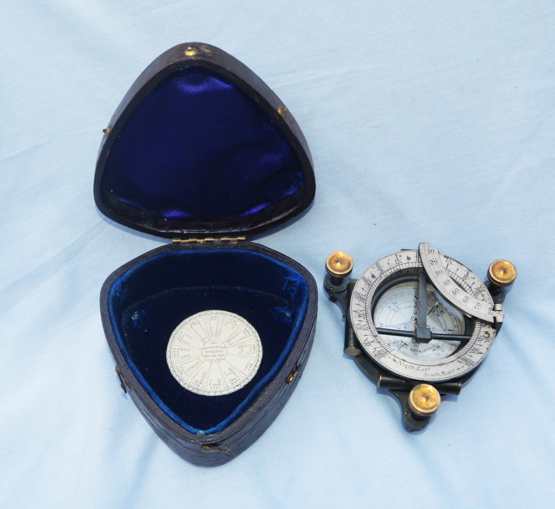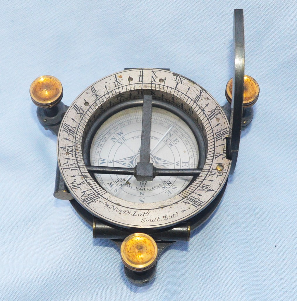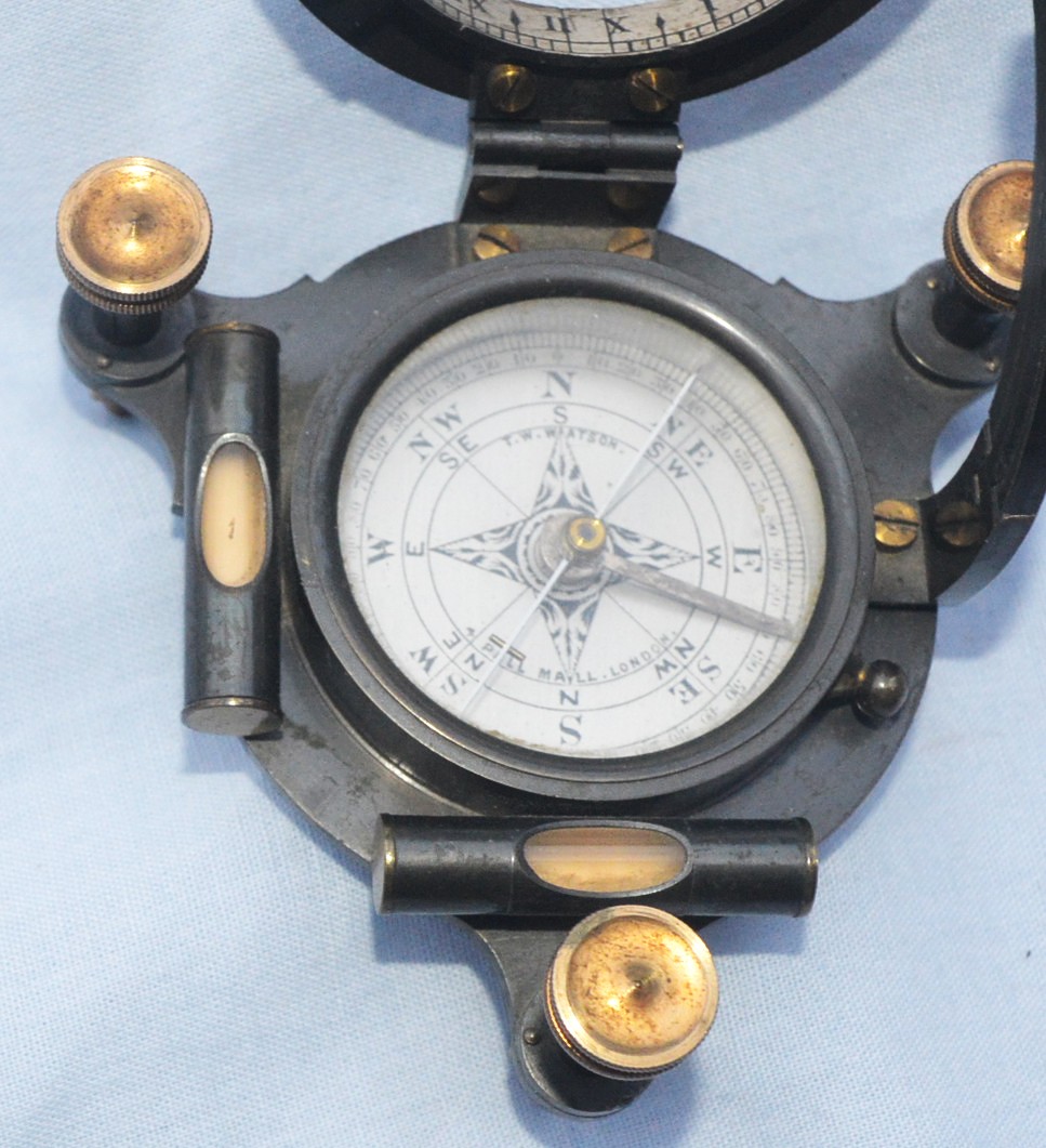The chapter ring measures 2.5″ ( 6.5 cm ) across, the dial is signed, \’T. B. Watson & Son, 4 Pall Mall,London’. With bubble levels and folding latitude and gnomon bars.There are three levelling screws. Contained in original moroccan case with almanac chart.