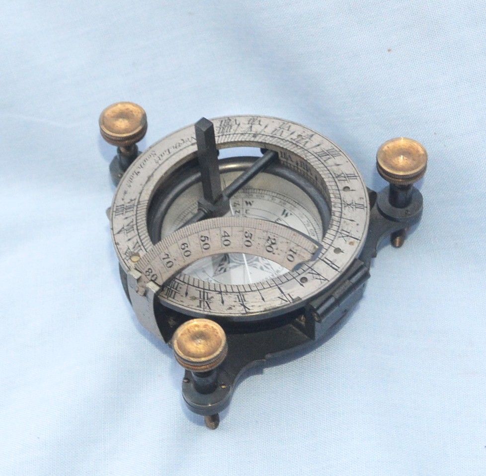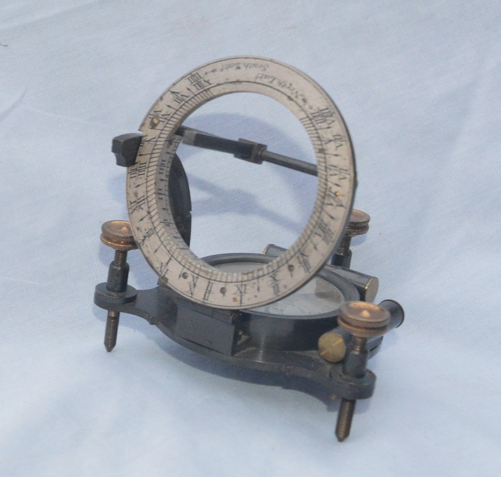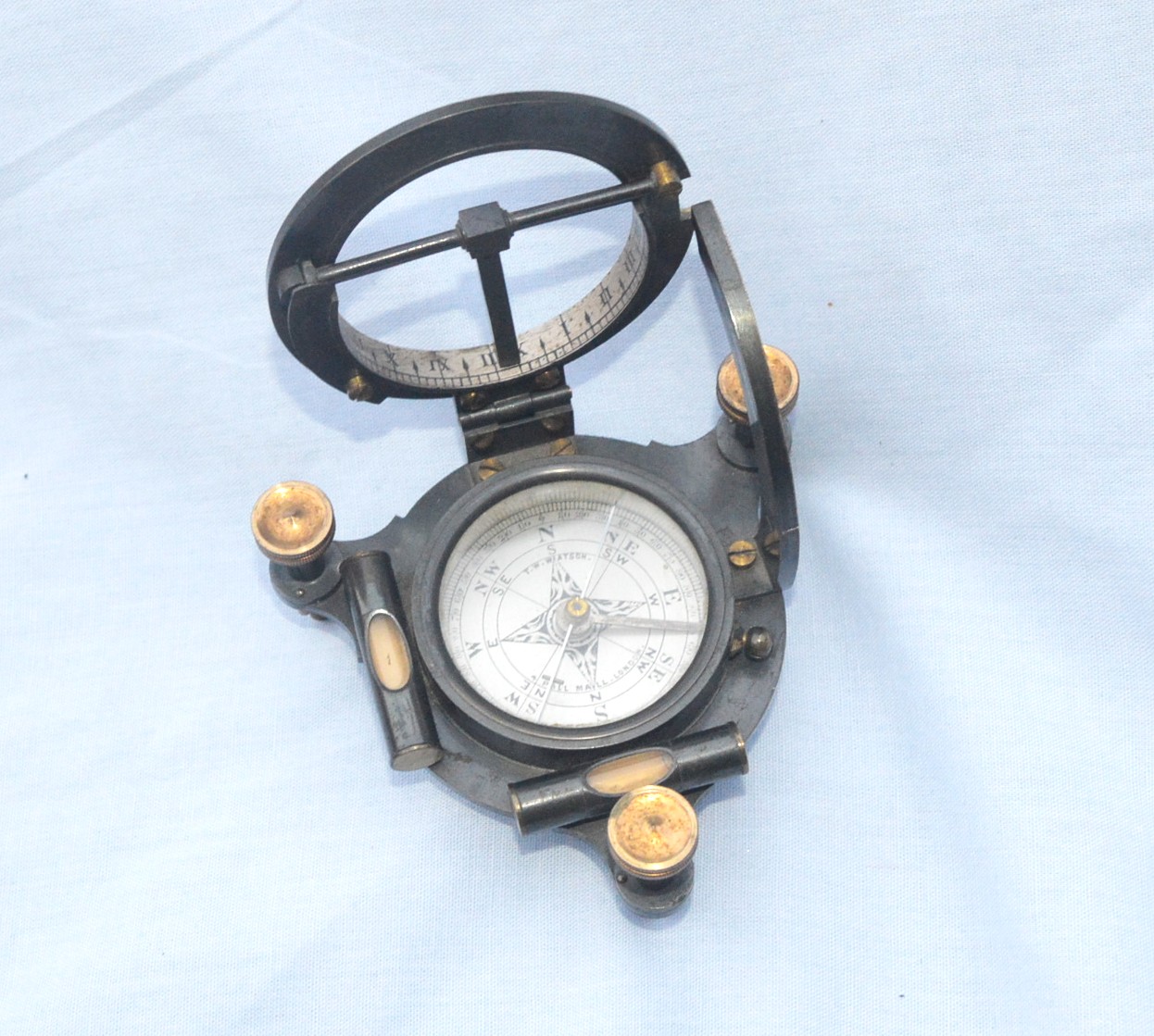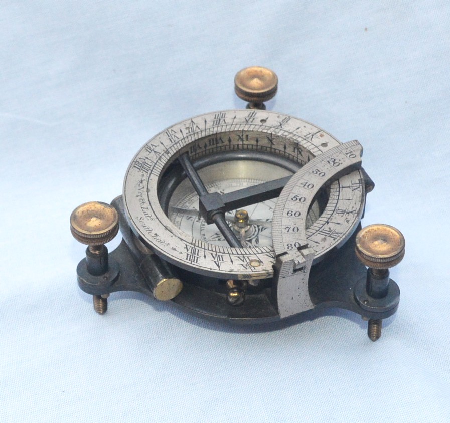 The chapter ring measures 2.5″ ( 6.5 cm ) across, the dial is signed, \’T. B. Watson & Son, 4 Pall Mall,London’. With bubble levels and folding latitude and gnomon bars.There are three levelling screws. Contained in original moroccan case with almanac chart.