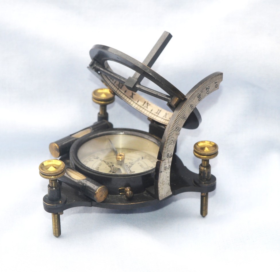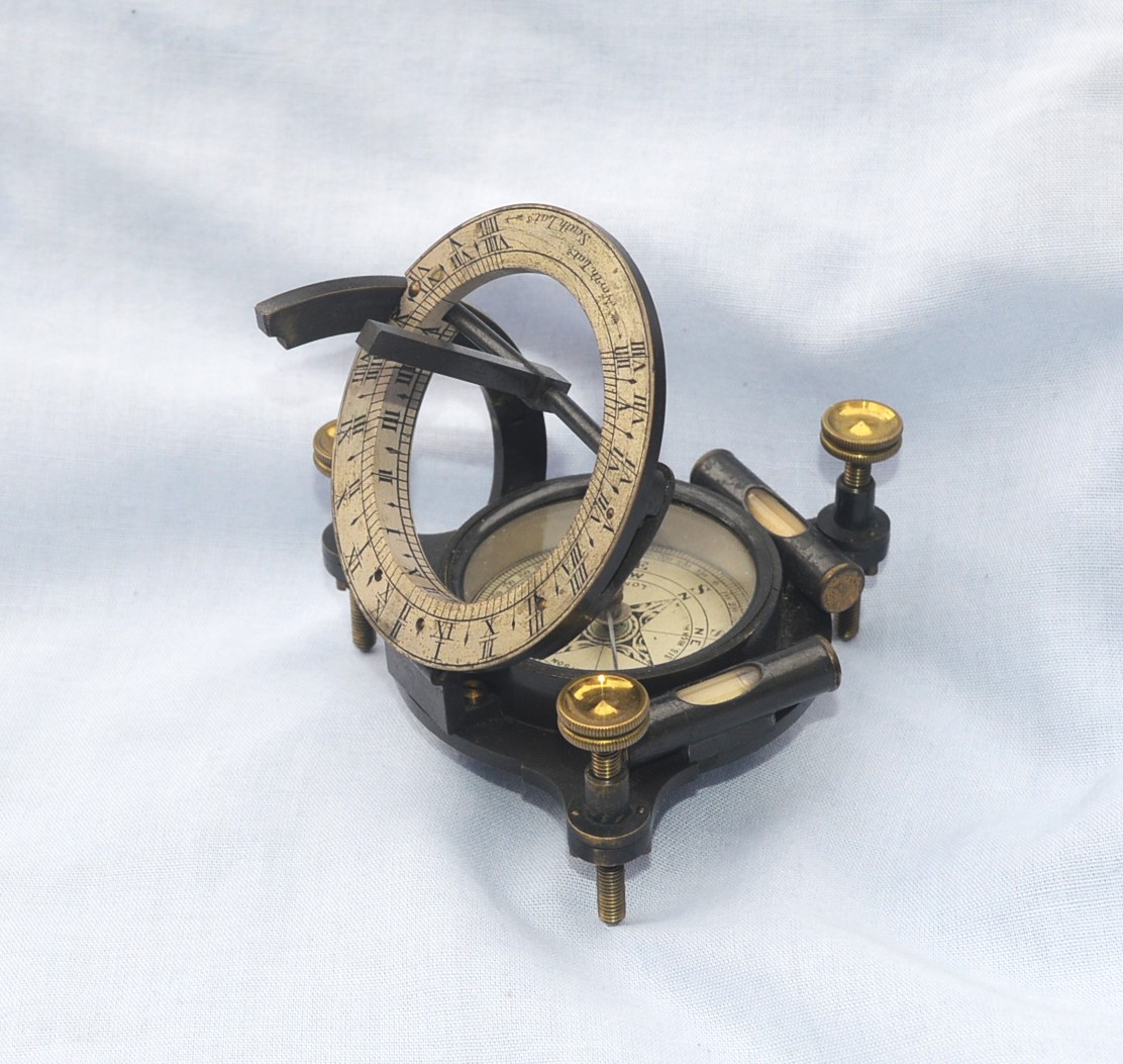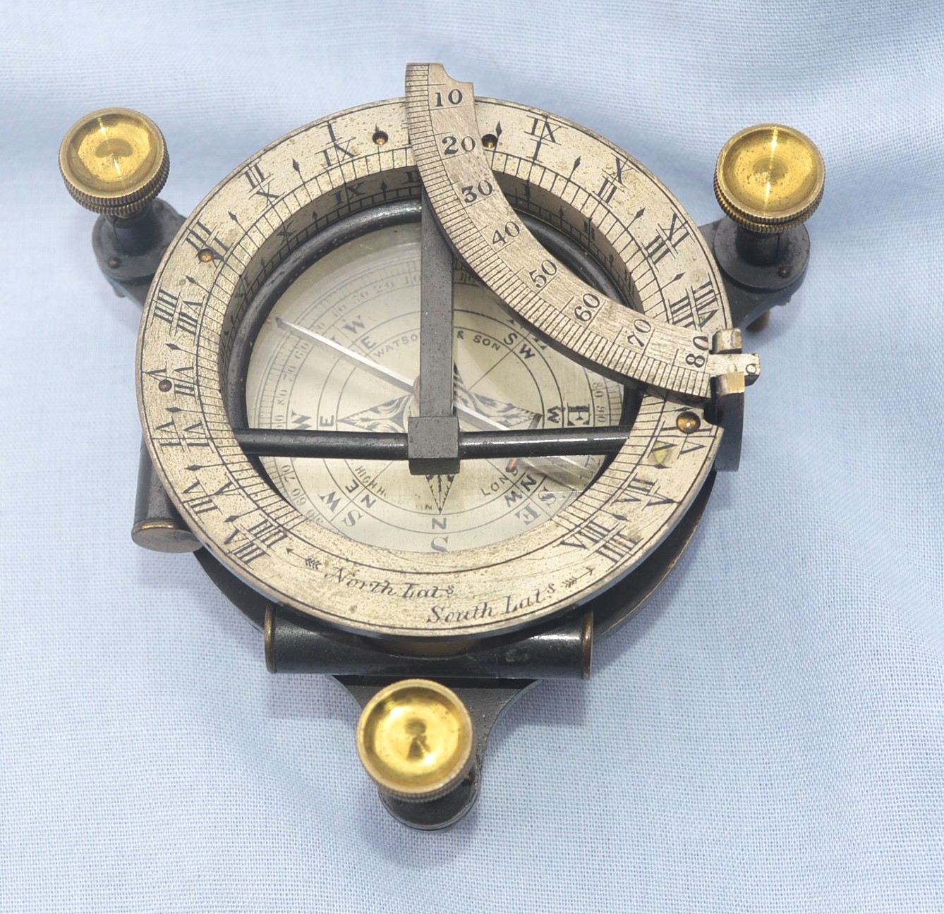 The chapter ring measures 2.5″ ( 6.5 cm ) across, the dial is signed, ‘Watson & Son. 318 High Holborn, London’. With bubble levels folding latitude and gnomon bars and three levelling screws. Contained in original moroccan case with almanac chart.