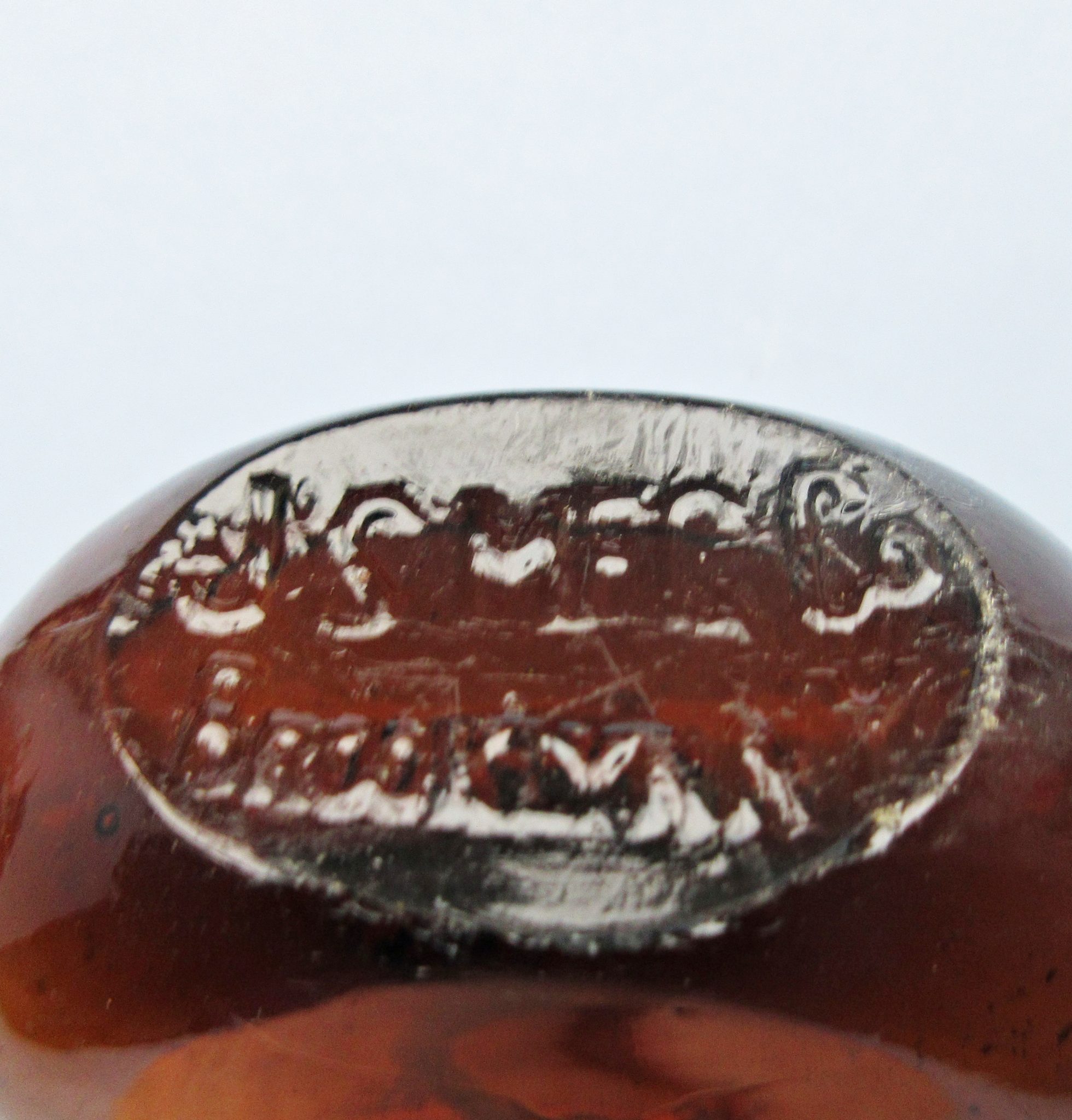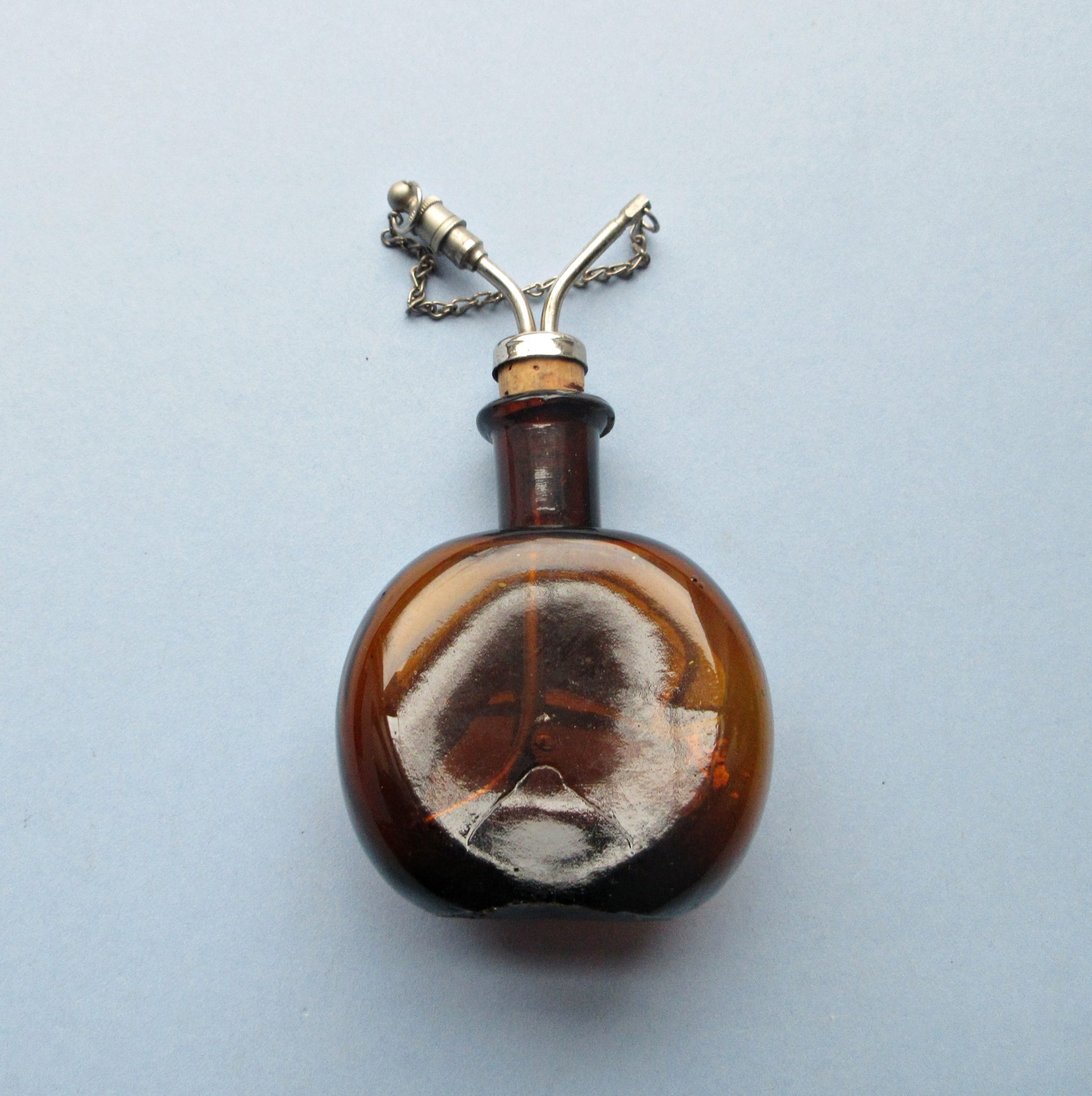 An Esmarche anesthesia dripping bottle.Friedrich von Esmarch (1823-1908) introduced his dripping bottle in 1877 and it remained in use through WW1 and even a bit later. Esmarch dripping bottles, when they turn up today, have often lost their chain and stopper, both of which are present here. The bottle shows no evidence of use and is free of cracks, chips, etc. This is the first Esmarch bottle we have encountered that was made in the USA. In fact, it the first Esmarch bottle we’ve seen where the maker is indicated in the molding: “JS MANUFACTURING COMPANY, BROOKLYN, NY”. We have not been able to locate any information about this company.