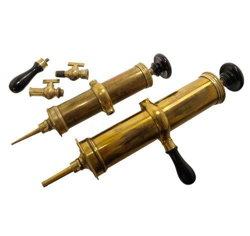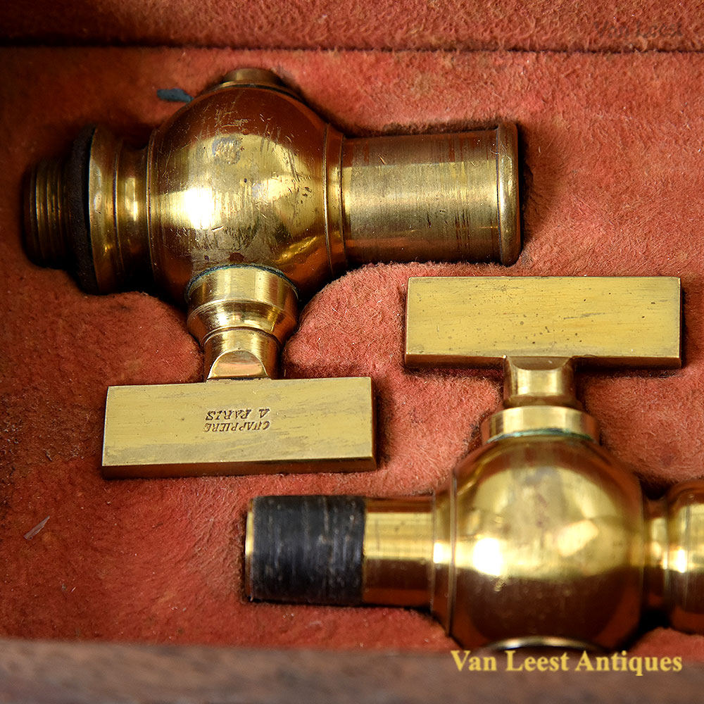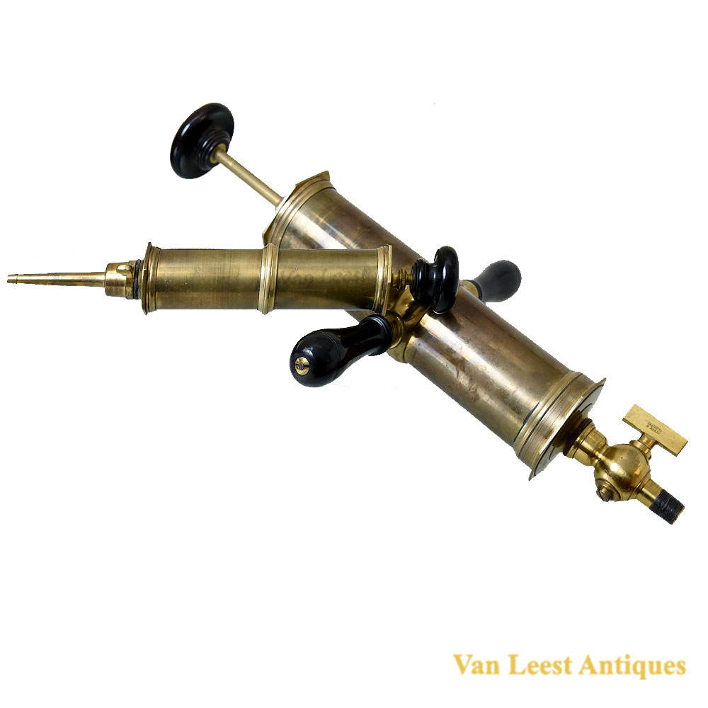 The box is composed of two large syringes, one with double reinforcement ebony handles and a smaller syringe with ebony handle, two taps and eight cannulas. Large syringes with double handles are rare, boxes with two syringes even more so.