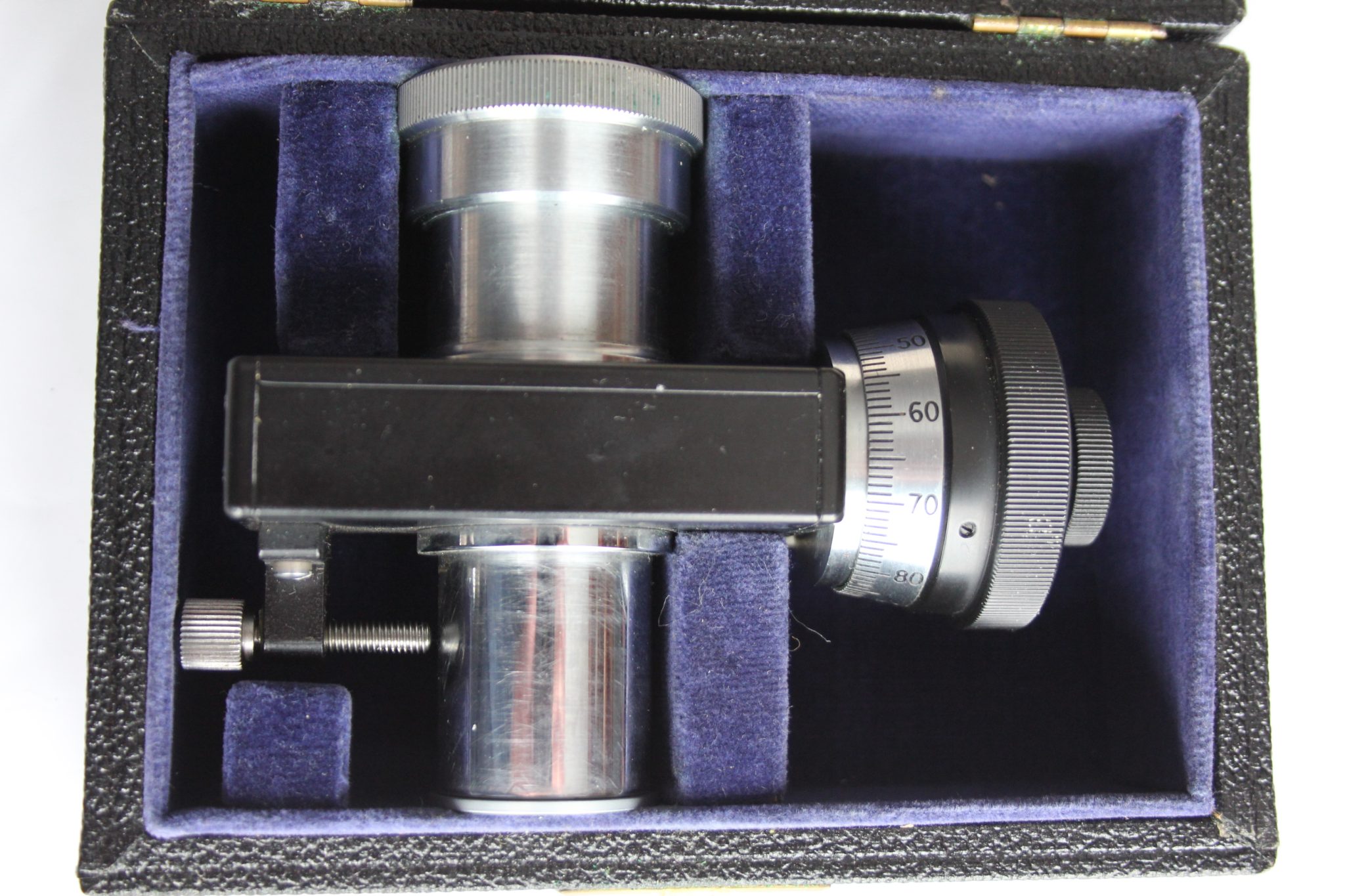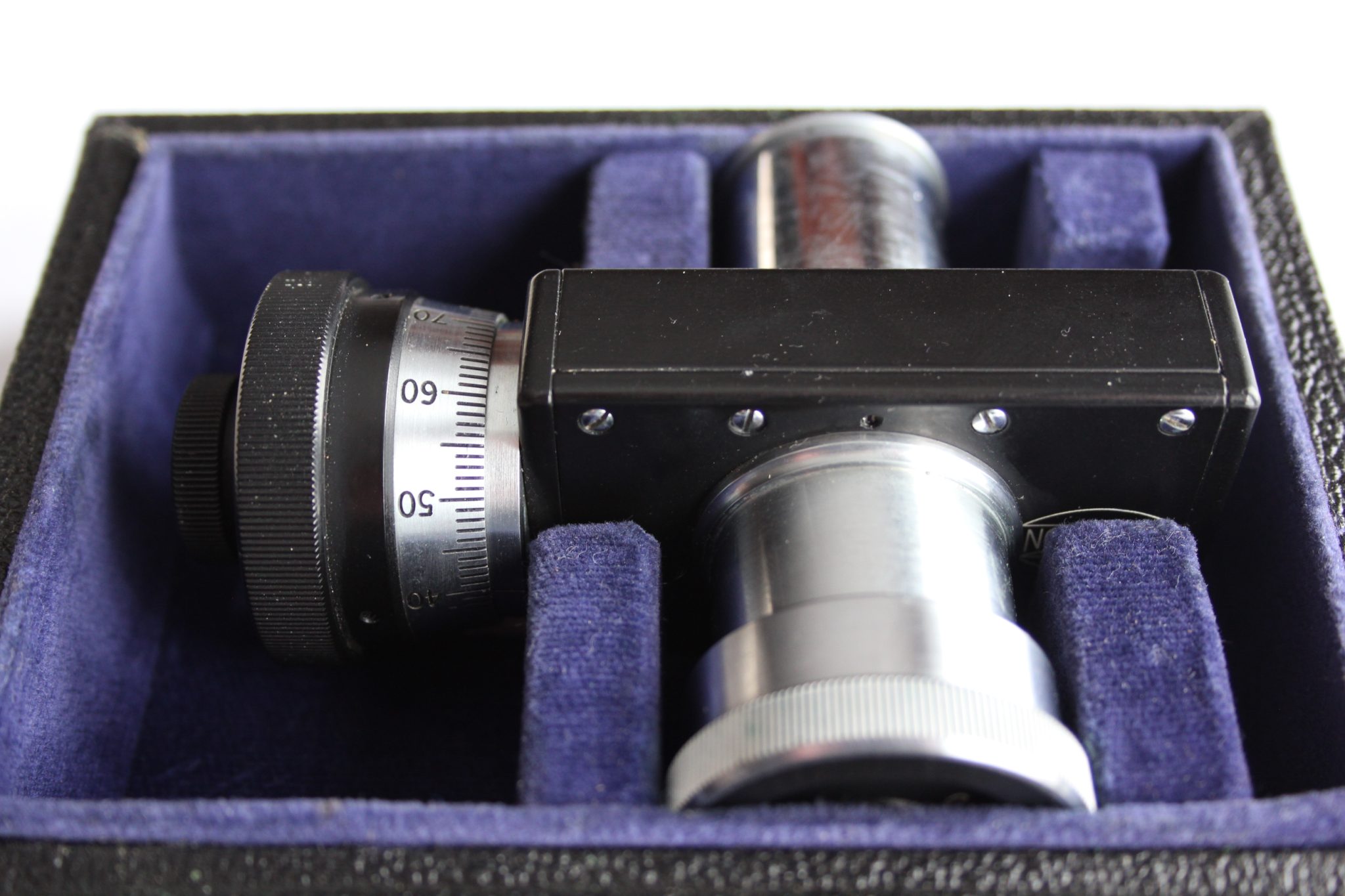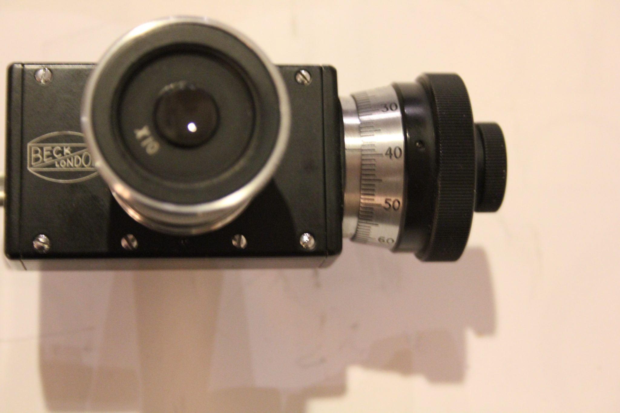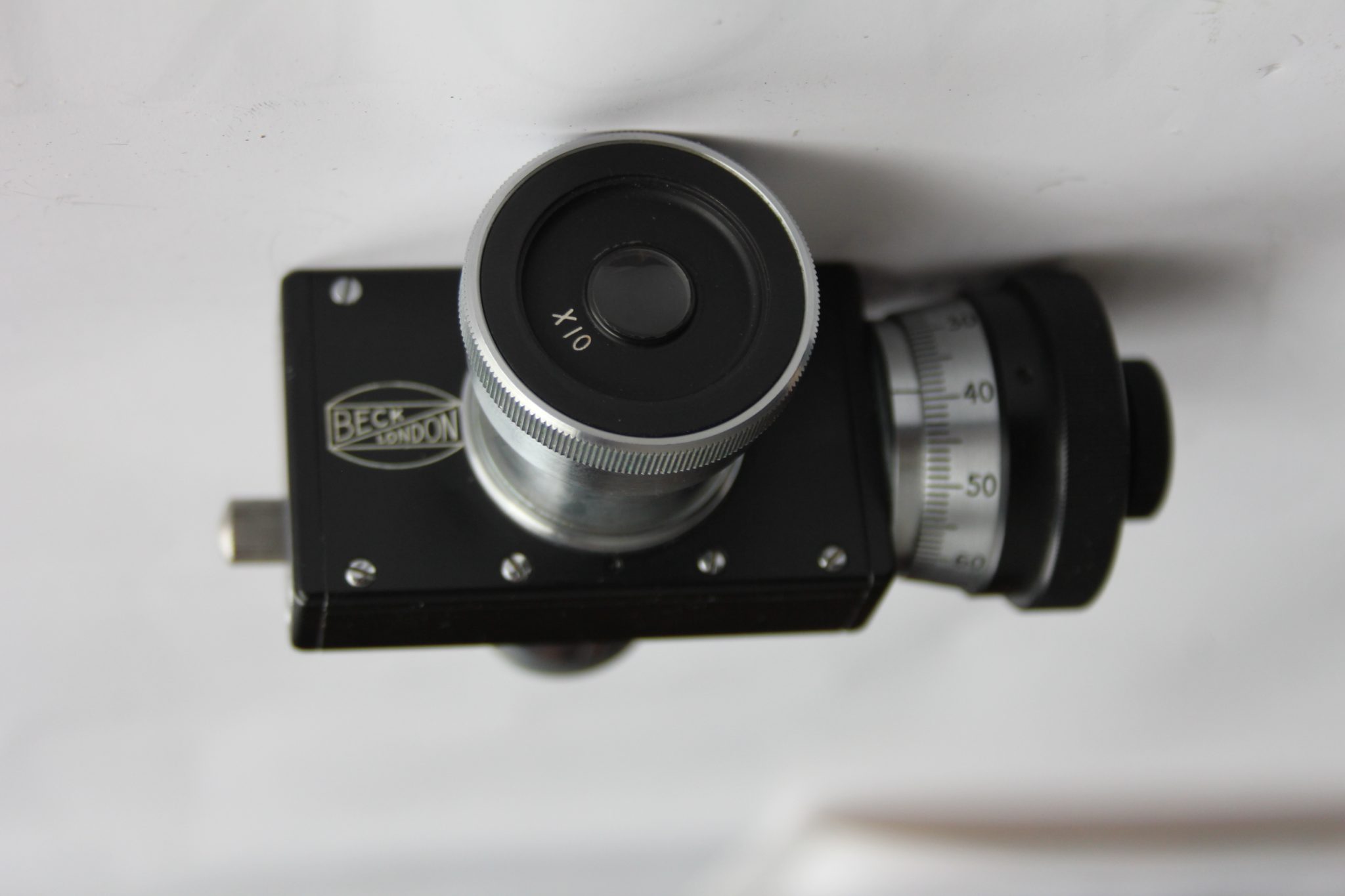 A fine and rarely used black and chrome filar micrometer eyepiece for a 1950’s Beck microscope. 23 mm. diameter body tube, rectangular head stock, large micrometer smoothly controlling horizontal movement to a finely divided filar glass (one division=0.225 micrometers). Eyepiece marked 10X, head stocked branded Beck, London. No screws out of place. Black card case with purple velvet and silk liner measuring 5 x 3 x 1 3/4 inches.