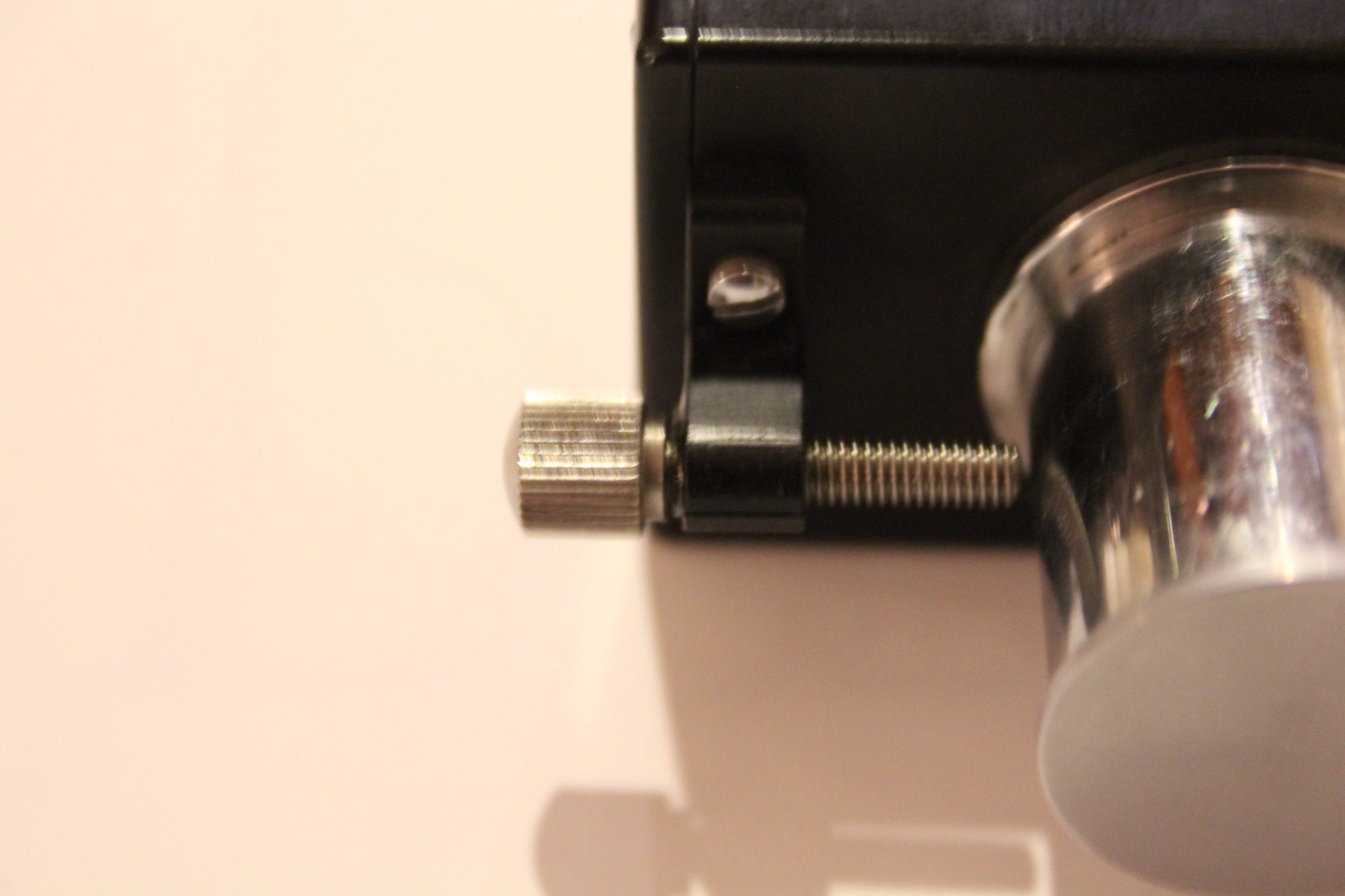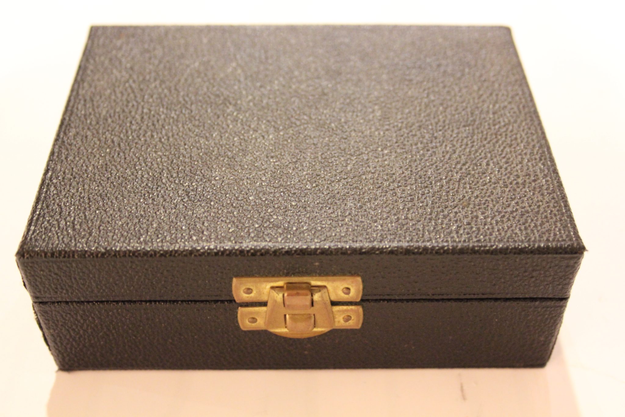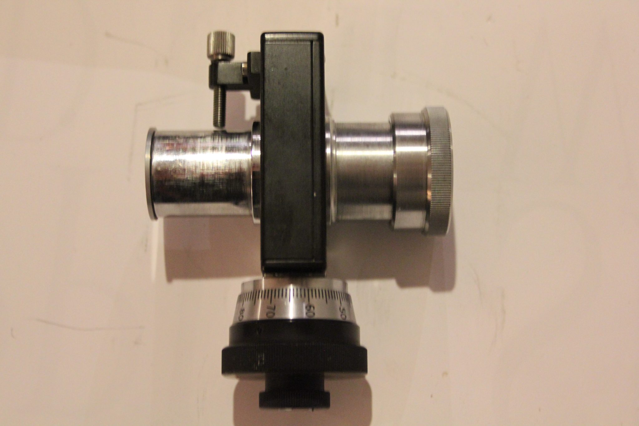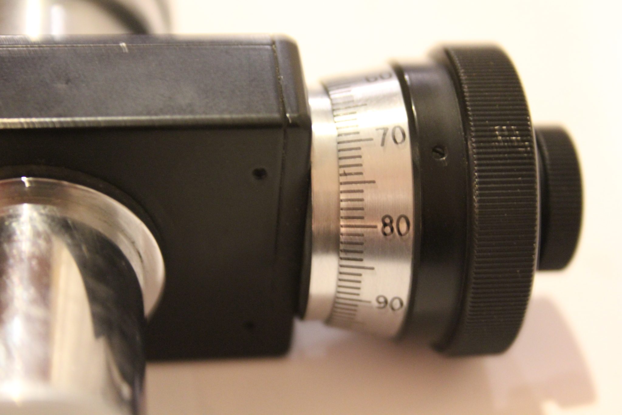 A fine and rarely used black and chrome filar micrometer eyepiece for a 1950’s Beck microscope. 23 mm. diameter body tube, rectangular head stock, large micrometer smoothly controlling horizontal movement to a finely divided filar glass (one division=0.225 micrometers). Eyepiece marked 10X, head stocked branded Beck, London. No screws out of place. Black card case with purple velvet and silk liner measuring 5 x 3 x 1 3/4 inches.