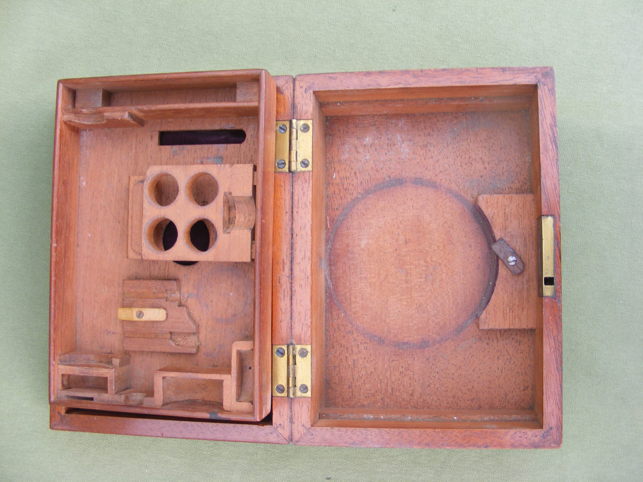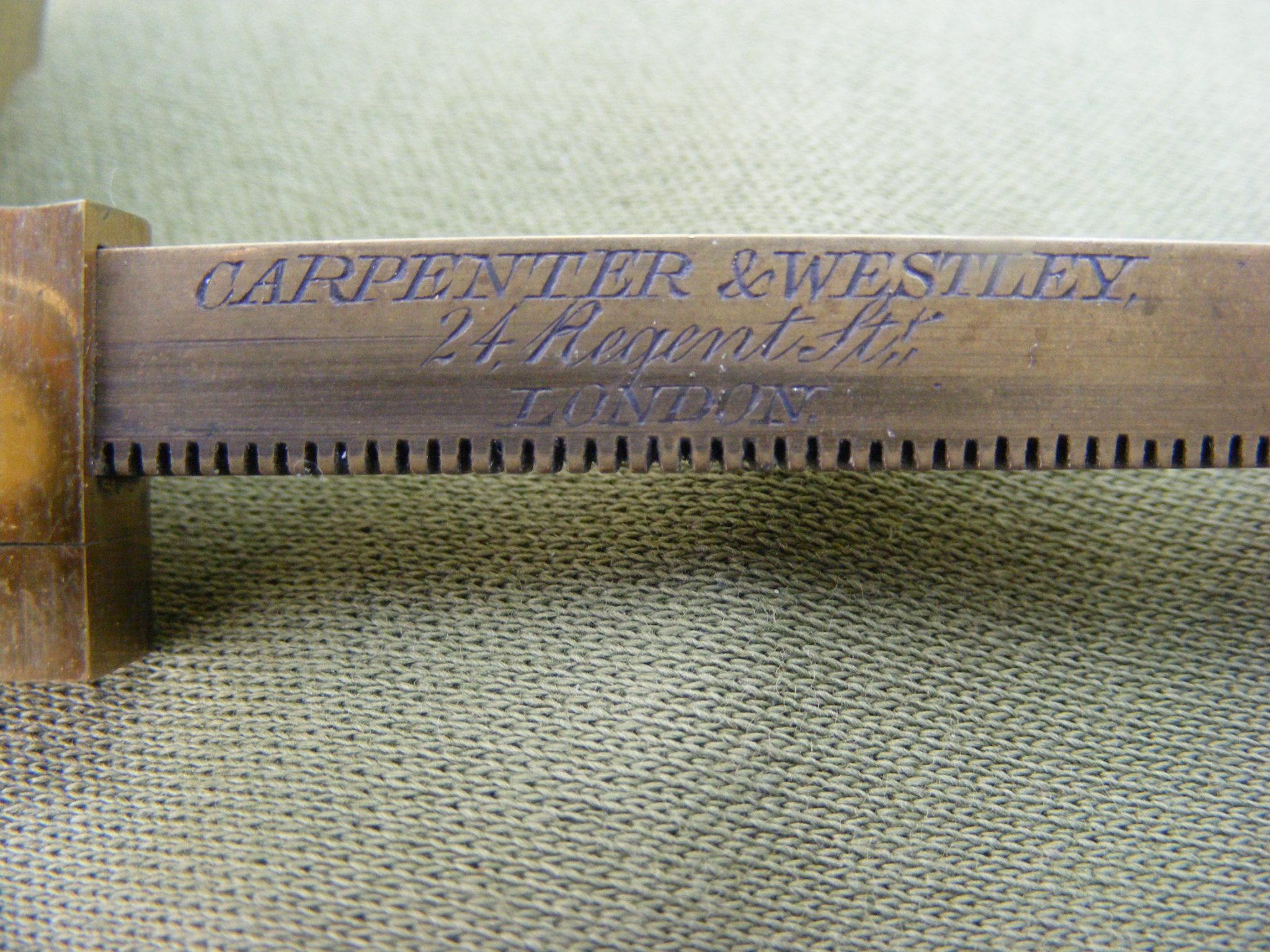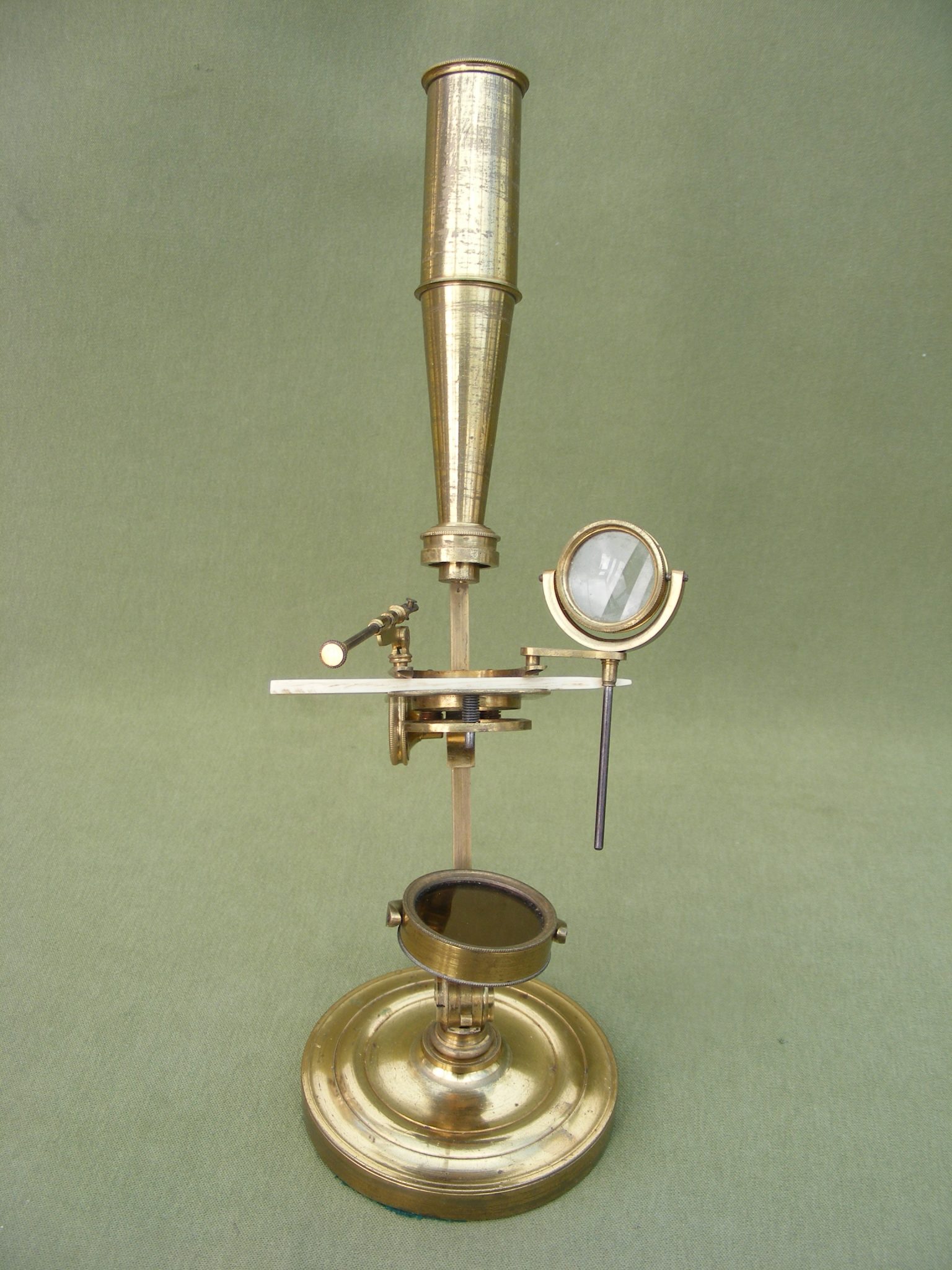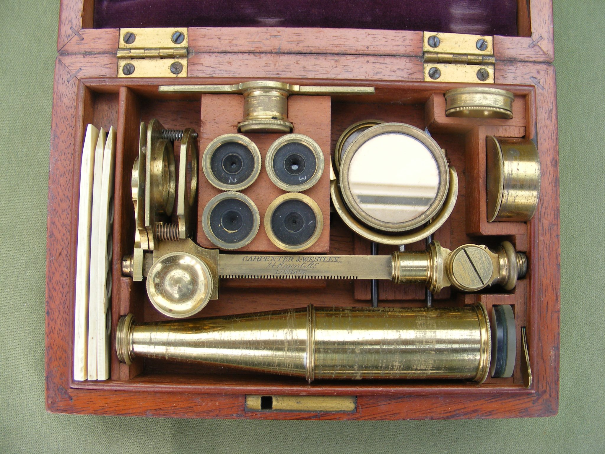 EXTREMELY GOOD CARY GOULD TYPE MICROSCOPE SIGNED: CARPENTER & WESTLEY. 24 REGENT ST. LONDON. IN A BEAUTIFUL MAHOGANY CASKET WITH A COMPLETE SET OF ACCESSORIES, SIGNED ON THE RACK WITH COMPASS JOINT & DOUBLE SIDED MIRROR ALL RAISED ON 3.1/2" INCH DIAMETER BRASS WEIGHTED BASE. COMPRISING OF: 4 OBJECTIVES NUMBERED 0,1, 2 & 3 PLUS A LIEBERKUHN OBJECTIVE IN IT'S BRASS DRUM CASE, RARE MICROMETER LIVE BOX, 100TH OF 1" GRID FORM, STAGE FORCEPS, STAGE BULL'S-EYE CONDENSER, LIVE BOX, BLACK & WHITE DISC, WATCH GLASS, GLASS DISC, TWEEZERS & 3 BONE SLIDERS. BOX 7" x 5" x 2.3/4" INCHES
