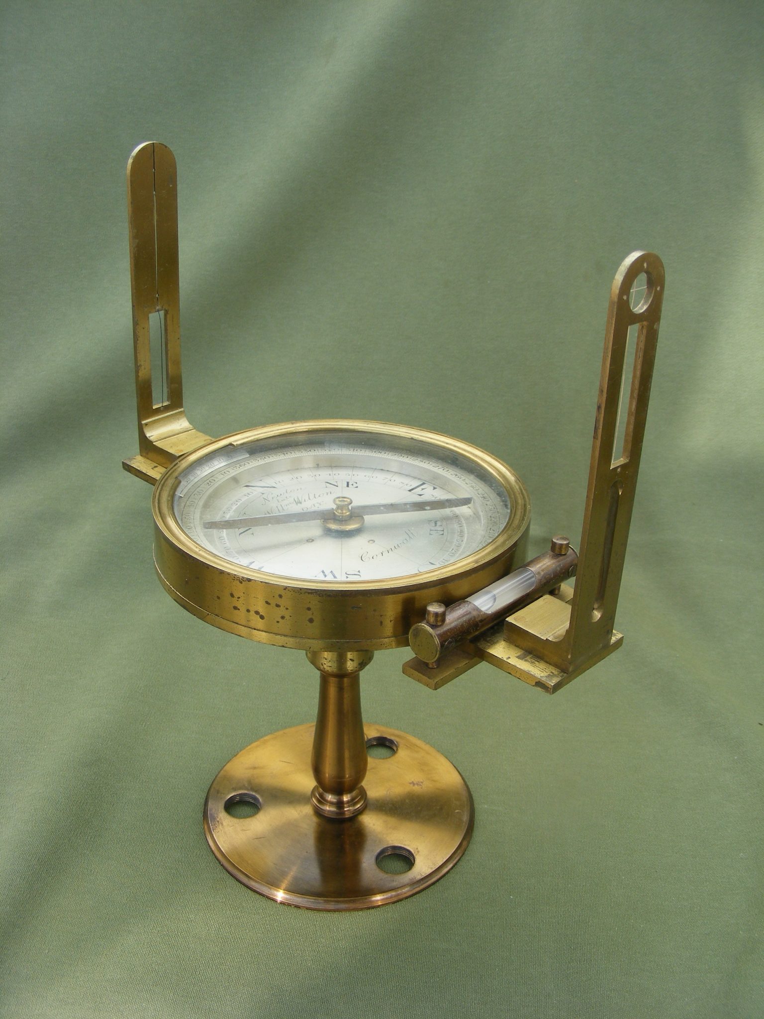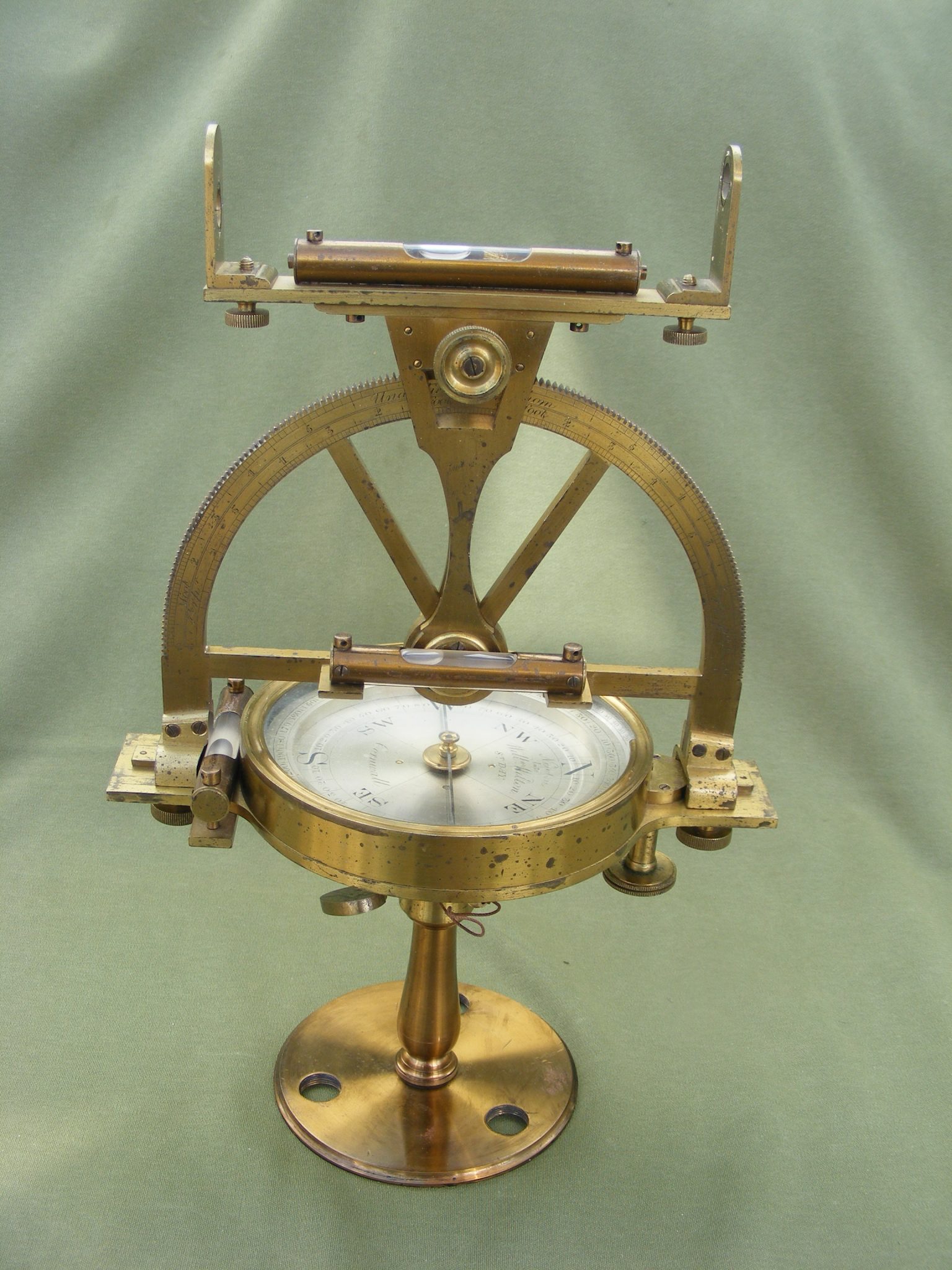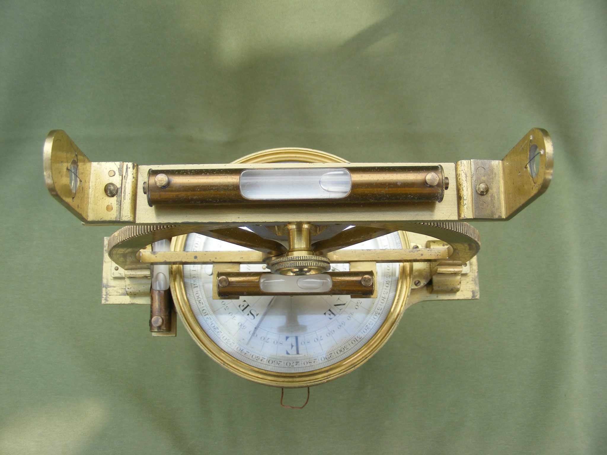 ( NEWTON PRE CROSS ST. CAMBORNE ) CAN BE USED AS CONVENTIONAL MINING DIAL WITH THE TALL SIGHTS OR THEODOLITE USE WITH THE INVERTED HALF CIRCLE WITH SHORT SIGHTS. SILVERED 5.1/4" INCH COMPASS BOX IS DIVIDED IN SINGLE DEGREES, VERNIER READING TO 2 MINUTES OF ARC. THE HALF CIRCLE DIVIDED IN 30' MINUTE DIVISIONS, VERNIER TO 1 MINUTE OF ARC. ORIGINAL MAHOGANY BOX 9.1/2" x 9.3/8" x 5" INCHES.