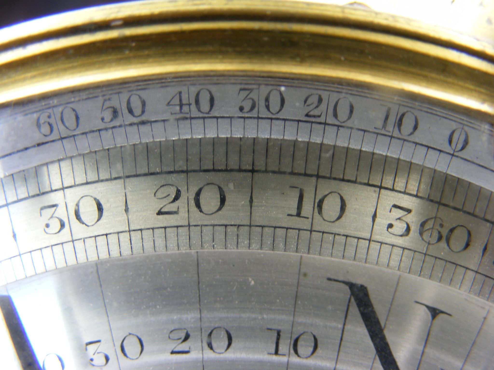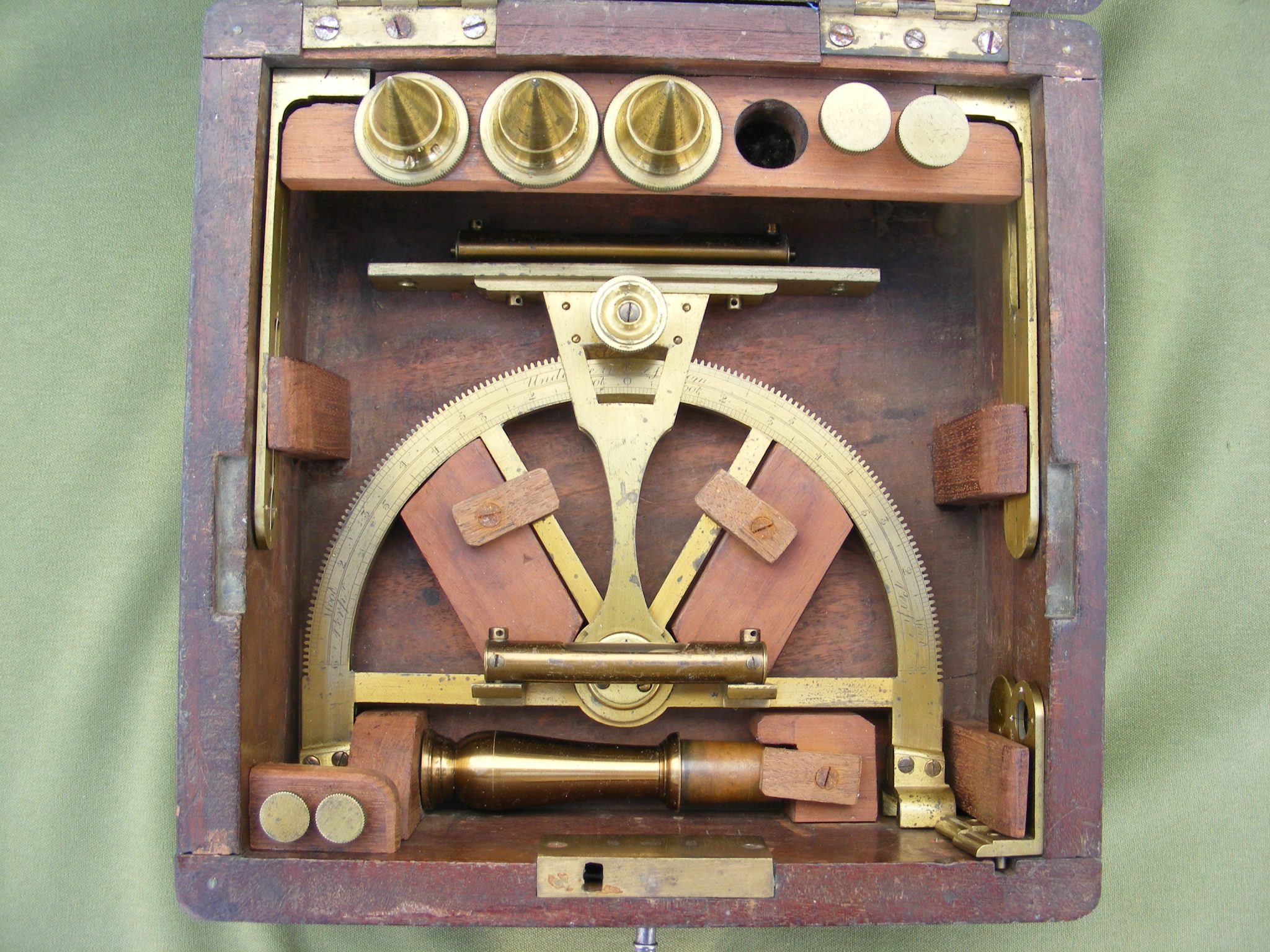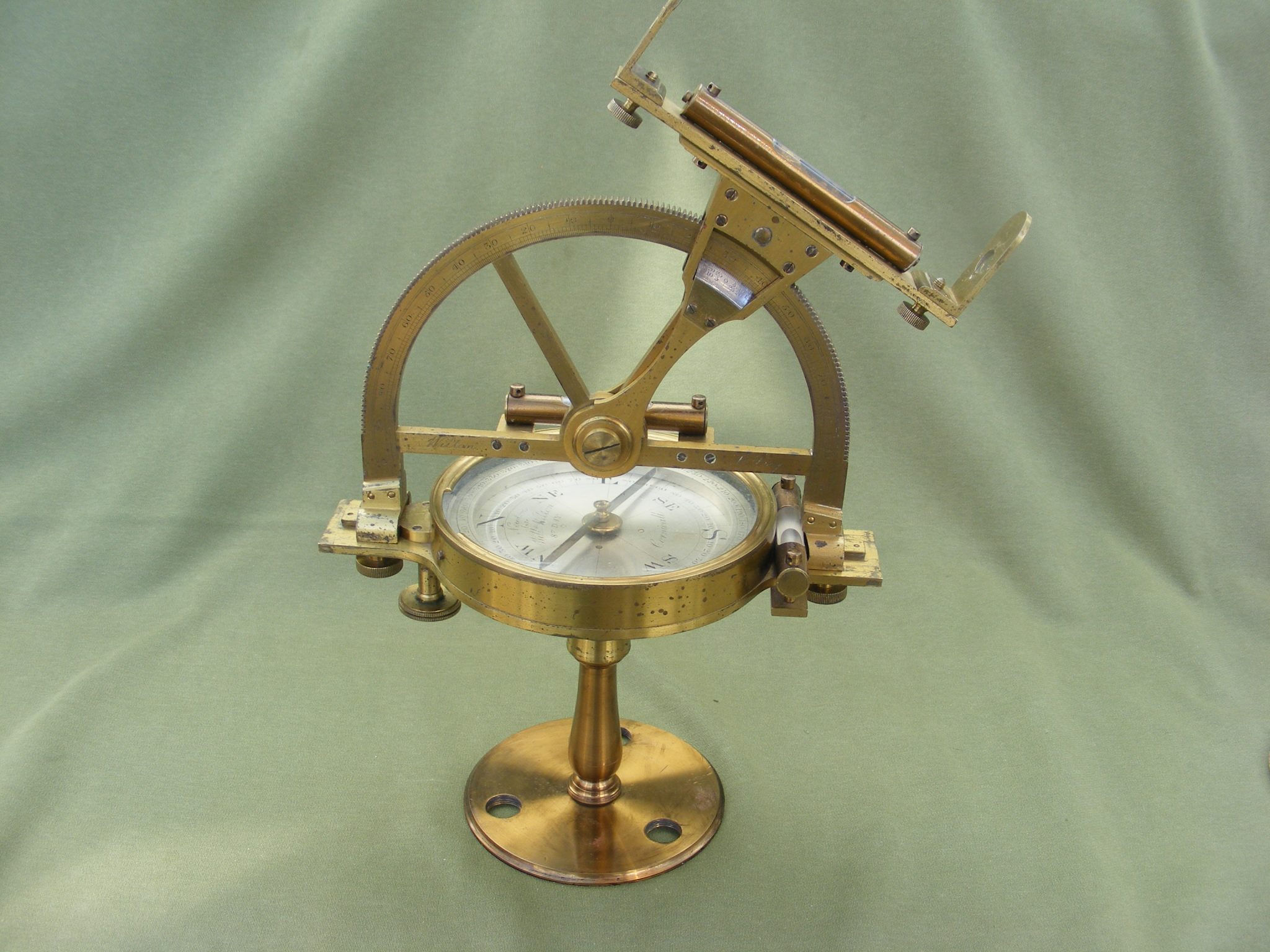 ( NEWTON PRE CROSS ST. CAMBORNE ) CAN BE USED AS CONVENTIONAL MINING DIAL WITH THE TALL SIGHTS OR THEODOLITE USE WITH THE INVERTED HALF CIRCLE WITH SHORT SIGHTS. SILVERED 5.1/4" INCH COMPASS BOX IS DIVIDED IN SINGLE DEGREES, VERNIER READING TO 2 MINUTES OF ARC. THE HALF CIRCLE DIVIDED IN 30' MINUTE DIVISIONS, VERNIER TO 1 MINUTE OF ARC. ORIGINAL MAHOGANY BOX 9.1/2" x 9.3/8" x 5" INCHES.