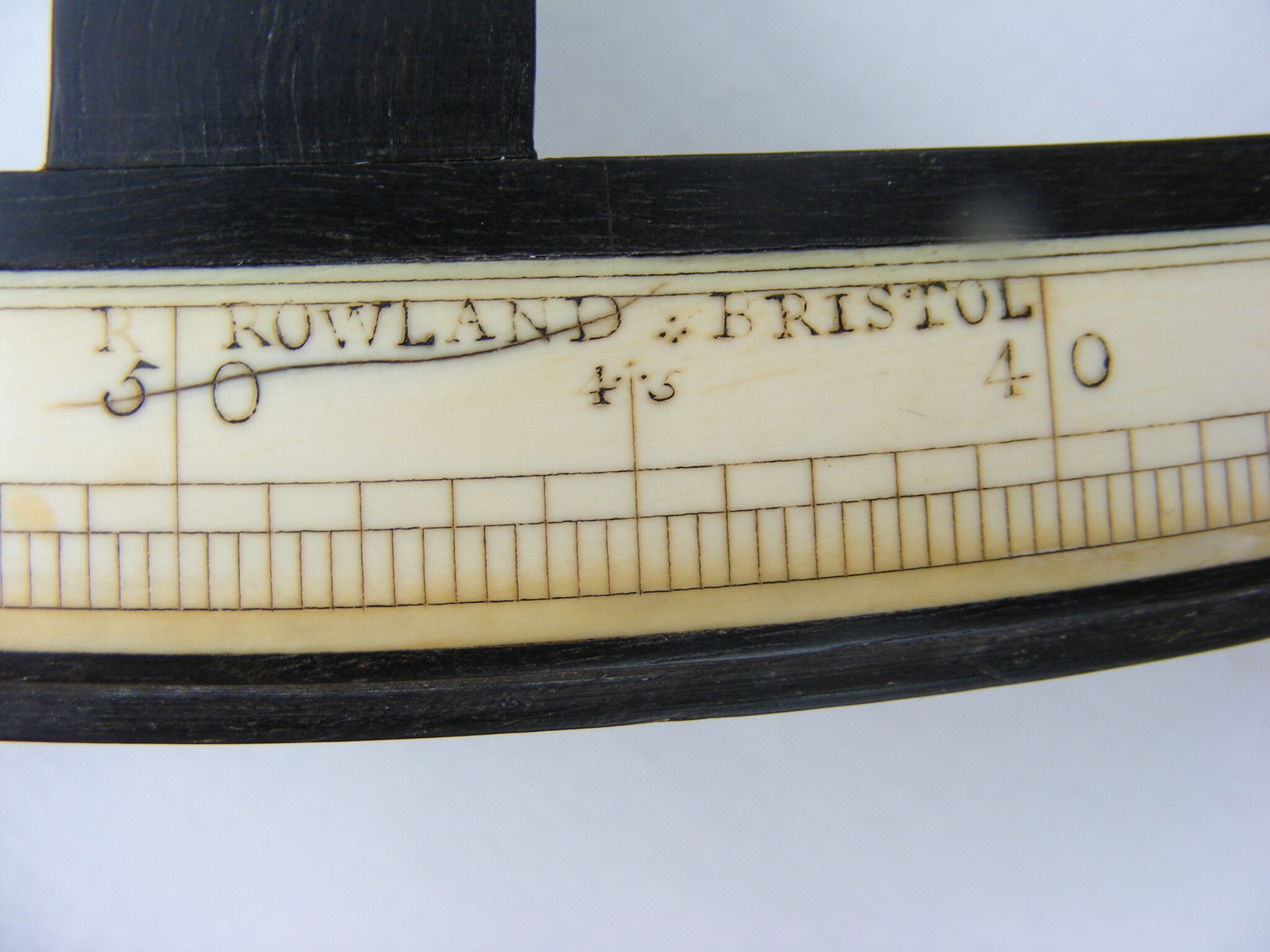 SCALE DIVIDED IN 20 MINUTE DIVISIONS, VERNIER READING TO 1 MINUTE OF ARC. MAIN SCALE MINUS 1 DEGREE TO 97 DEGREES. INDEX ARM 17″ INCHES, COLOURED FILTERS 2 RED 1 GREEN, RICHARD ROWLAND WAS AT THE QUAY, BRISTOL 1792-1811