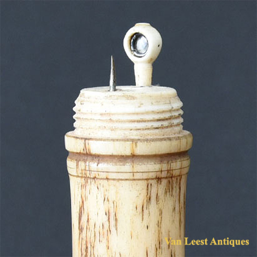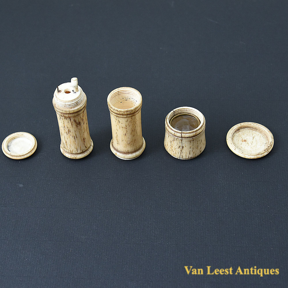 The first section of the body has a convex lens with a mounted fleaglass, which also acts as a diaphragm fleaglass. The small, high-power lens in the bone ring has a specimen pin at the correct focal distance. This section also has a magnifier function the second section has a concave lens and the last section has a convec lens. The bone and the lenses are in good condition, with only two very fine hairline crack. Length 13 cm.