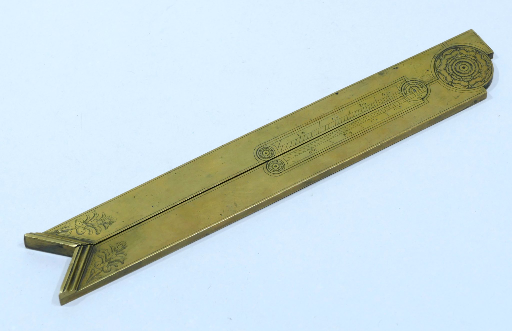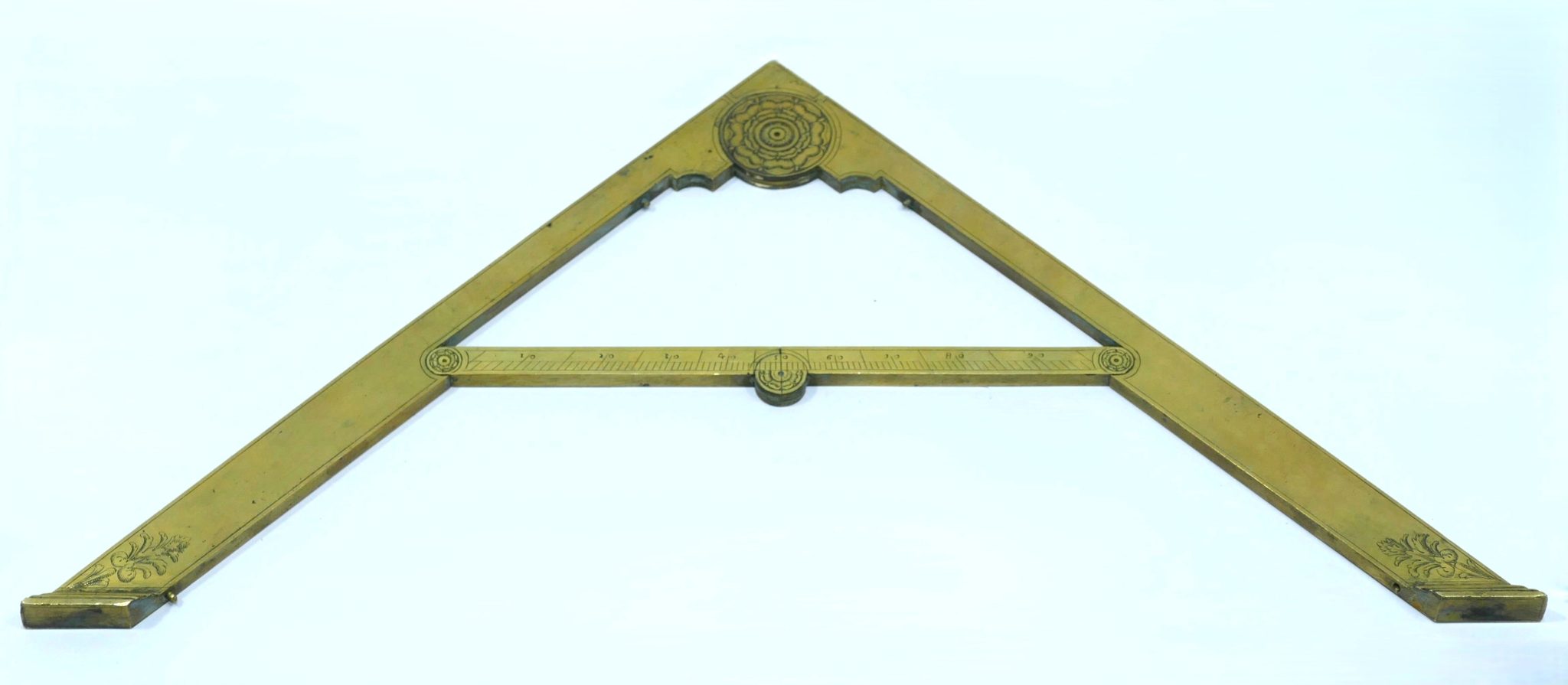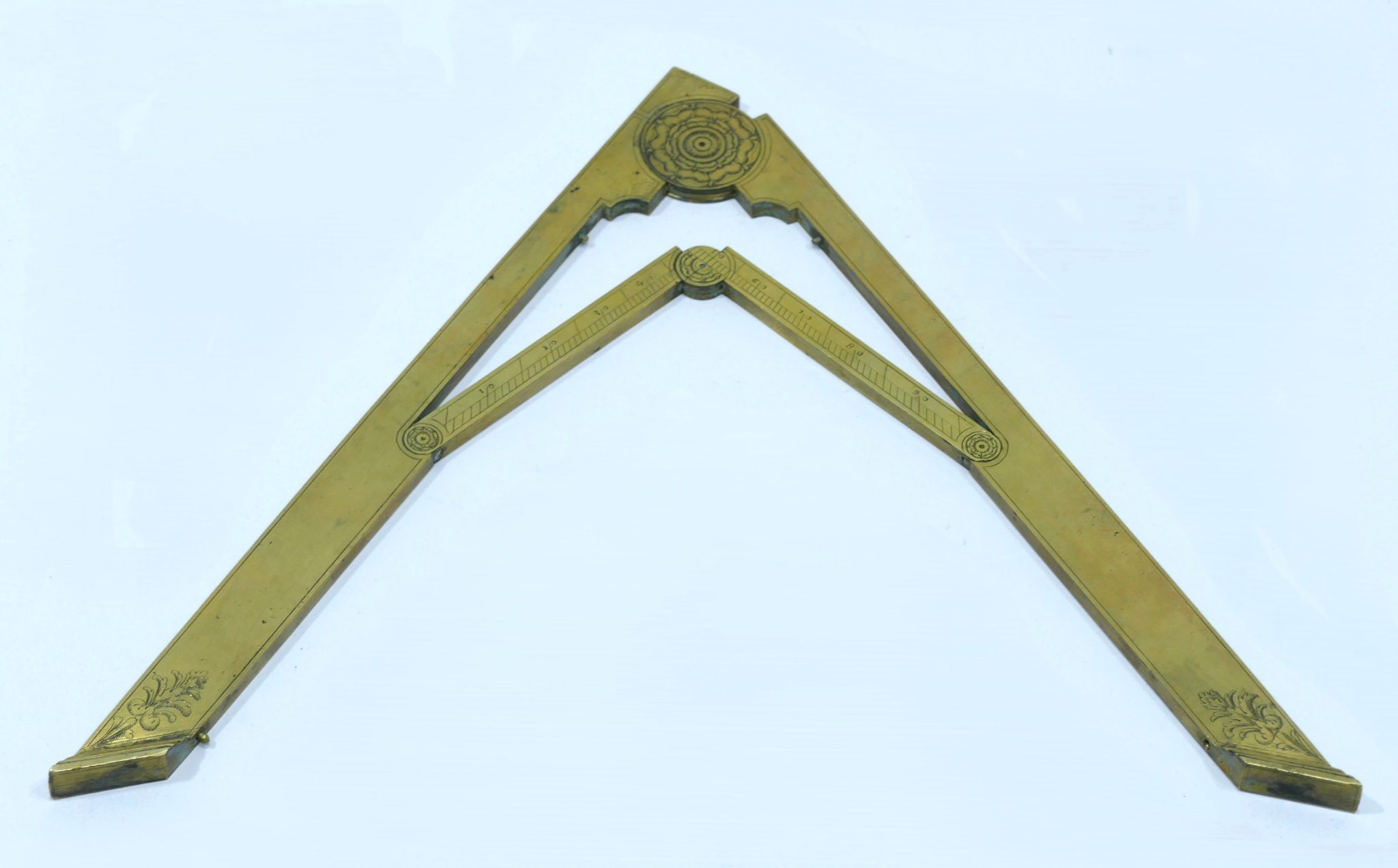 Inside these main arms are two small arms connected by a small hinge engraved with a rosace on both sides and a scale from 0
