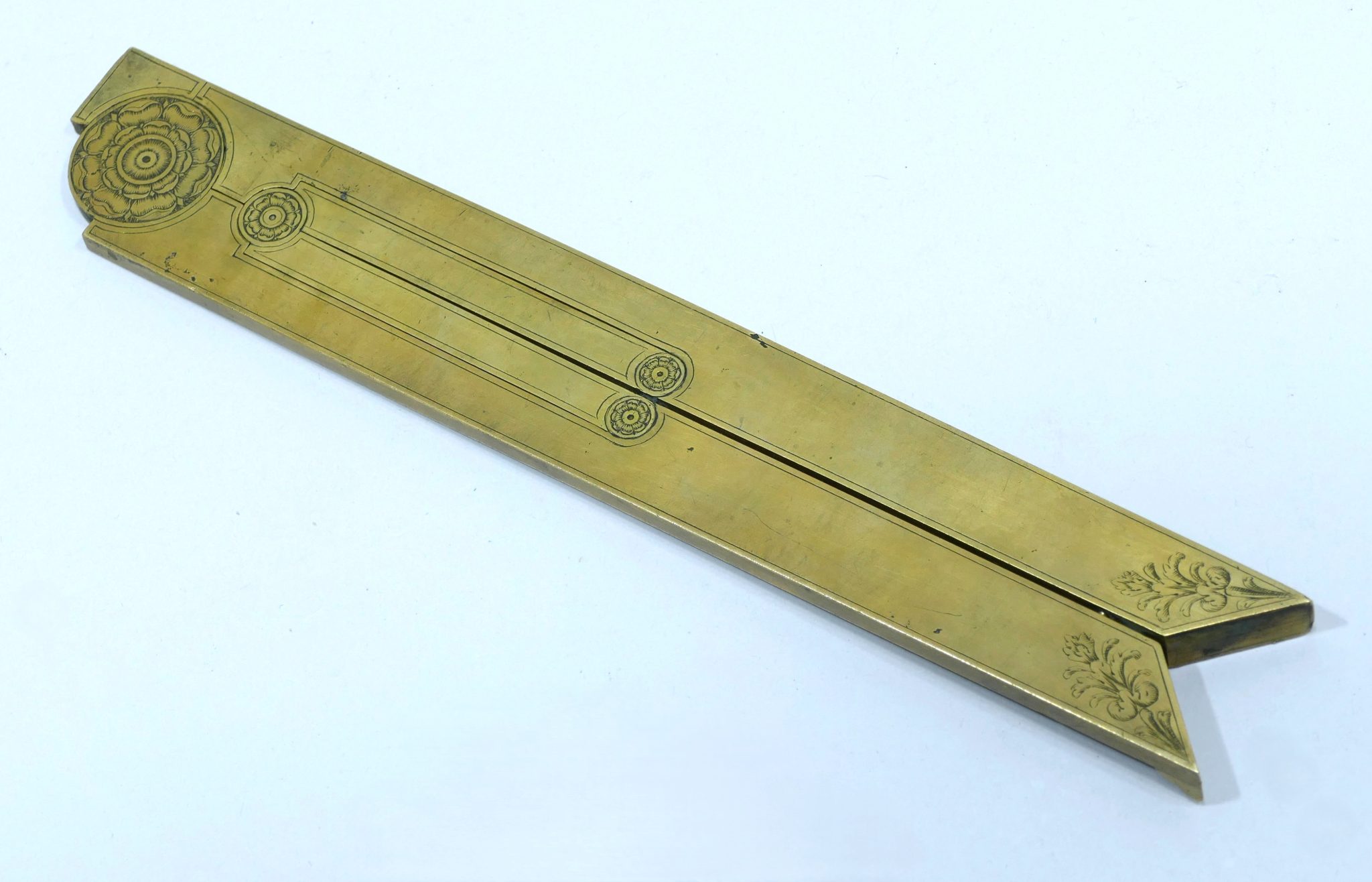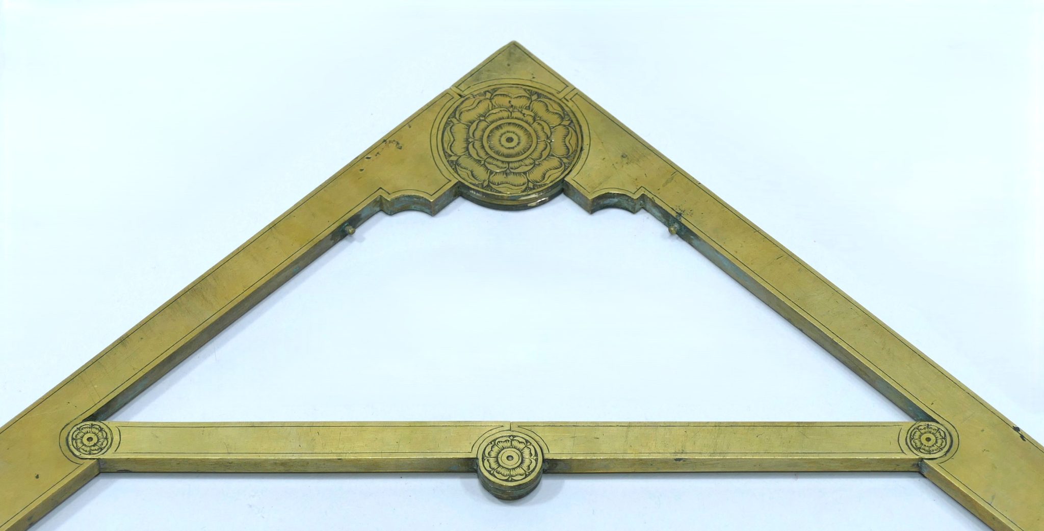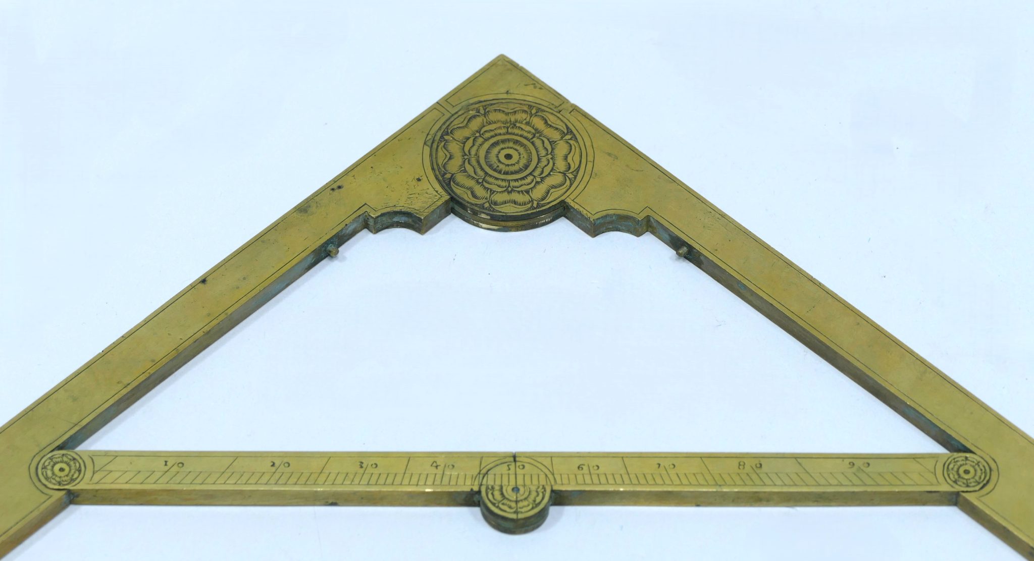 Inside these main arms are two small arms connected by a small hinge engraved with a rosace on both sides and a scale from 0