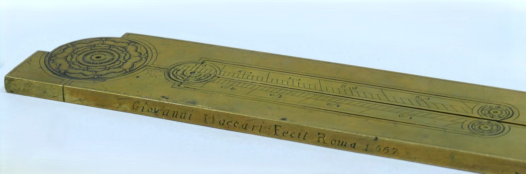 Folding brass square signed “Giovanni Maccari Fecit Roma 1667” on the outer edge.