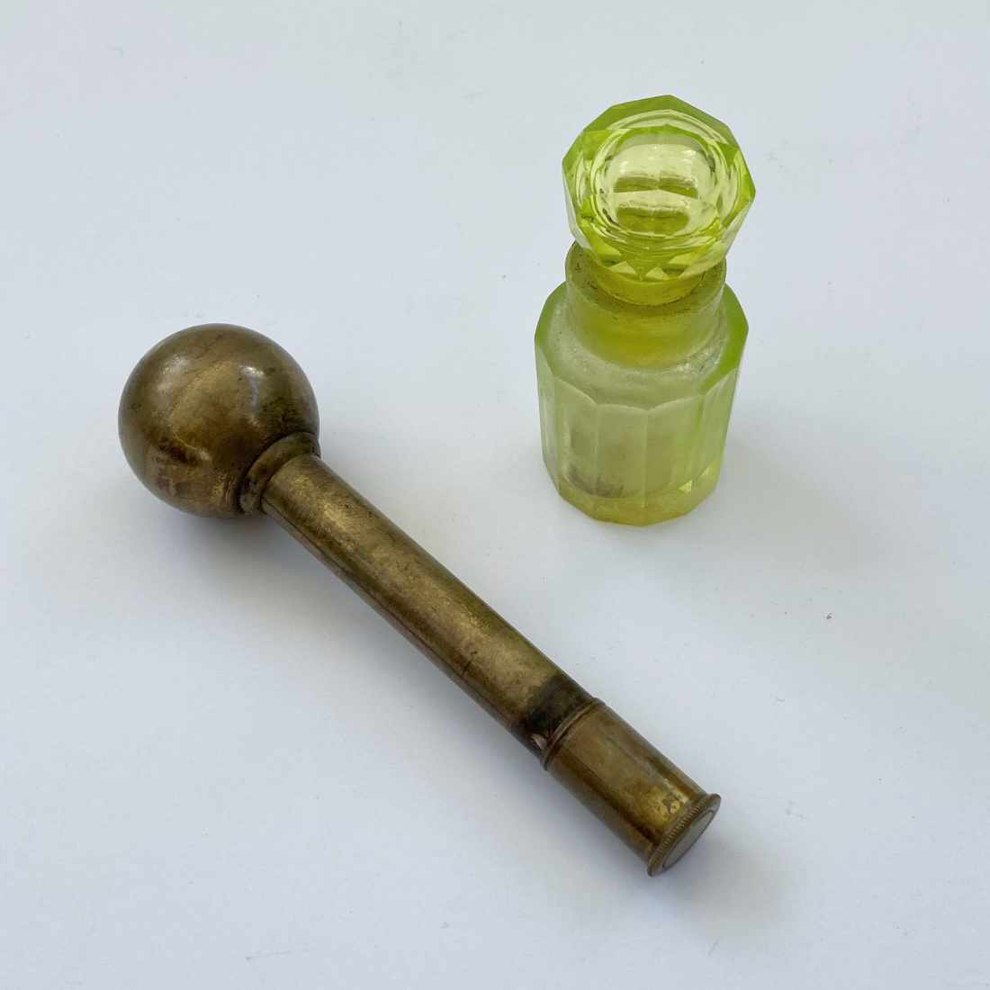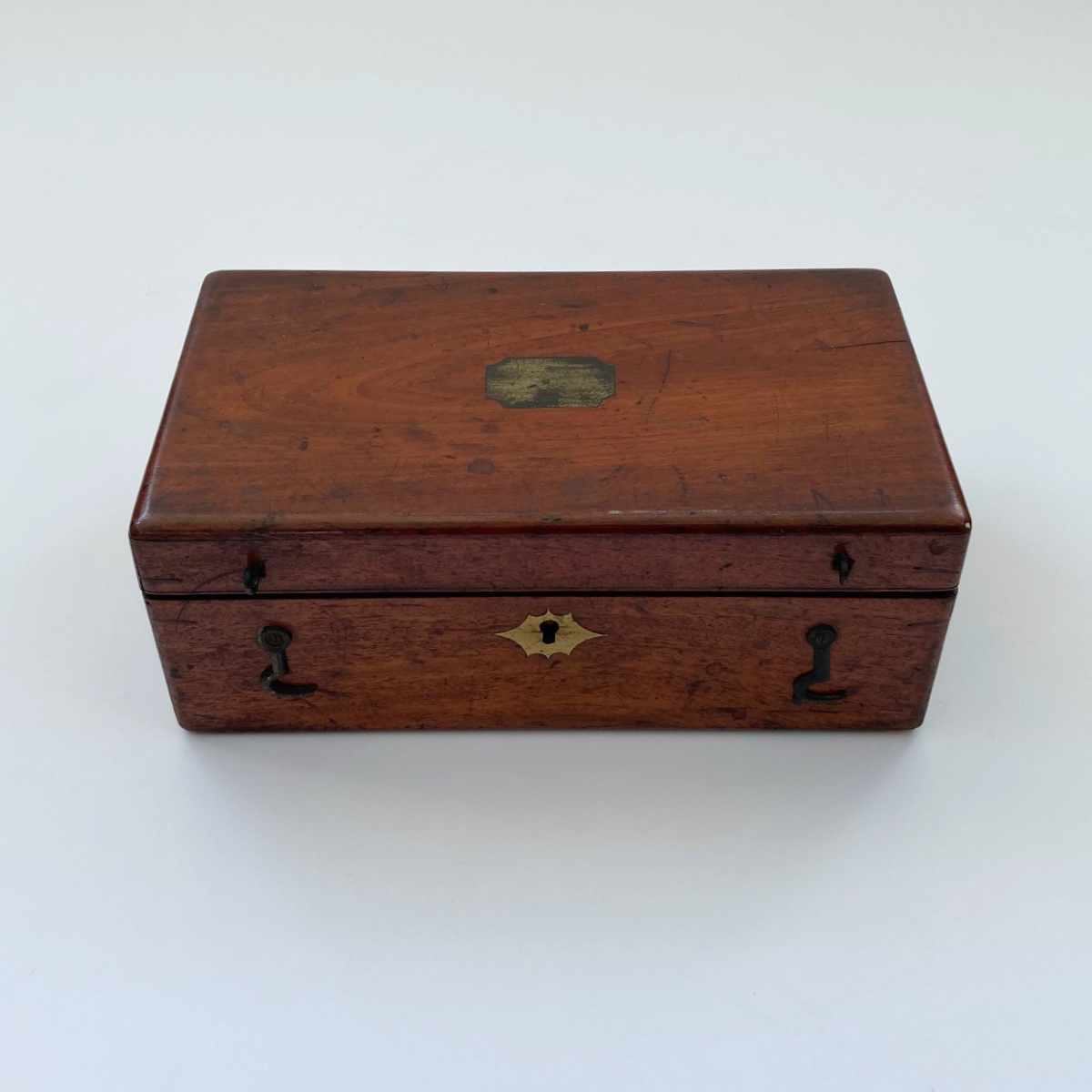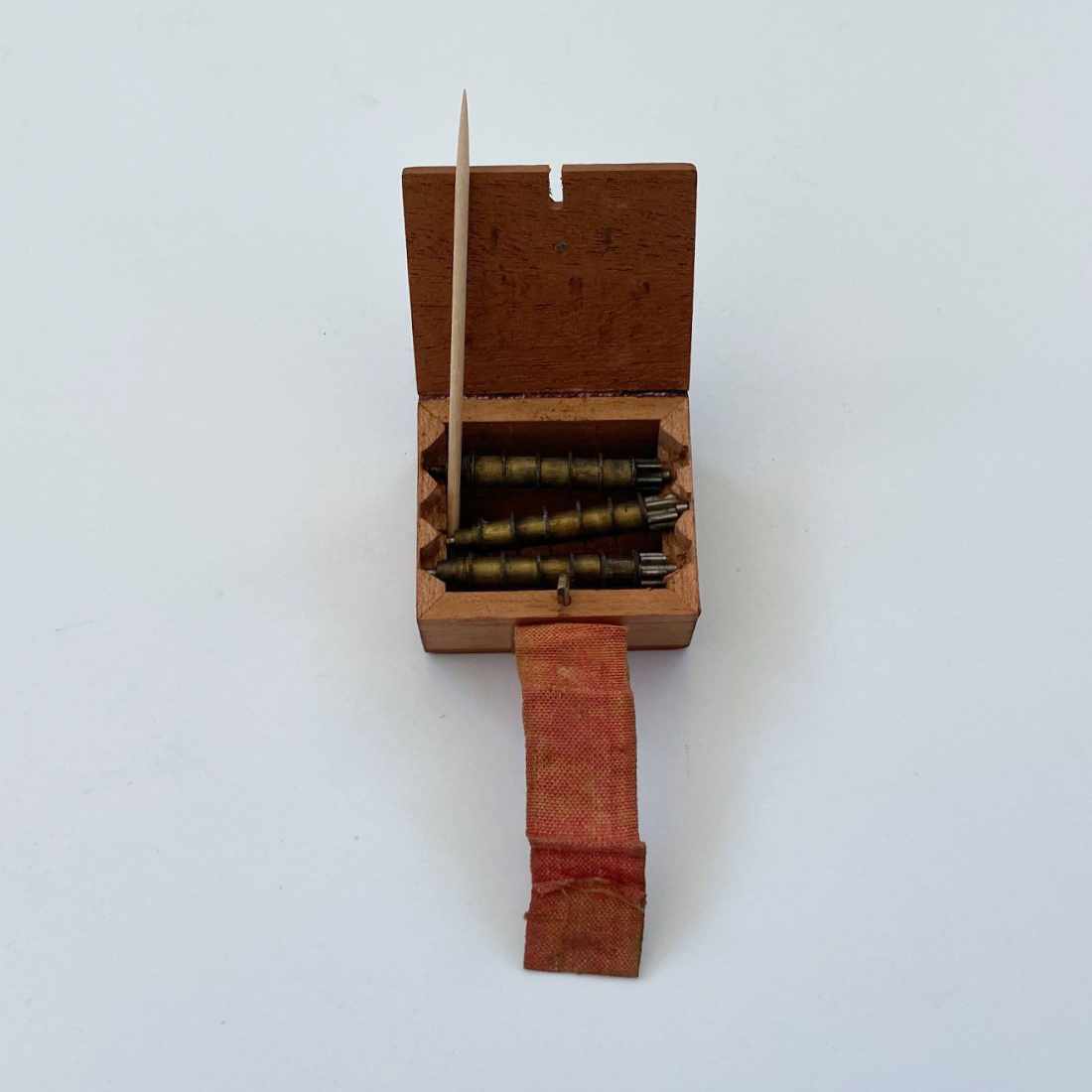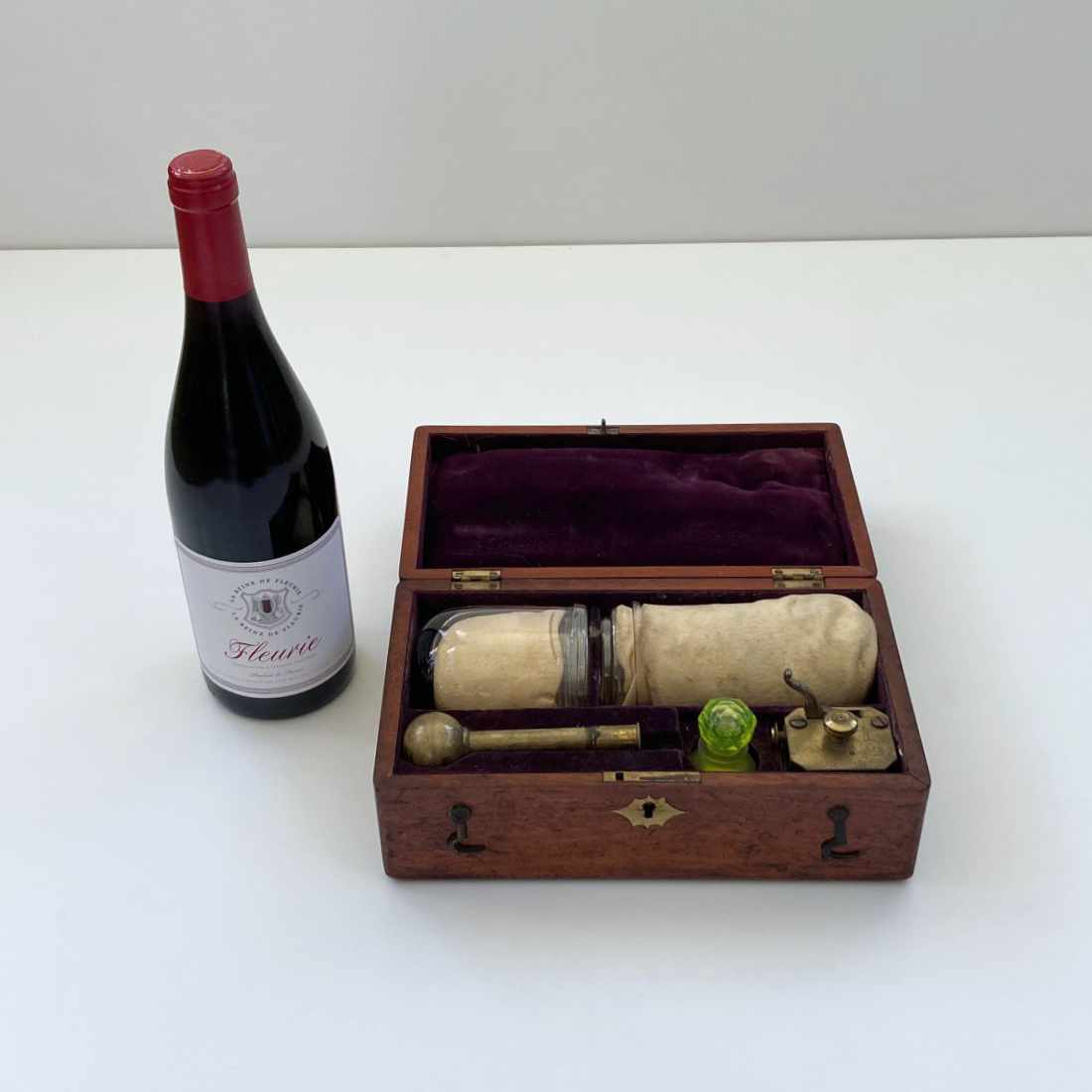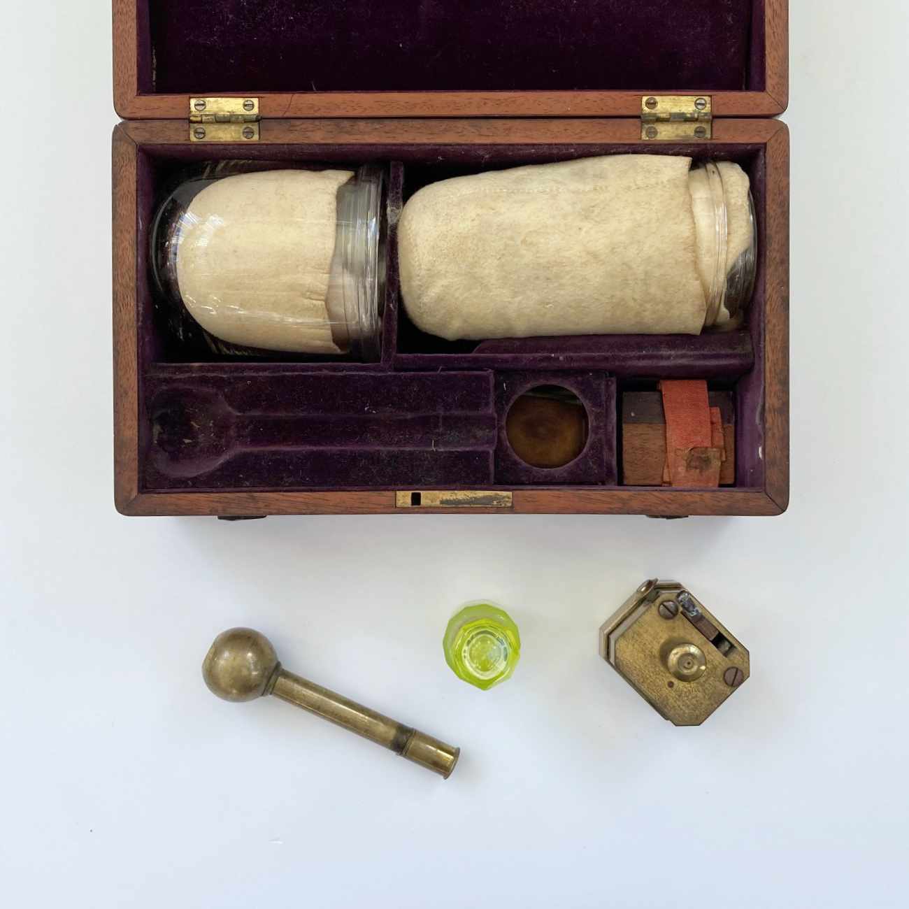 The lower section contains a simple mahogany case with leather hinge, a hook and eye closure and a section of ribbon to allow for ease of removal. Unusually, the case still retains its three replacement rollers for the scarificator.