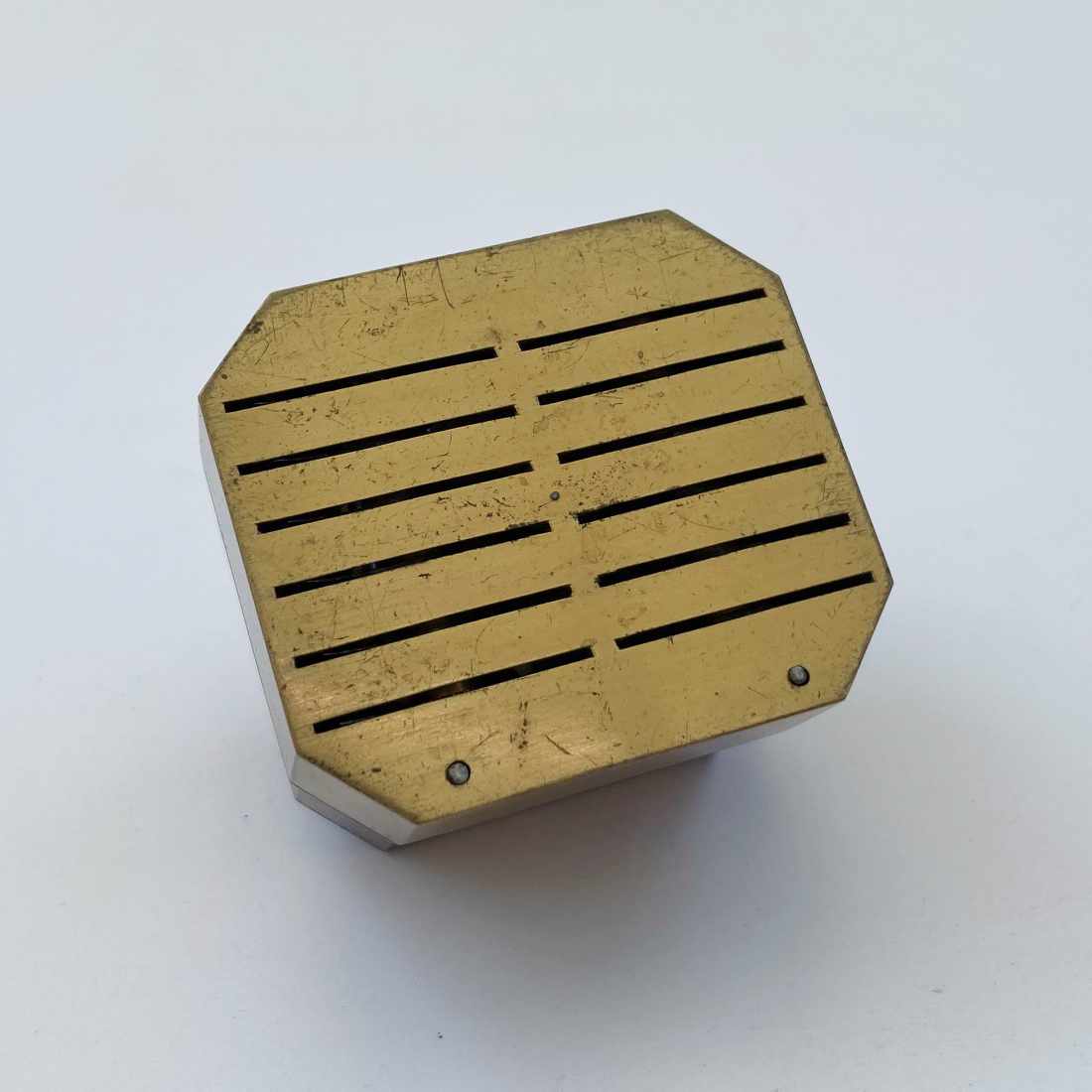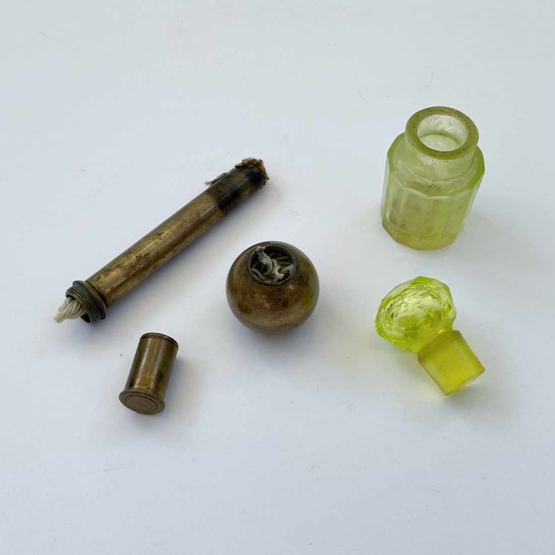 The fitted interior is provided with a nest of six flint glass cups to the rear section, with folded rims for ease of attaching to the skin, complete with their original chamois leather protective sleeves. A brass spirit lamp with bulbous end for filling with spirit and a pull off lid at the wick end to the front left. The fitted centre hole is provided with a green glass lidded bottle for storing additional spirit although this is undoubtedly a later replacement.