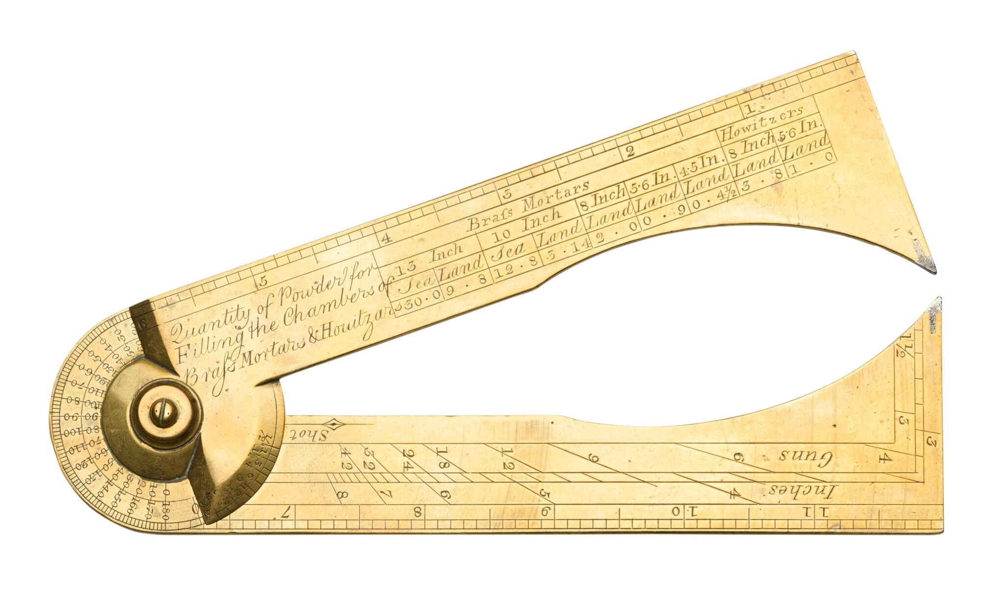 A six inch gunner’s caliper with finely engraved with scales for ‘Quantity of Powder for Filling the Chambers of Brass Mortars & Howitzers’ and marked out in inches for ‘Sea’ and ‘Land’ on one side, and for ‘Brass Guns’ over ‘Proof Service’ and ‘Iron Guns’ over ‘Proof Service’ on the other, hinged from ‘0’ to ‘180’ degrees and from ‘0’ to 8 Inches’, one side with 12 ‘Inches’ rule, and with steel tips, 30.5 cm (extended).
