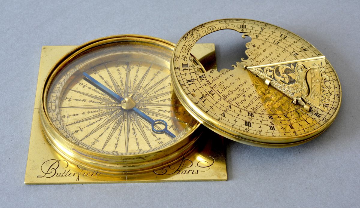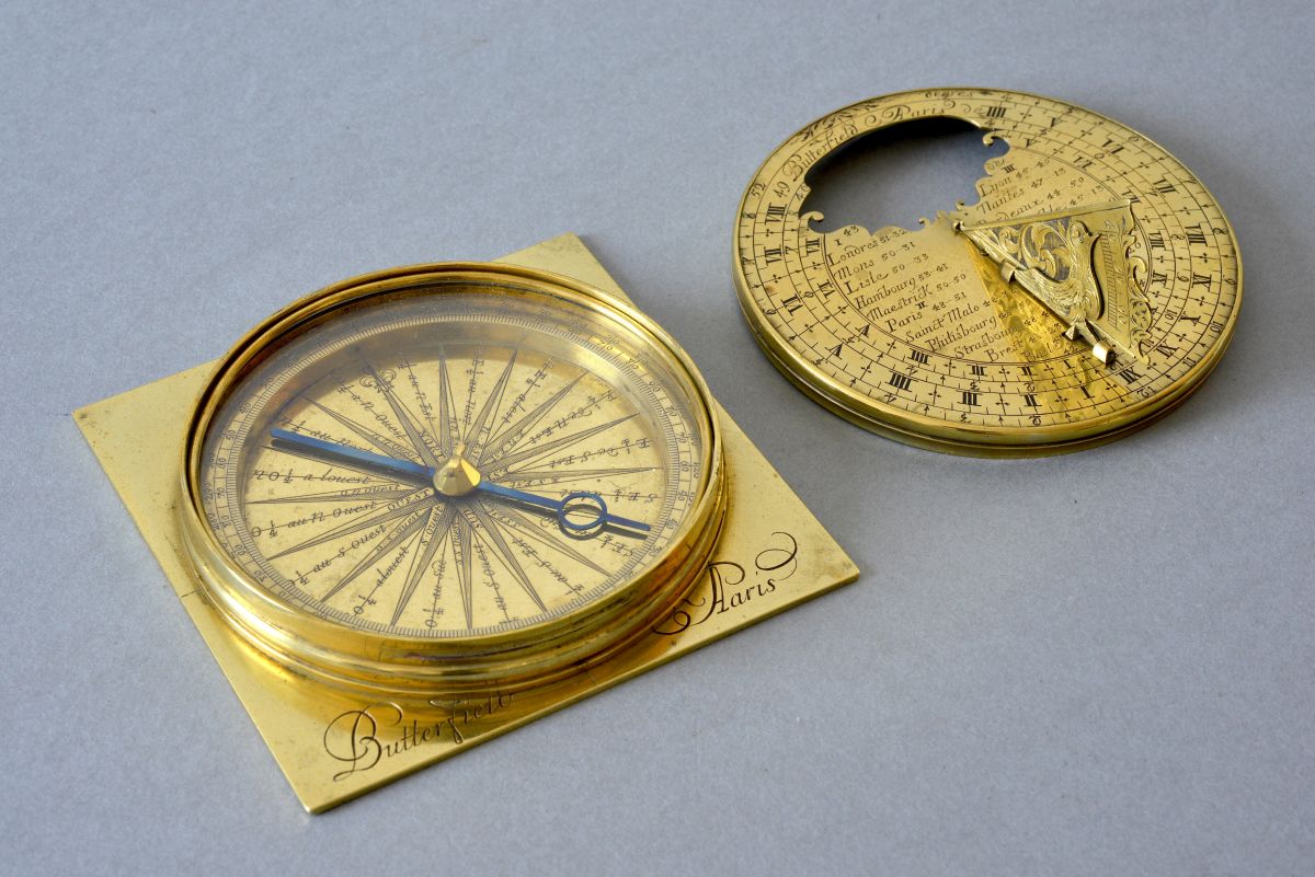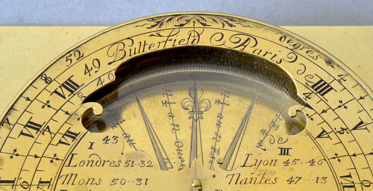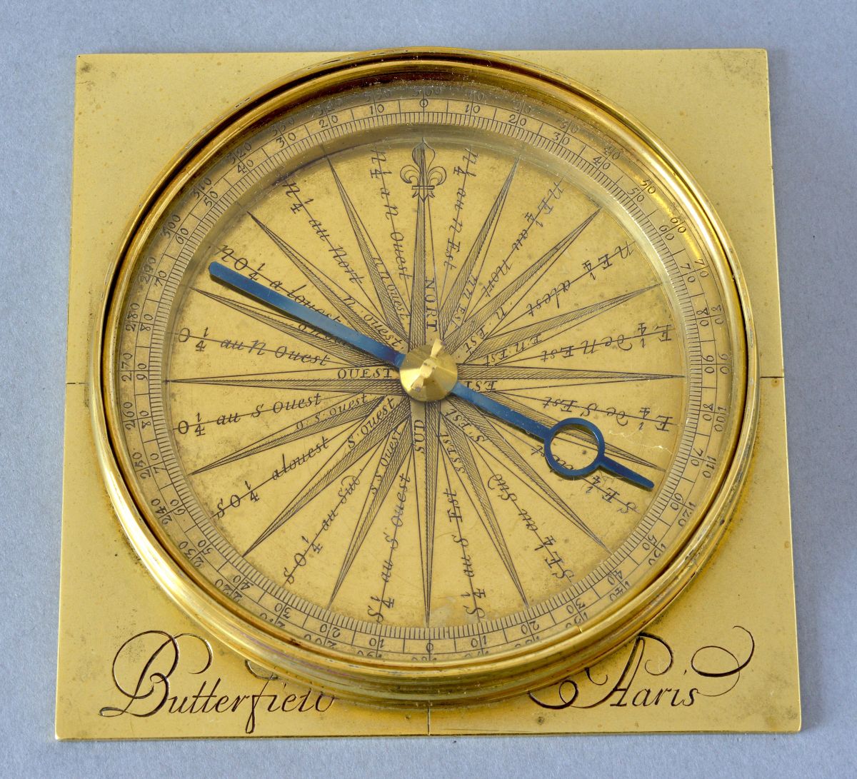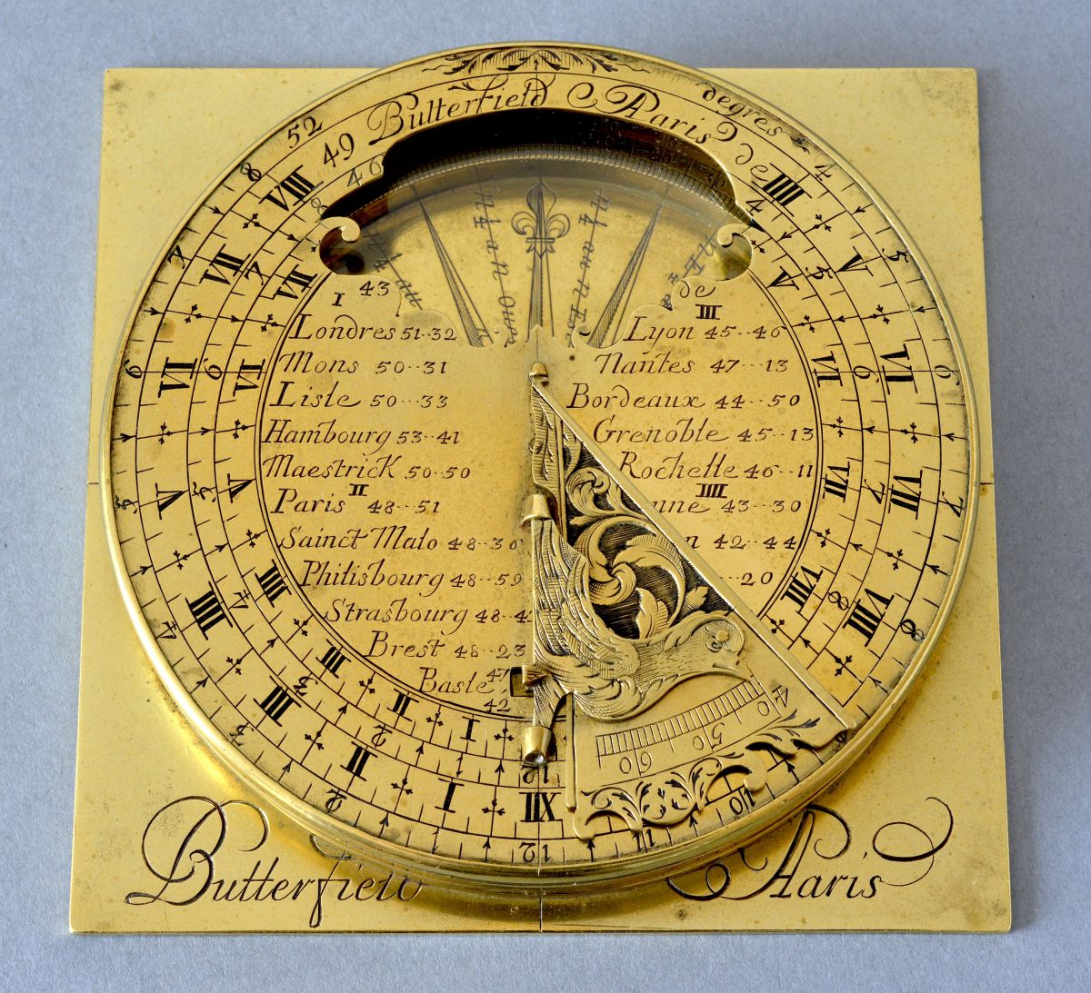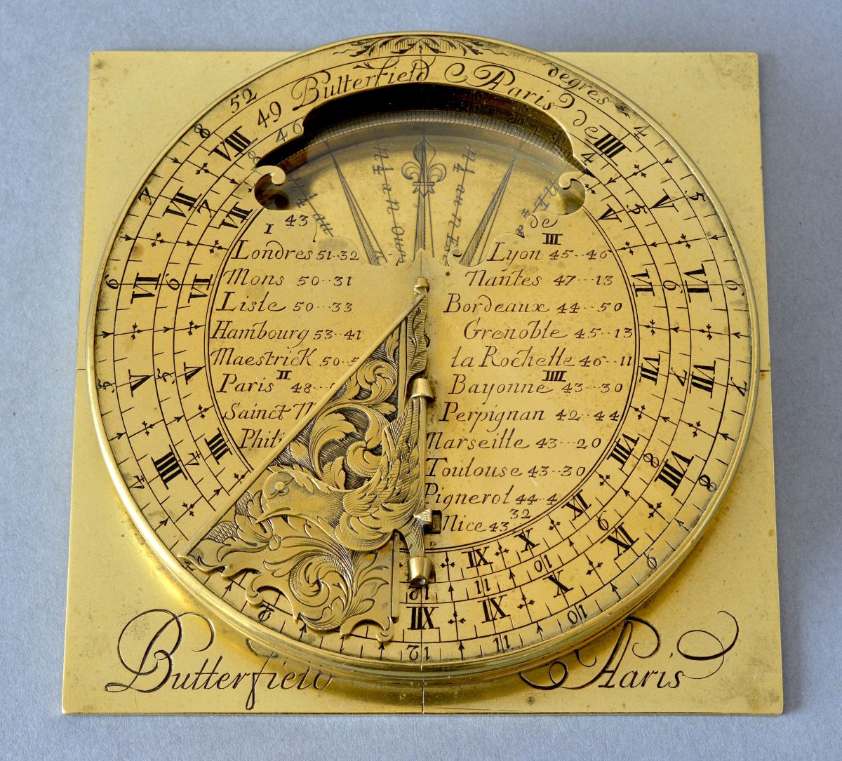 Note: Michael Butterfield (c. 1635–1724), a scientific instrument maker of English origin who settled in Paris in 1663, is renowned for his portable horizontal sundials with compasses and adjustable gnomons, which were very popular in the late 17th and early 18th centuries. He was appointed Royal Engineer for Mathematical Instruments in 1704.