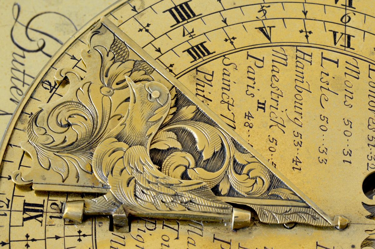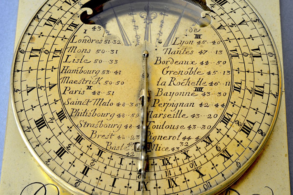 The circular lid, forming the sundial, shows part of the compass and the needle through a cut-out window. It has four hour scales (Arabic and Roman numerals) for different latitudes and a list of 22 cities, including two unusual ones (Pignerol and Philisbourg). At the center, a foldable bird-shaped gnomon decorated with acanthus leaves, with a latitude scale and engraved decoration on the reverse.