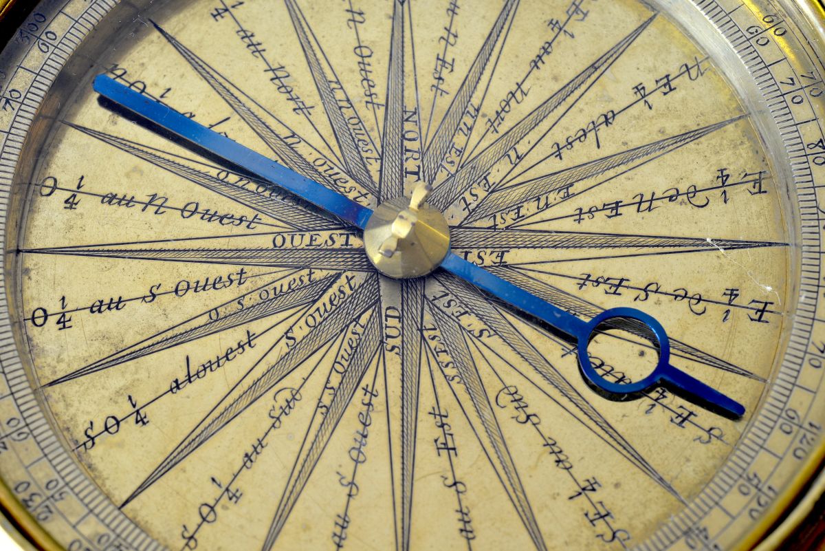 This instrument consists of a square base holding a large compass engraved with a compass rose showing 16 main and 16 secondary directions, with a double scale (0–360° and 0–90°) and a blued steel needle on a brass pivot. The whole is protected by a glass cover.