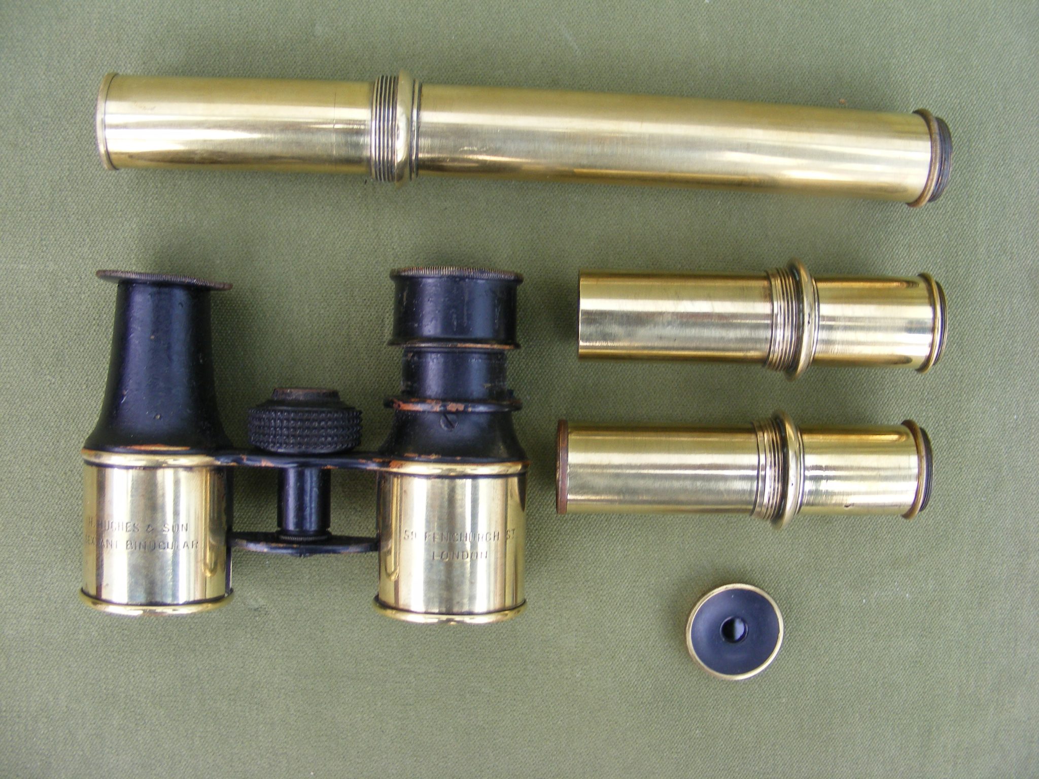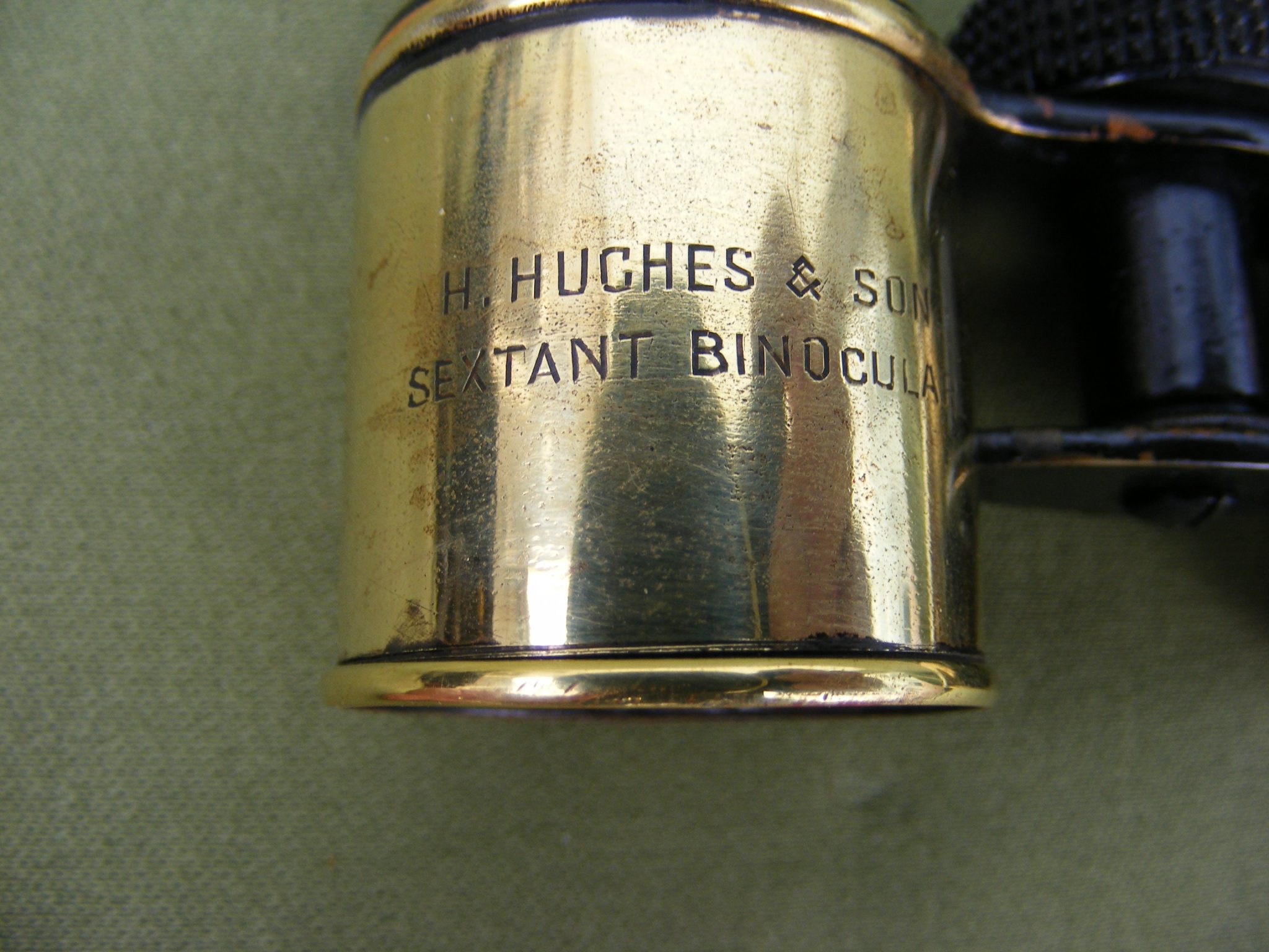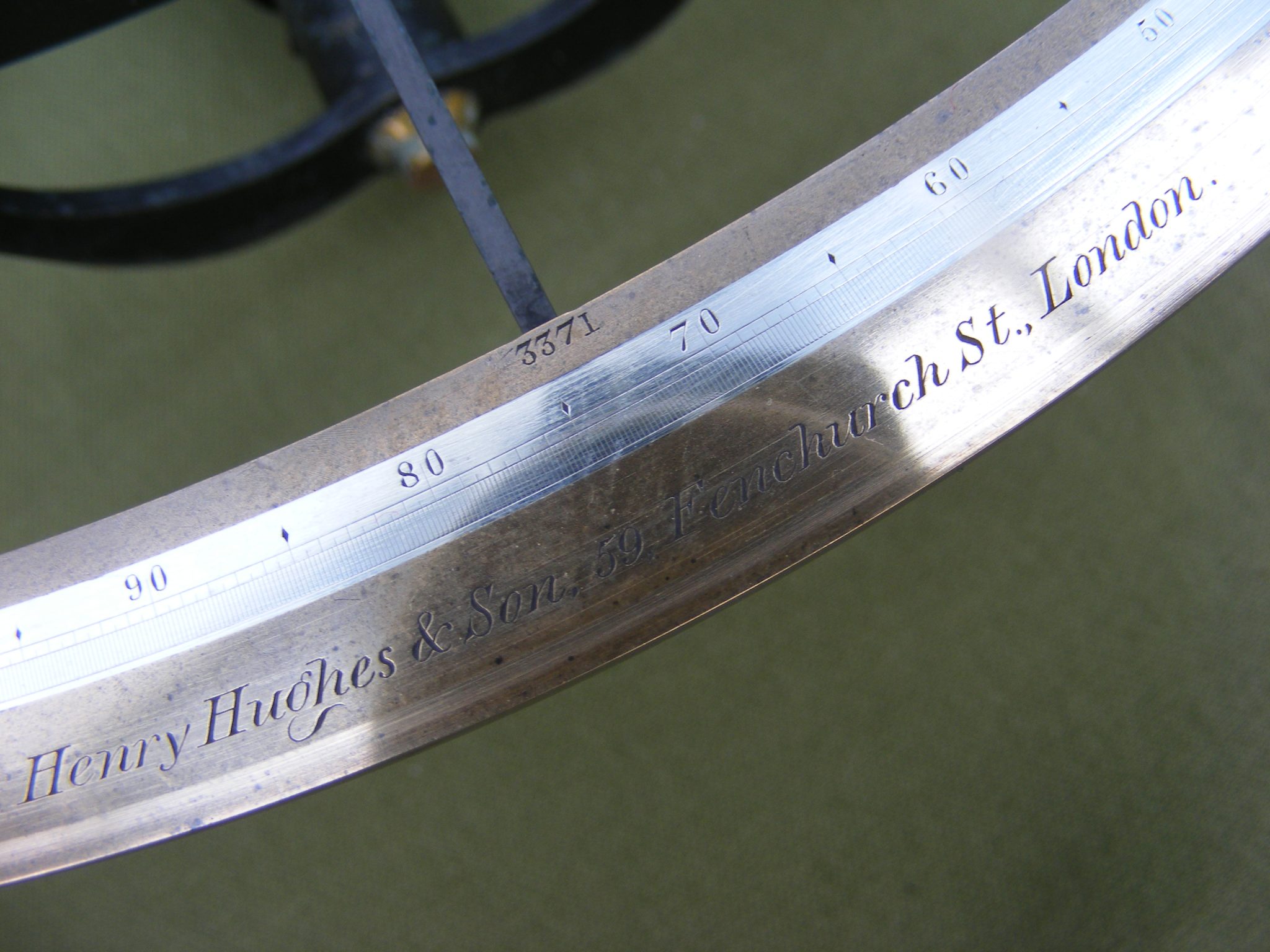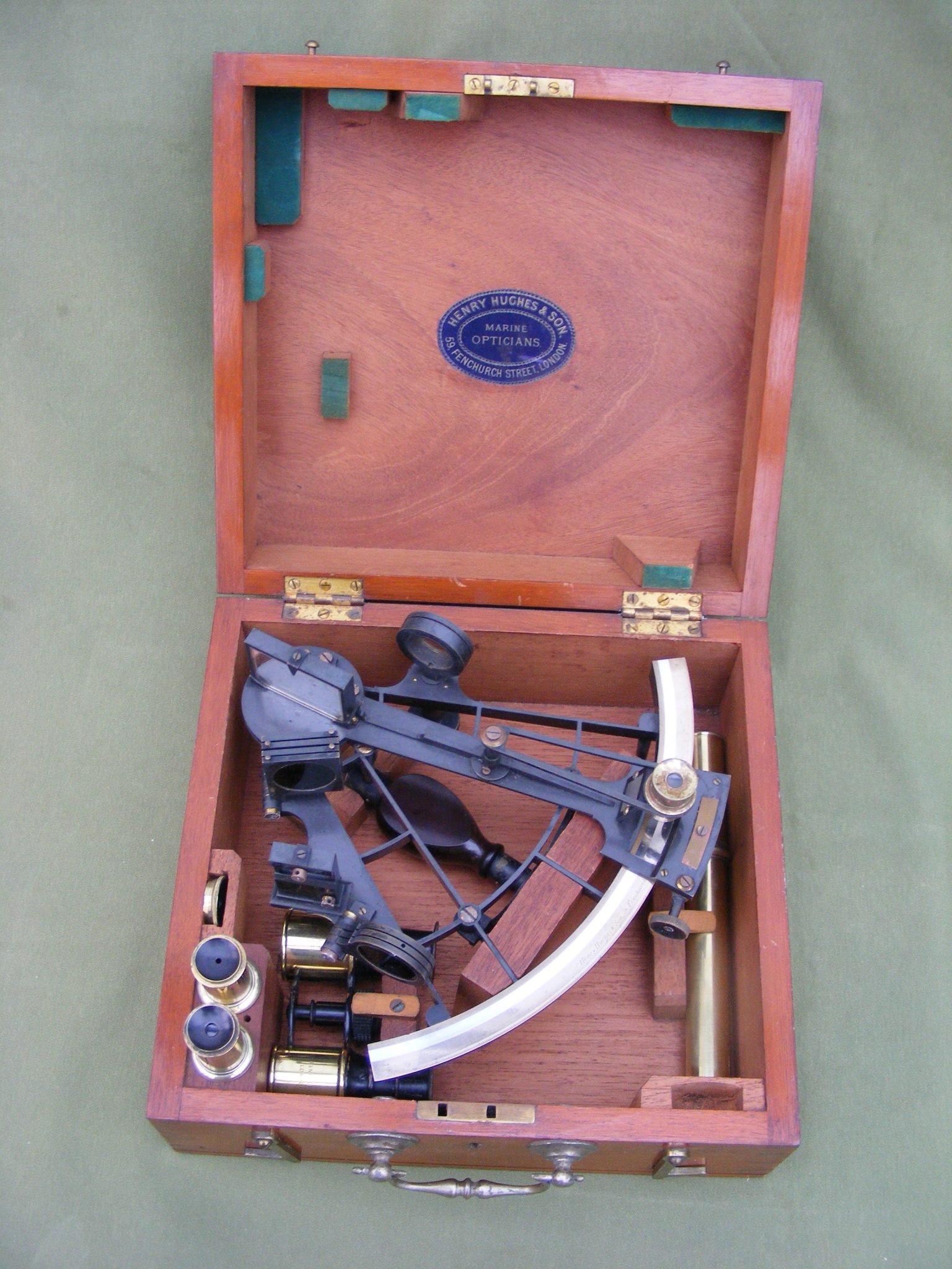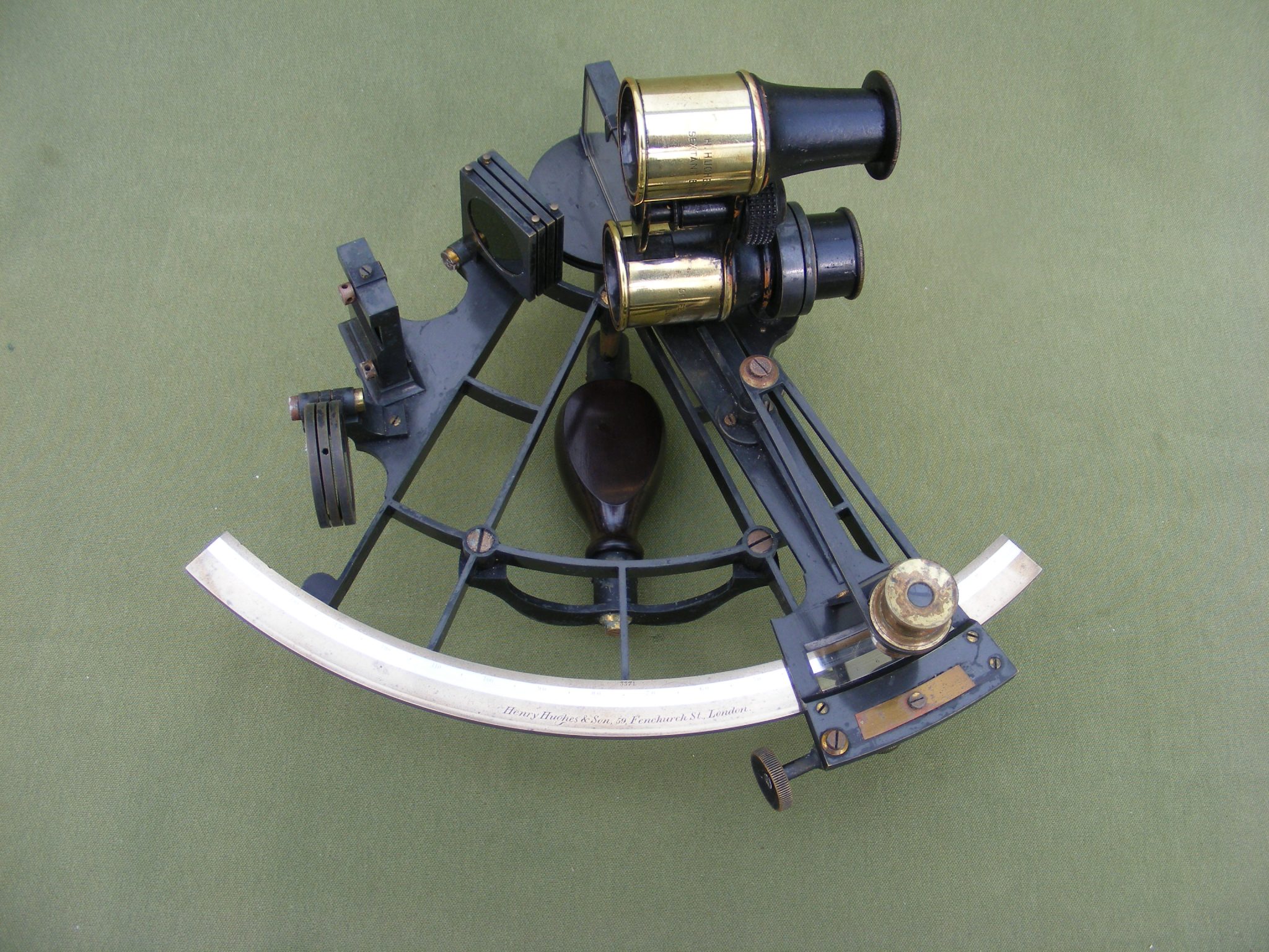 GOOD ENGLISH VERNIER SEXTANT SIGNED: HENRY HUGHES & SON. 59 FENCHURCH ST. LONDON. No.3371 IN ORIGINAL BOX 10.1/2" X 9.3/4" X 4.3/4" INCHES WITH LONG INVERTING TELESCOPE, BINOCULARS, ERECTING SCOPE, SIGHTING TUBE & FILTER CAP. SILVER SCALE MINUS 5 DEGREES TO 160 DEGREES IN 10 MINUTE DIVISIONS VERNIER READING TO 10" SECONDS OF ARC. RADIUS 7" INCHES