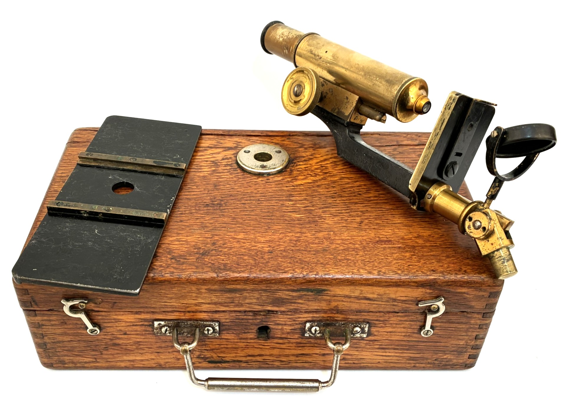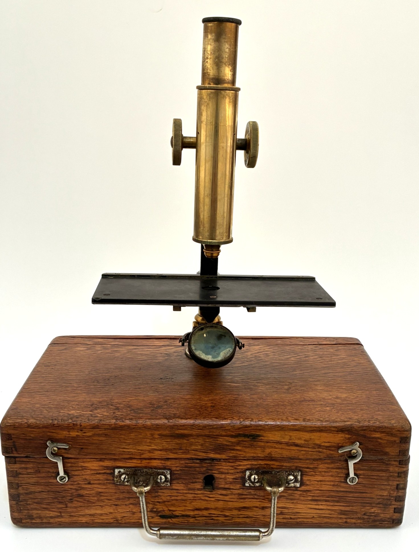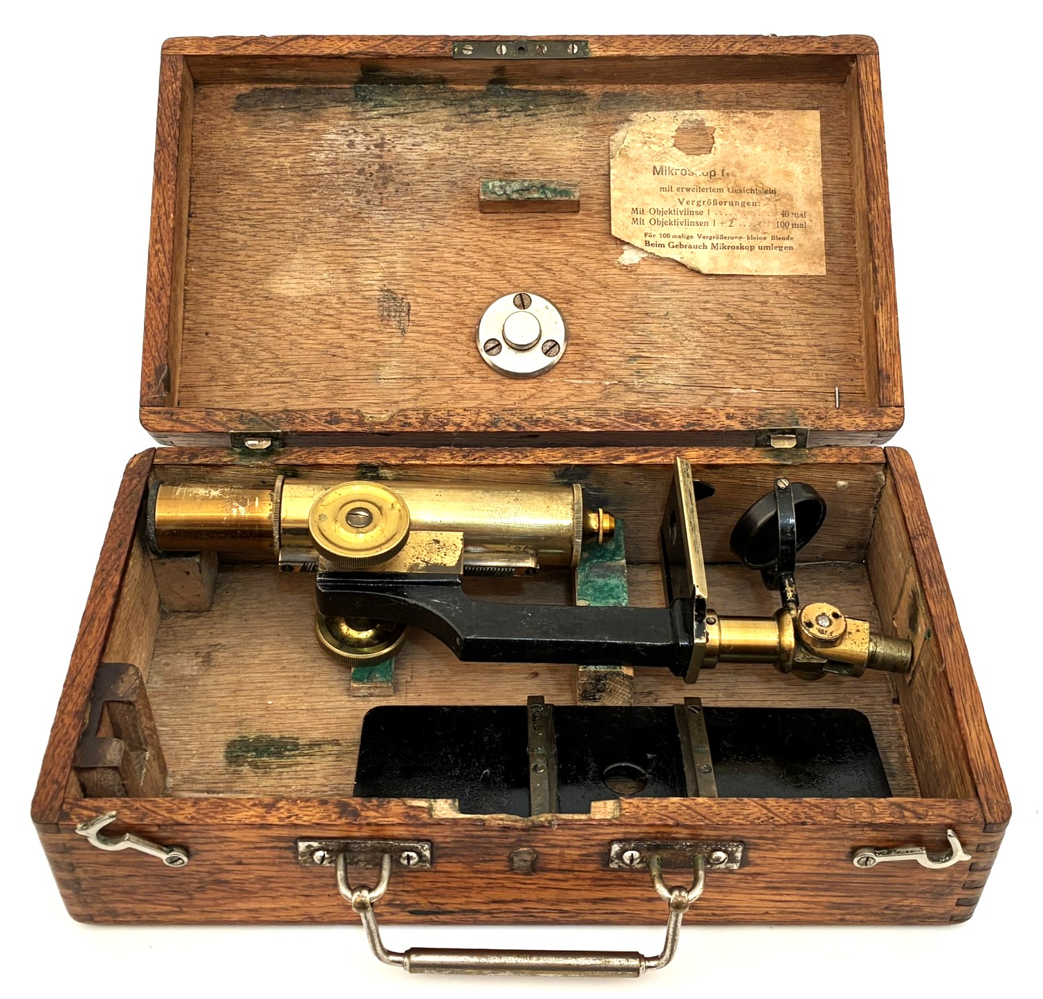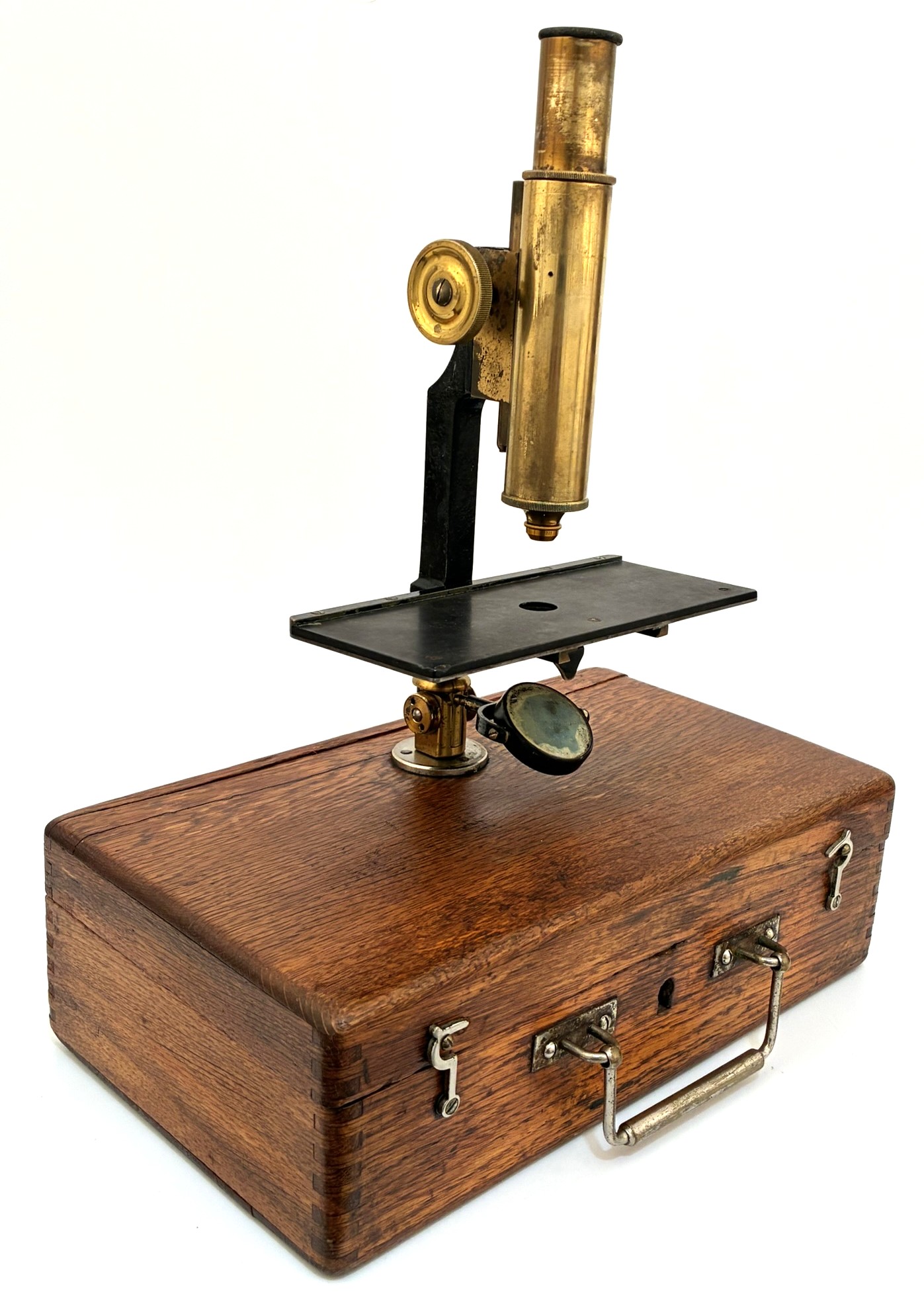 Portable microscope of German origin, manufactured around 1880. The support is the carrying case itself. The mirror has some discoloration but the set is fully usable. A good example of a microscope used by rural doctors who traveled to visit their patients. The big platform was to make observations of trichinosis.