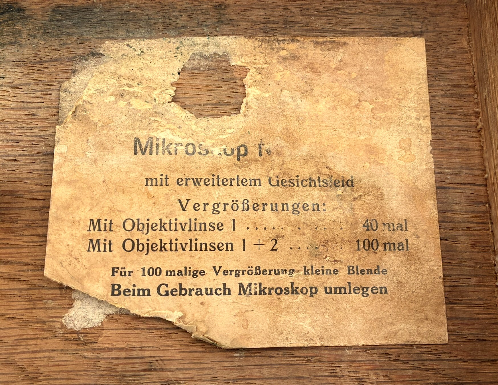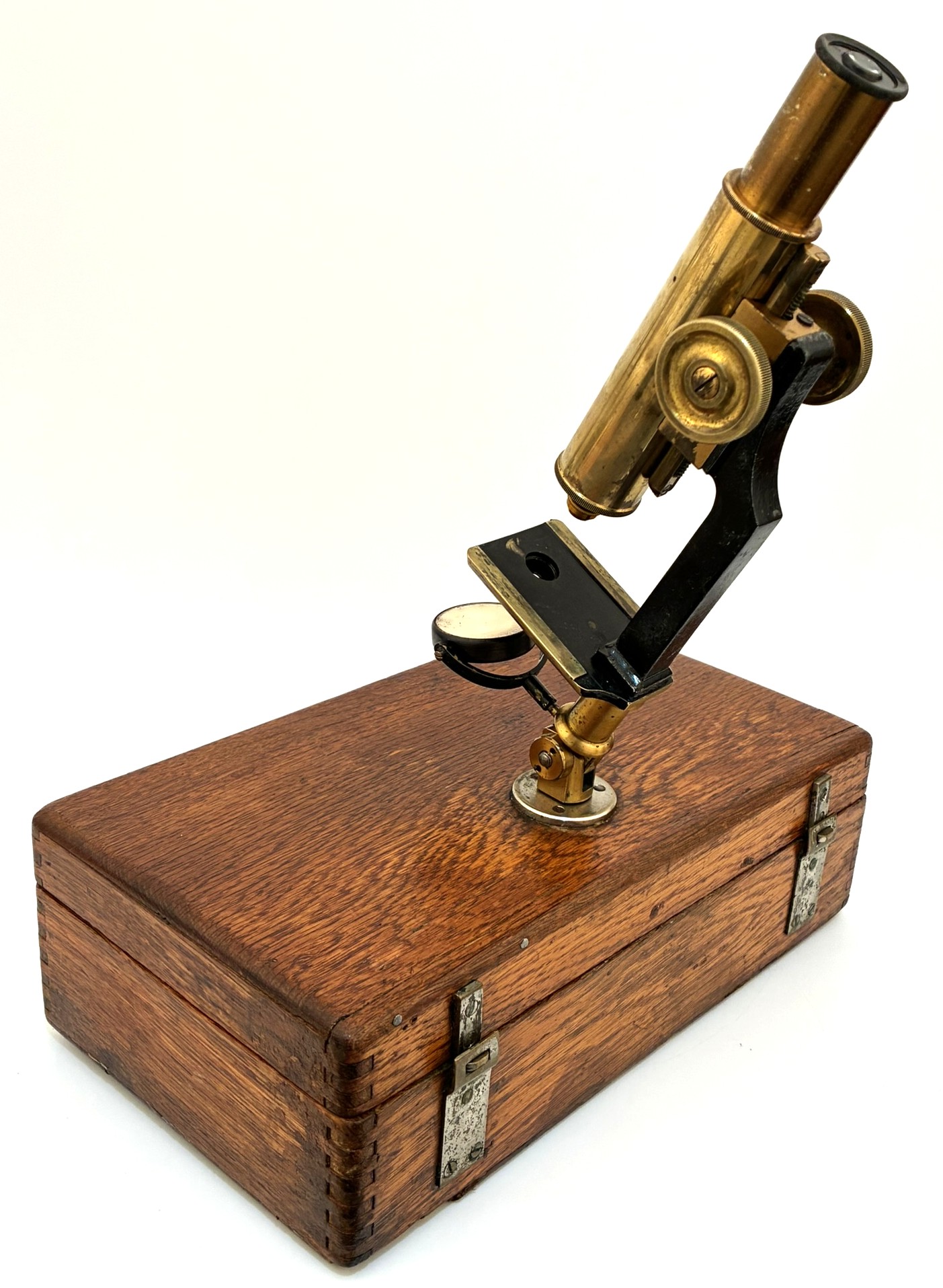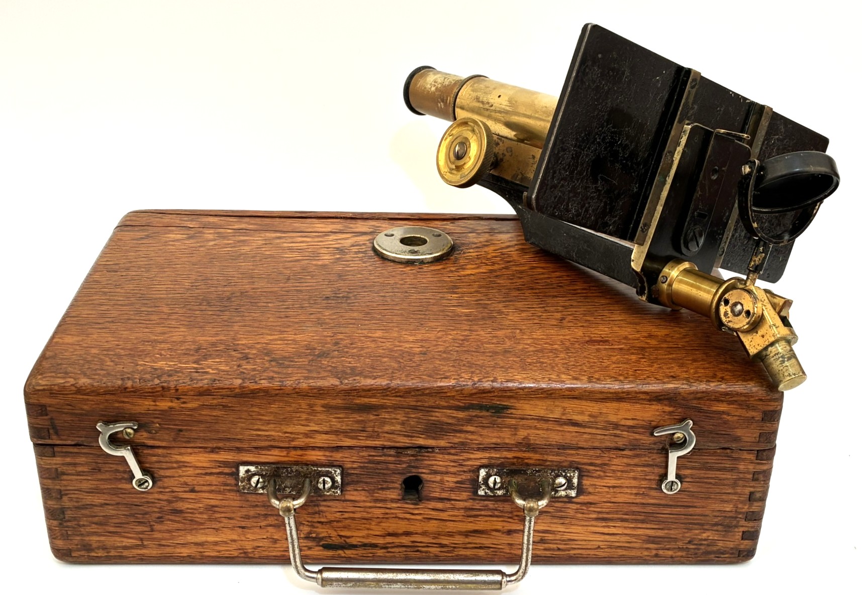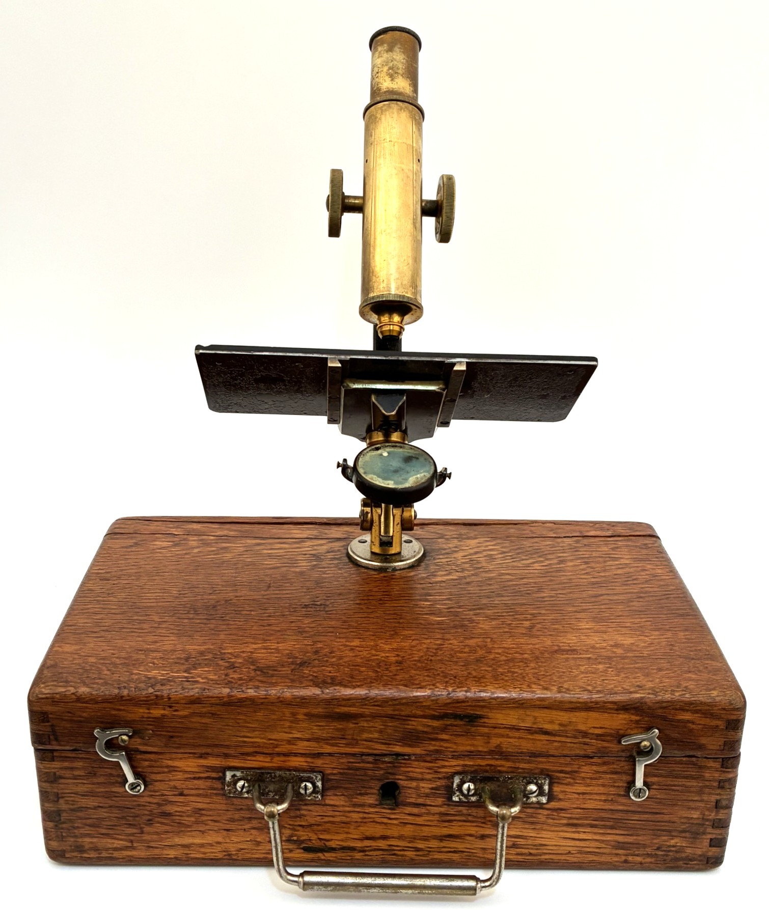 Portable microscope of German origin, manufactured around 1880. The support is the carrying case itself. The mirror has some discoloration but the set is fully usable. A good example of a microscope used by rural doctors who traveled to visit their patients. The big platform was to make observations of trichinosis.
