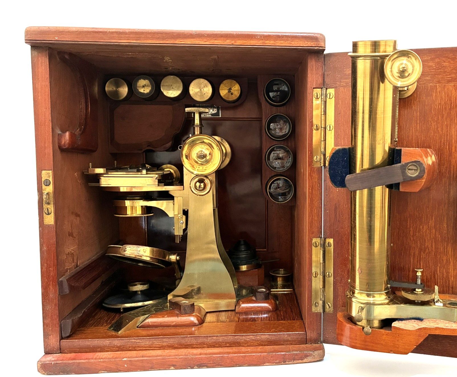 Lacquer is original, all moving function well.Tilt very firmly set. The microscope has detachable “Wenham” binocular tubes, which can be used for stereo-microscopy by using an achromatic prism above the objective lens to split the light beam. The nosepiece on the instrument also has a “Nicol” prism mounted above the “Wenham” prism, each residing in a sliding brass box so thatthey can be introduced or removed from the light path.
