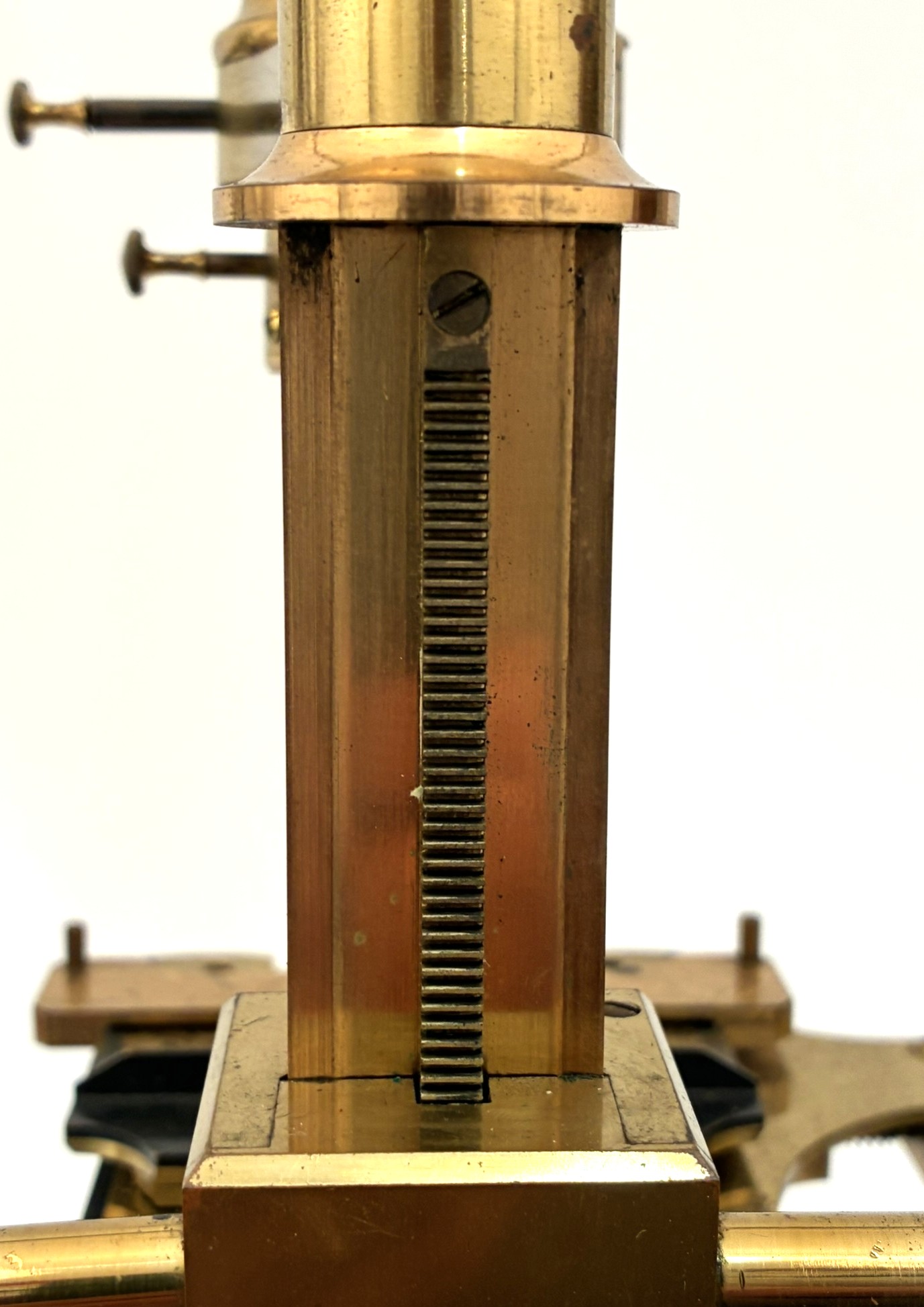 The microscope is a binocular “Ross bar-limb” type, This type has a square section which pivots about the uprights, to which is attached the stage and racked substage. It was designed by Andrew Ross in 1842.