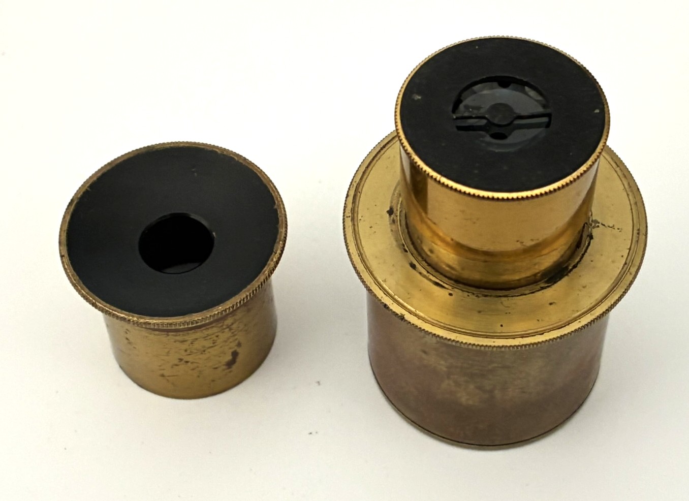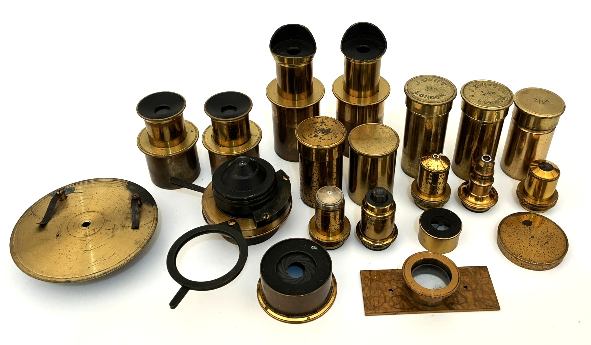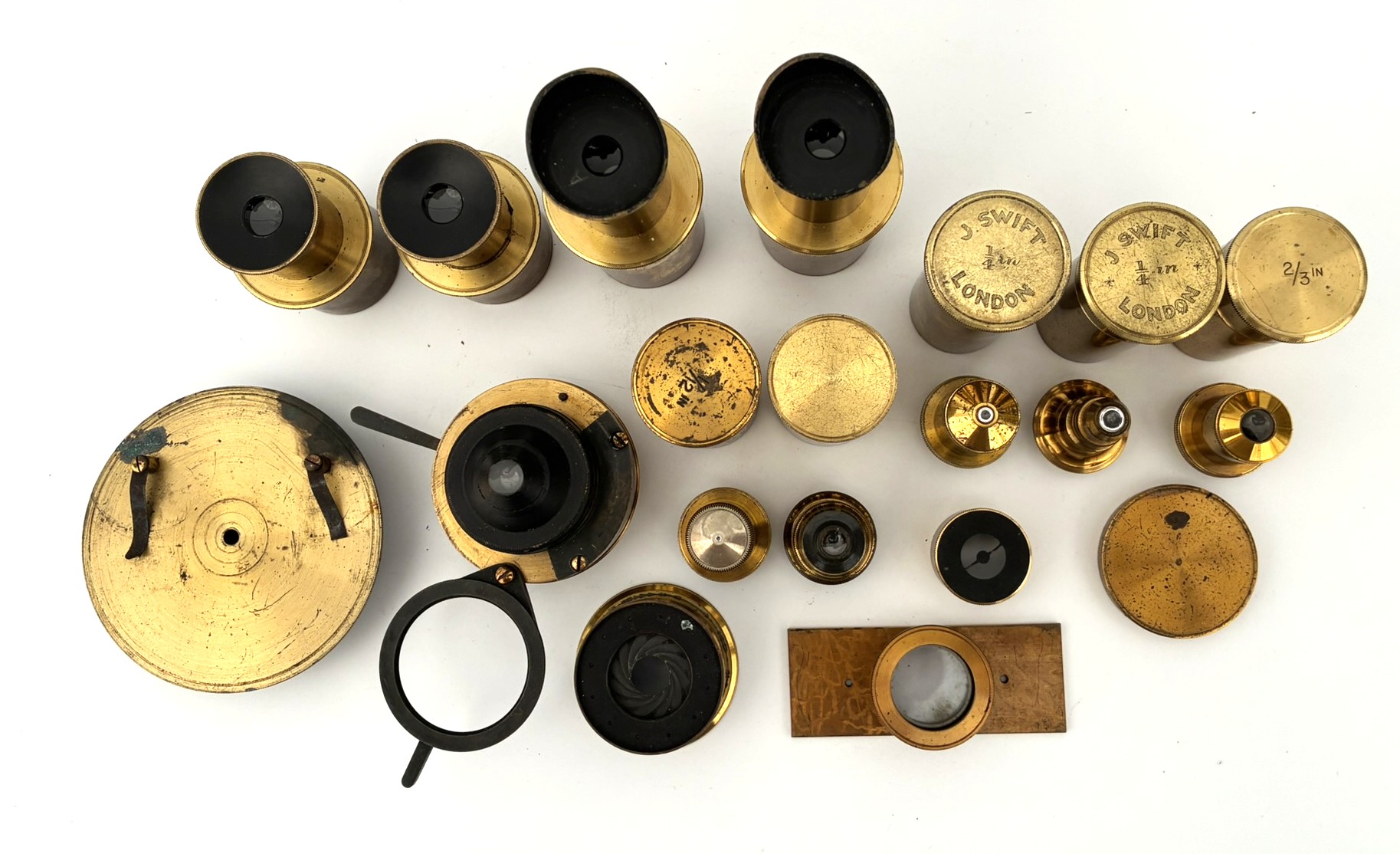 It comes with 5 objectives lens, four of them engraved with Swift names, in brass cannisters. The last one is not engraved but it is holded in a Swift brass cannister. There are some other accessories but, although from the same era, they are probably not original from this microscope.