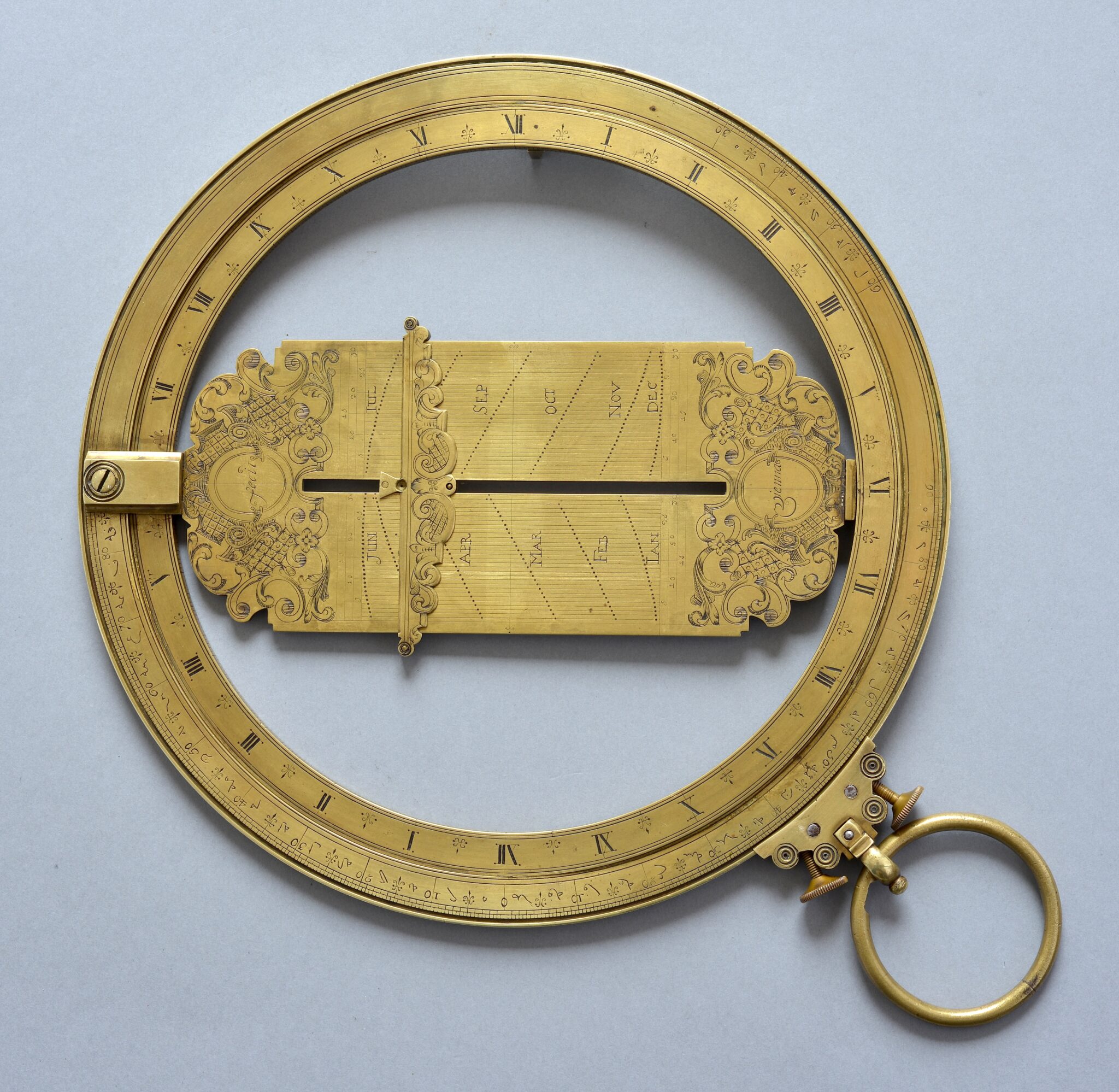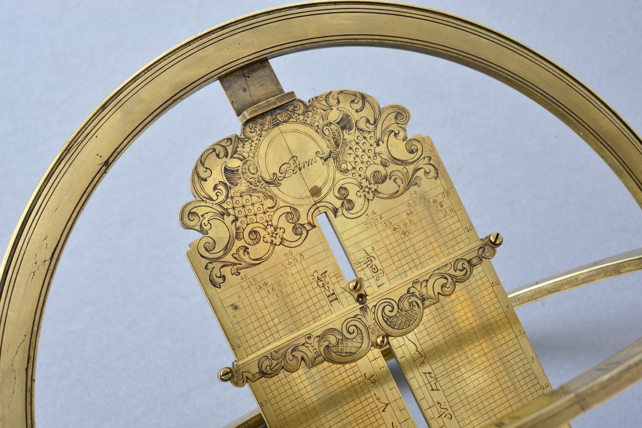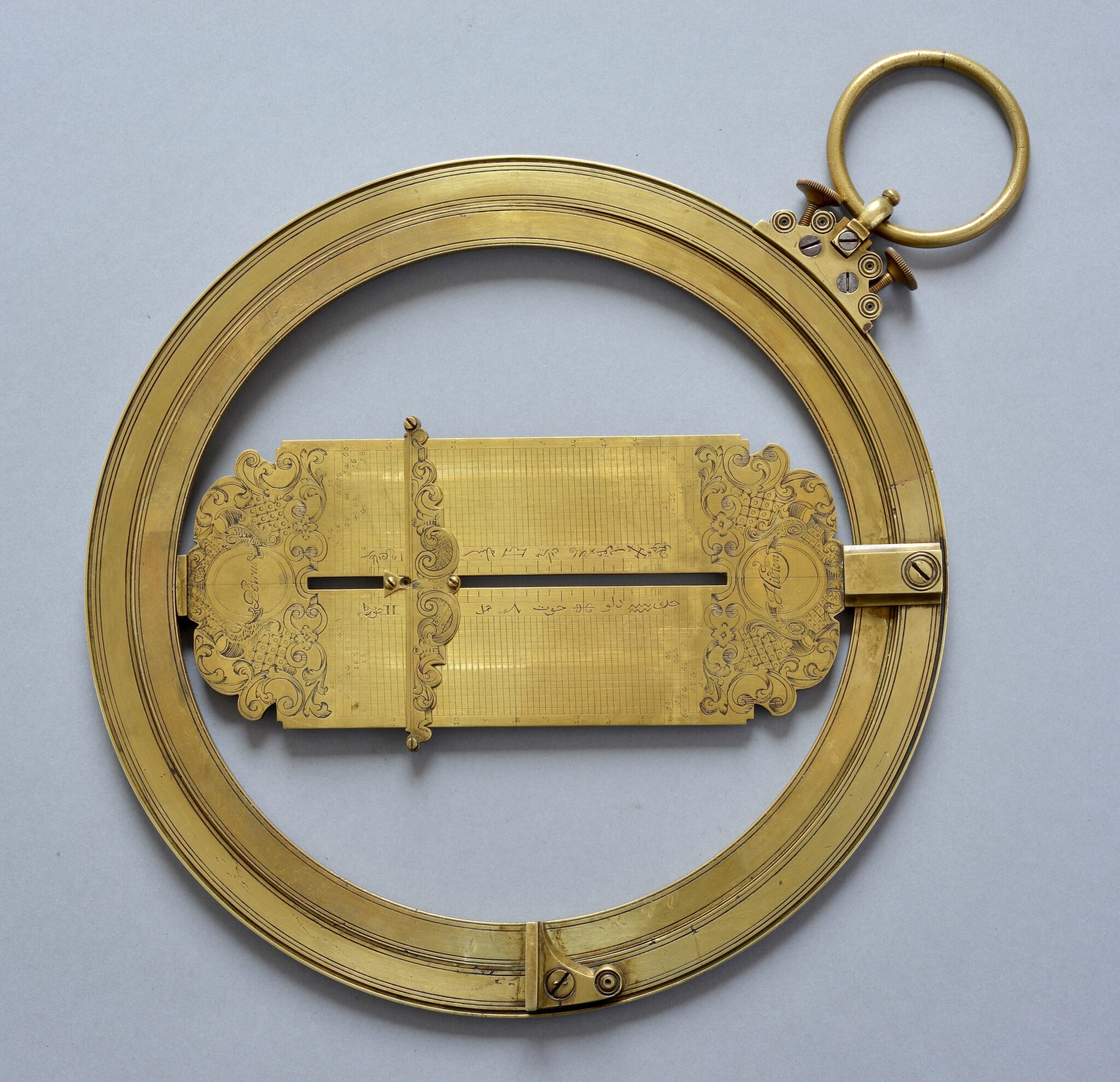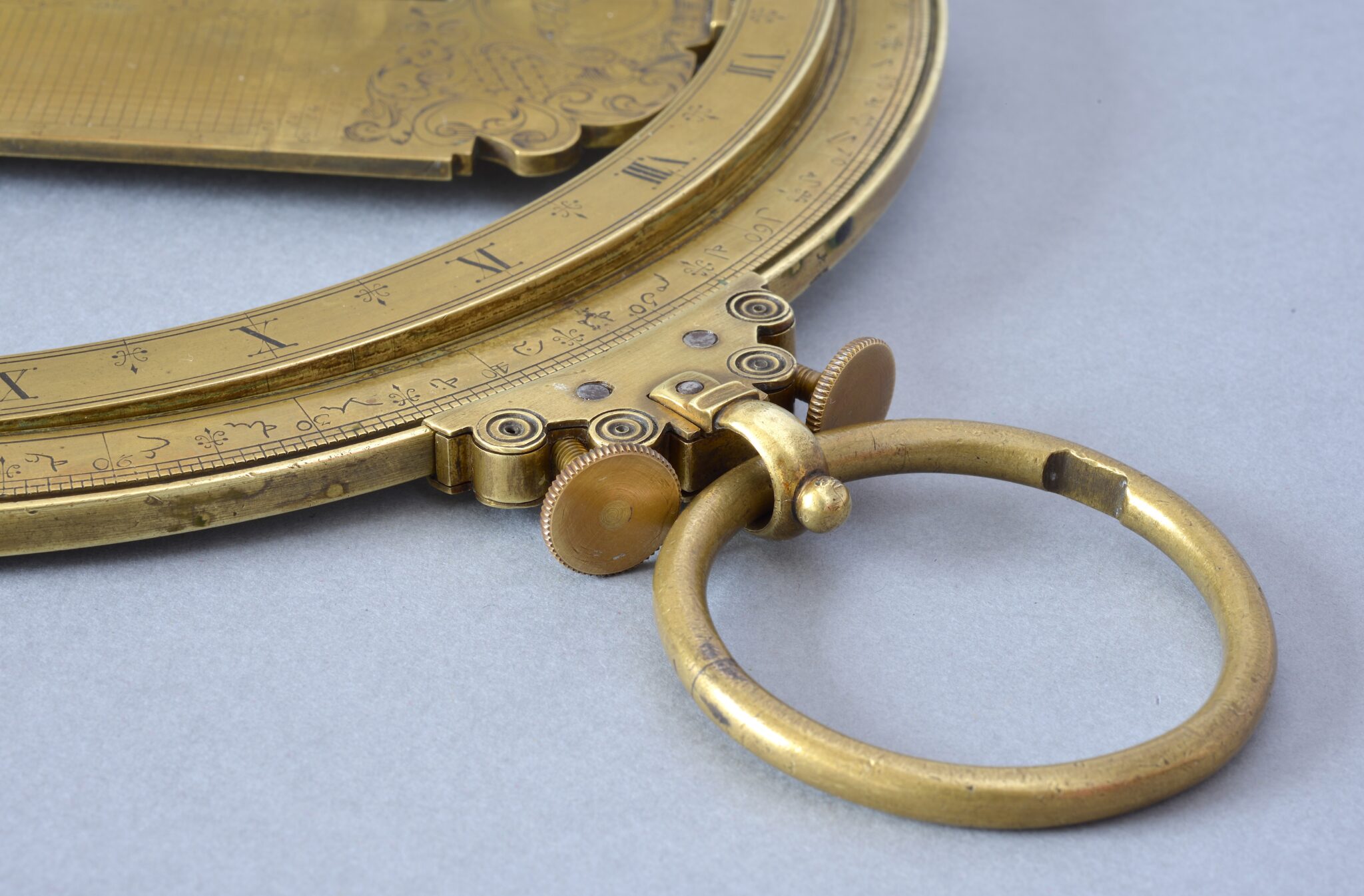 Large brass equinoctial ring dial with two rings and wide central bridge with slider. It is fitted with a mobile throne topped by a ring. In addition to the usual numerals, it contains rare inscriptions in Arabic (probably for the Ottoman market).
