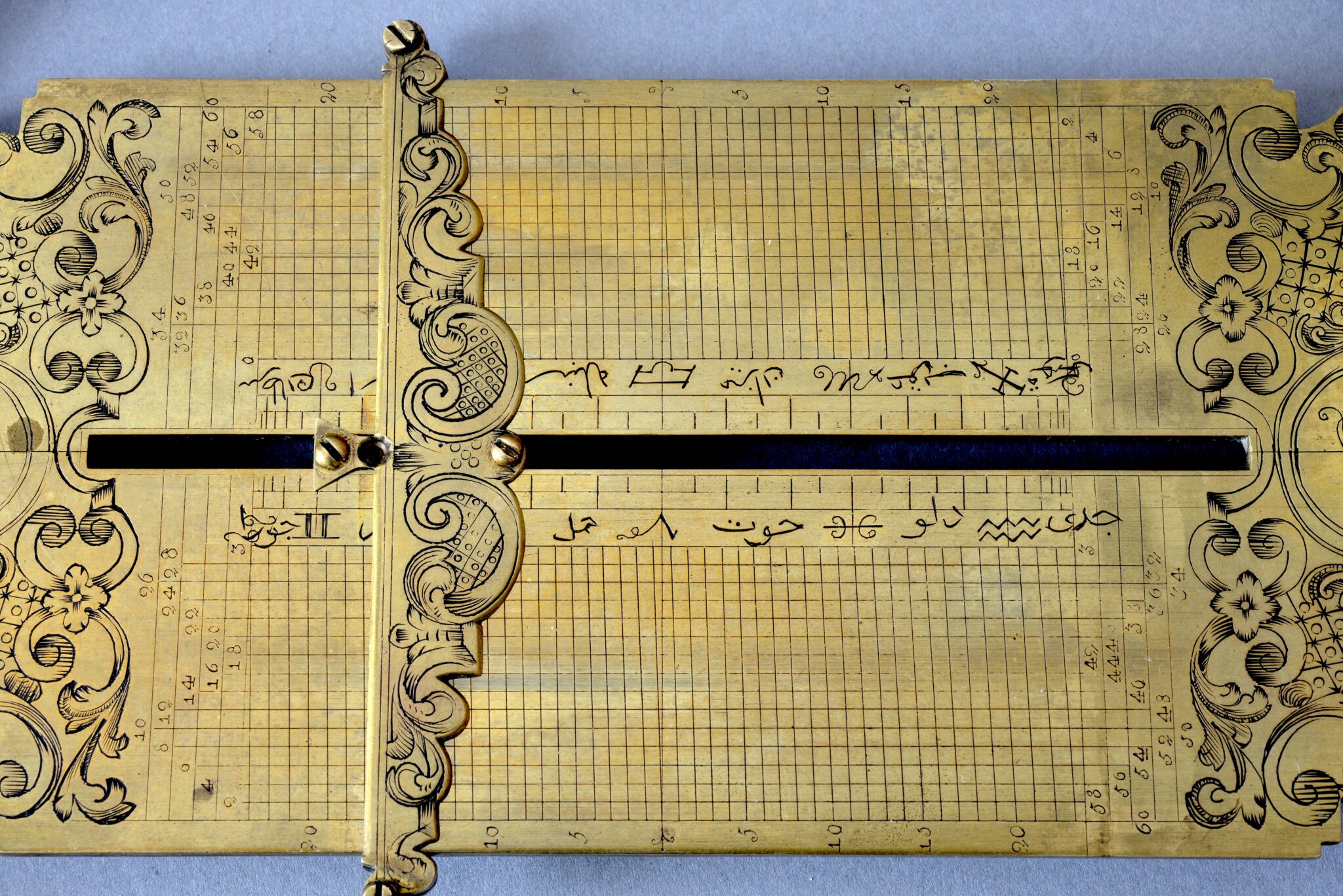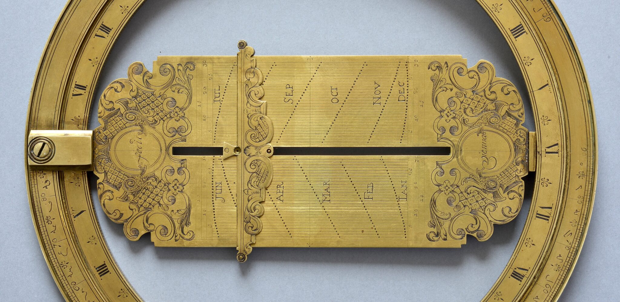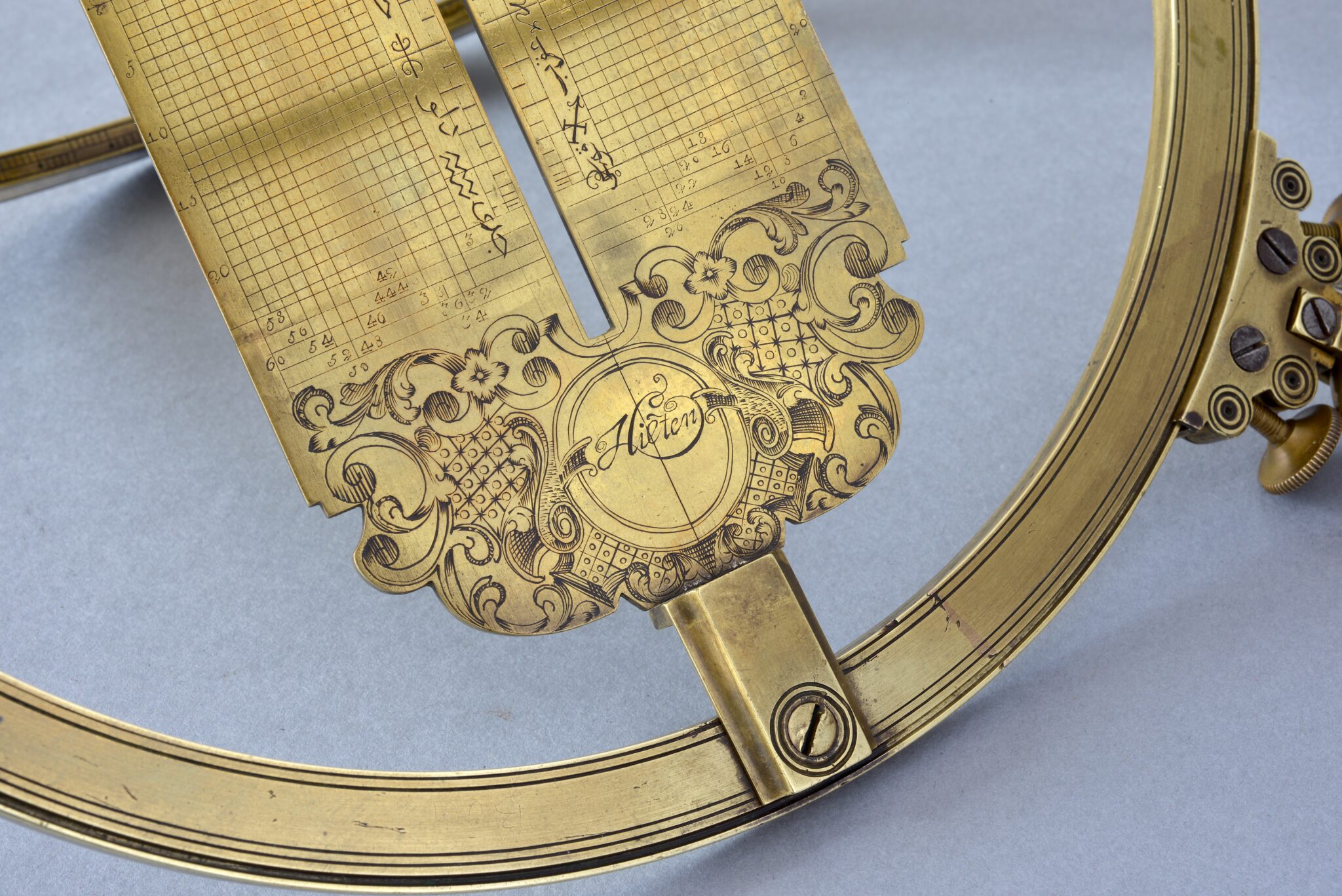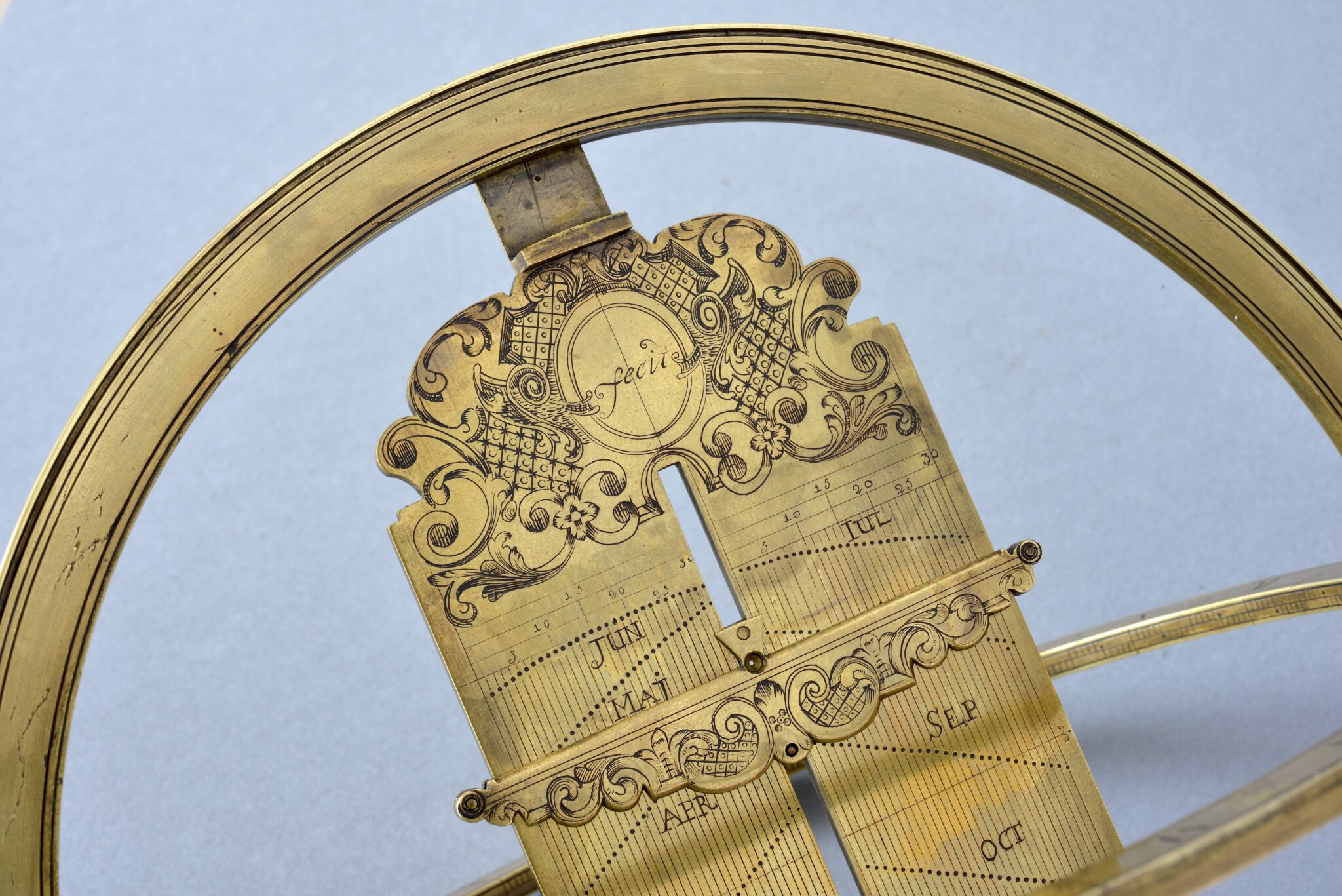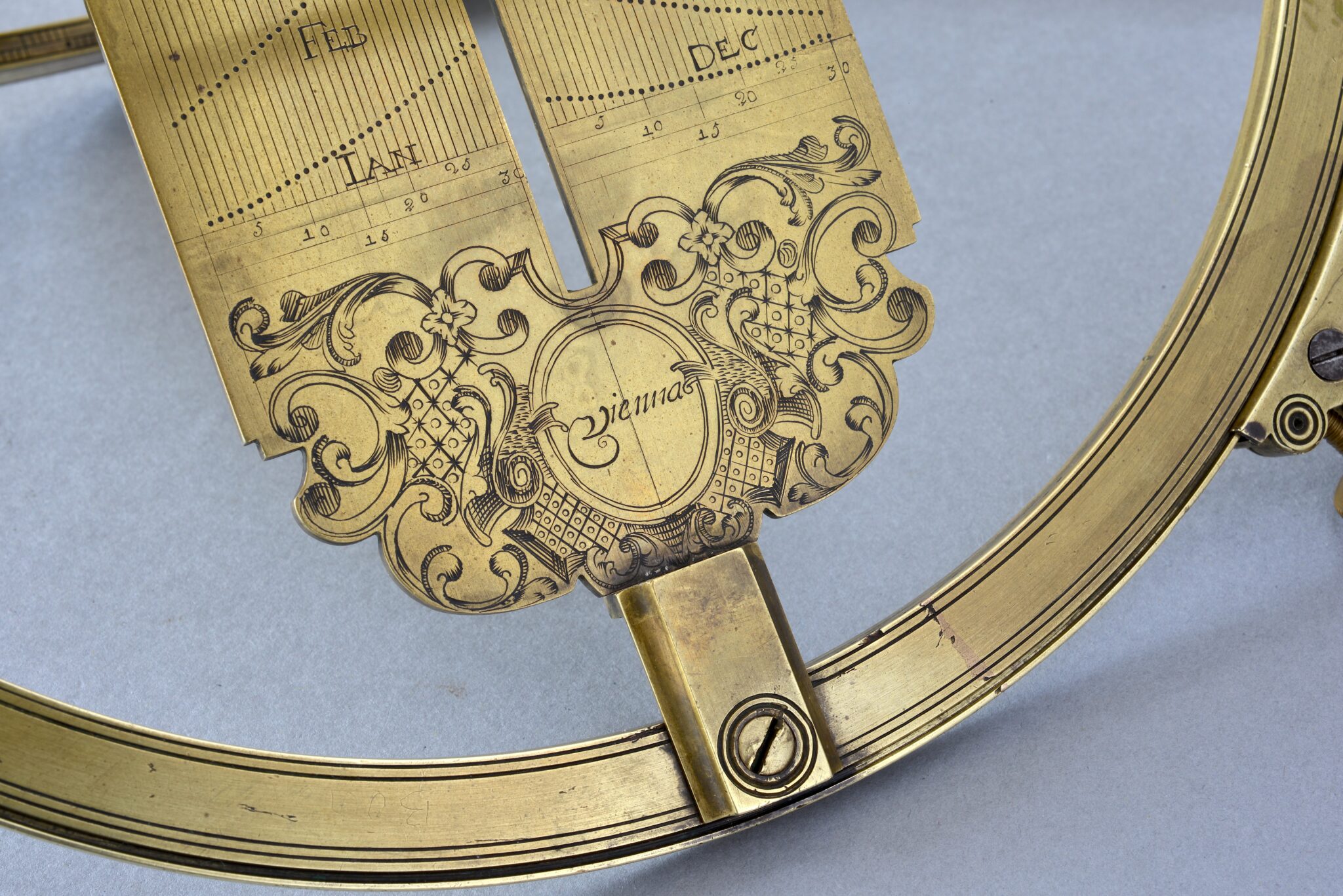 Large brass equinoctial ring dial with two rings and wide central bridge with slider. It is fitted with a mobile throne topped by a ring. In addition to the usual numerals, it contains rare inscriptions in Arabic (probably for the Ottoman market).
