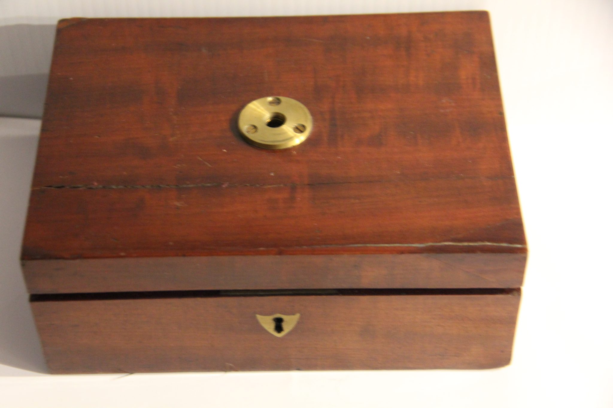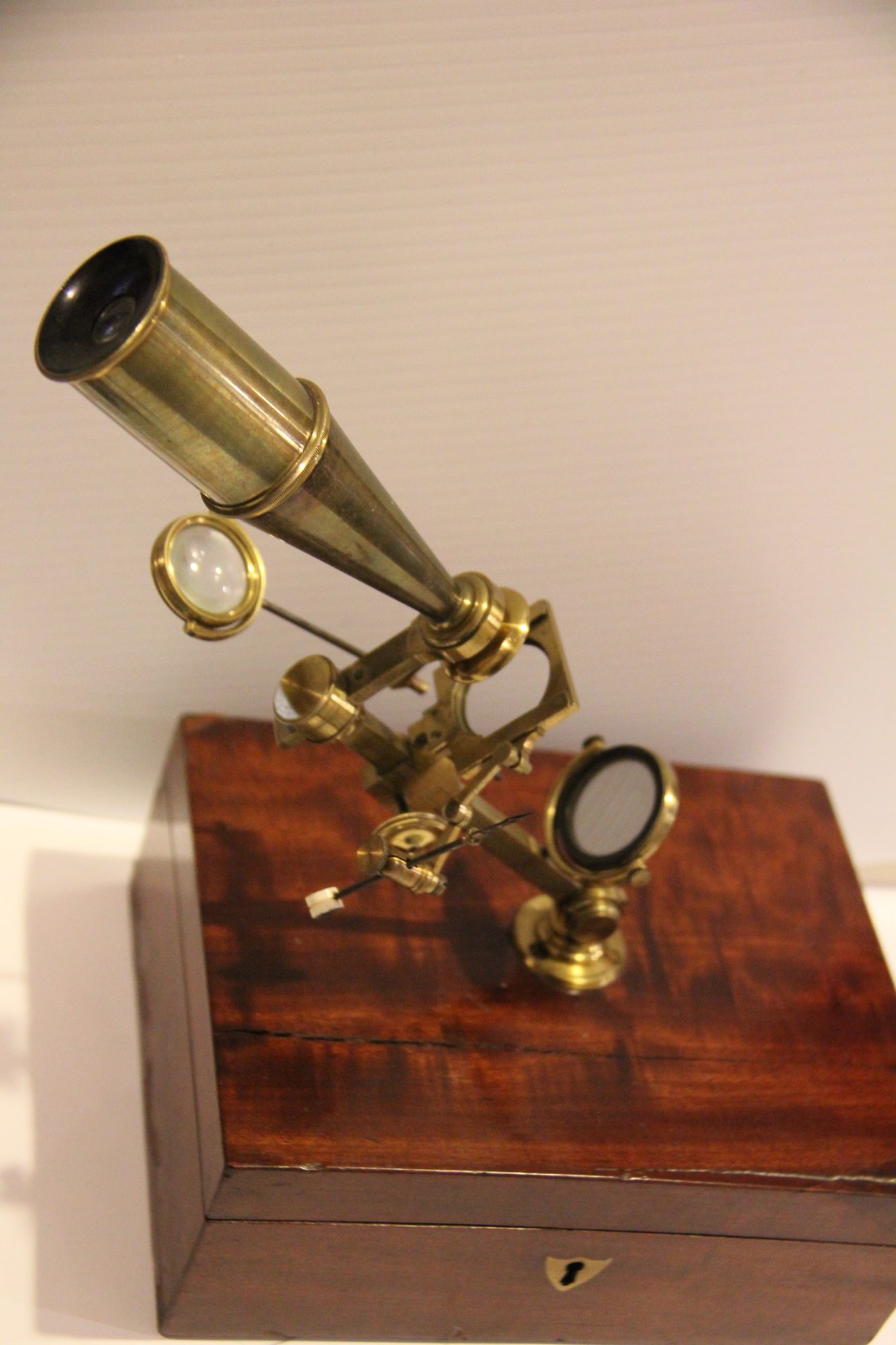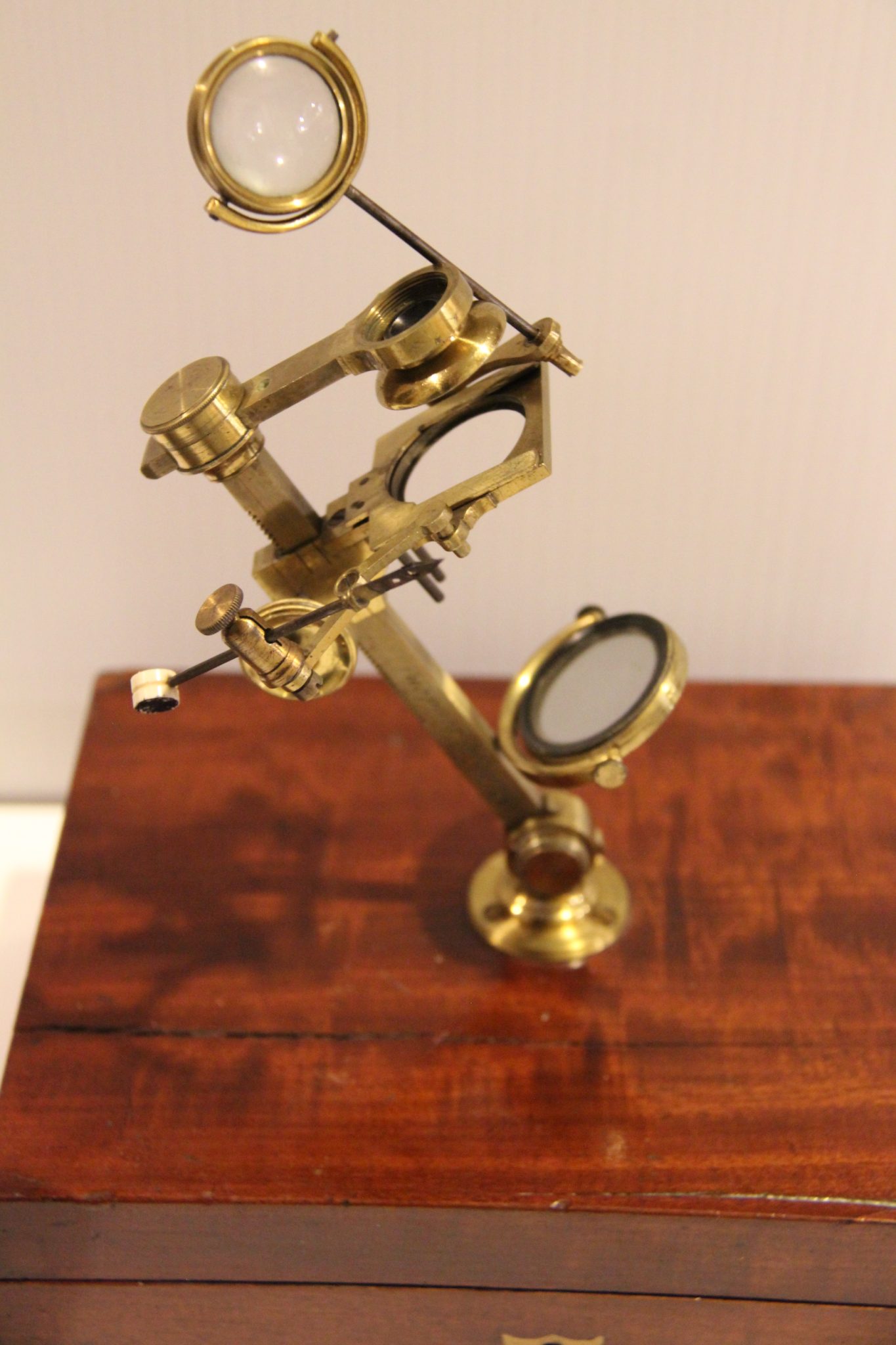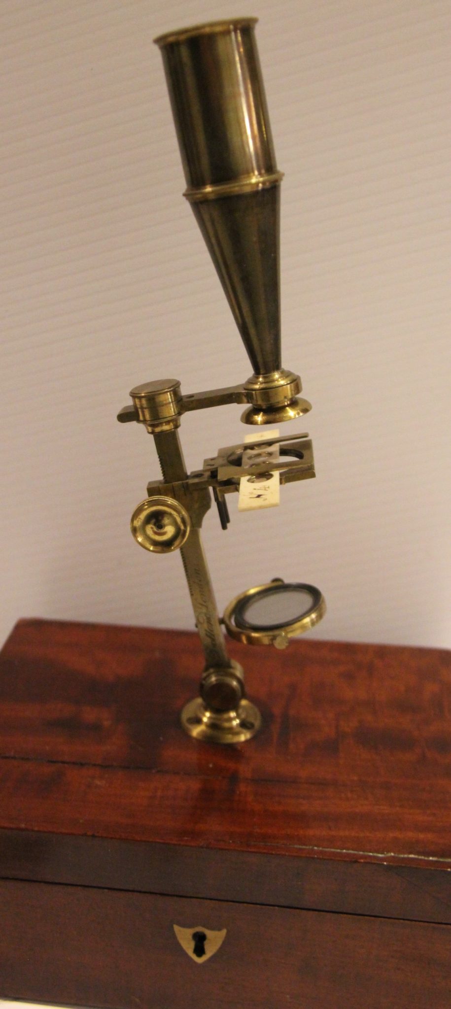 The mahogany case has a functional lock (no key-working on it) and when mounted the microscope stands 14 inches tall. Very much like a down sized Jones Most Improved microscope without the folding legs.