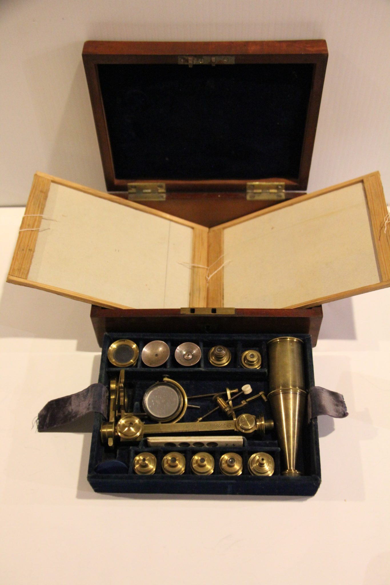 A large and well equipped Gould/Cary simple and compound brass microscope in deep mahogany case 8 x6 x 3 inches.