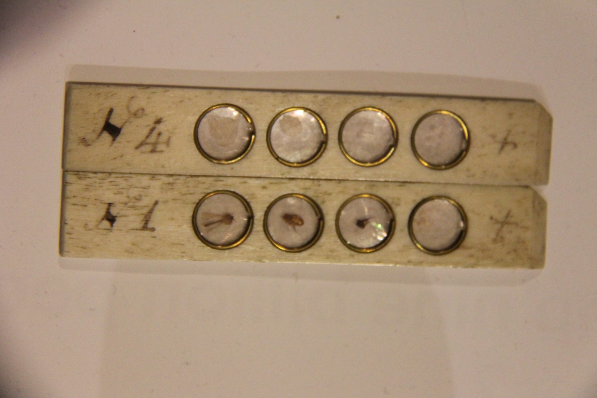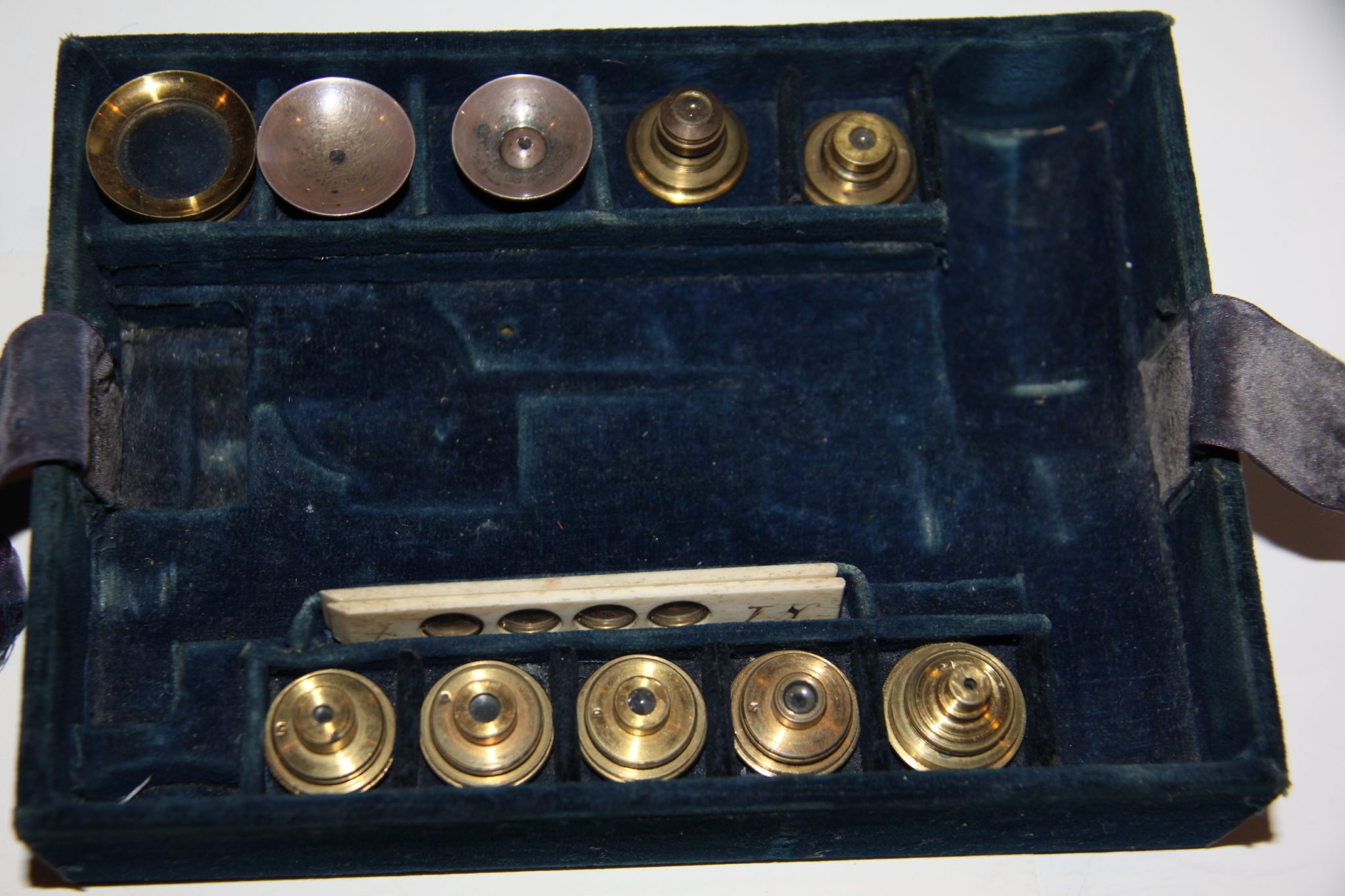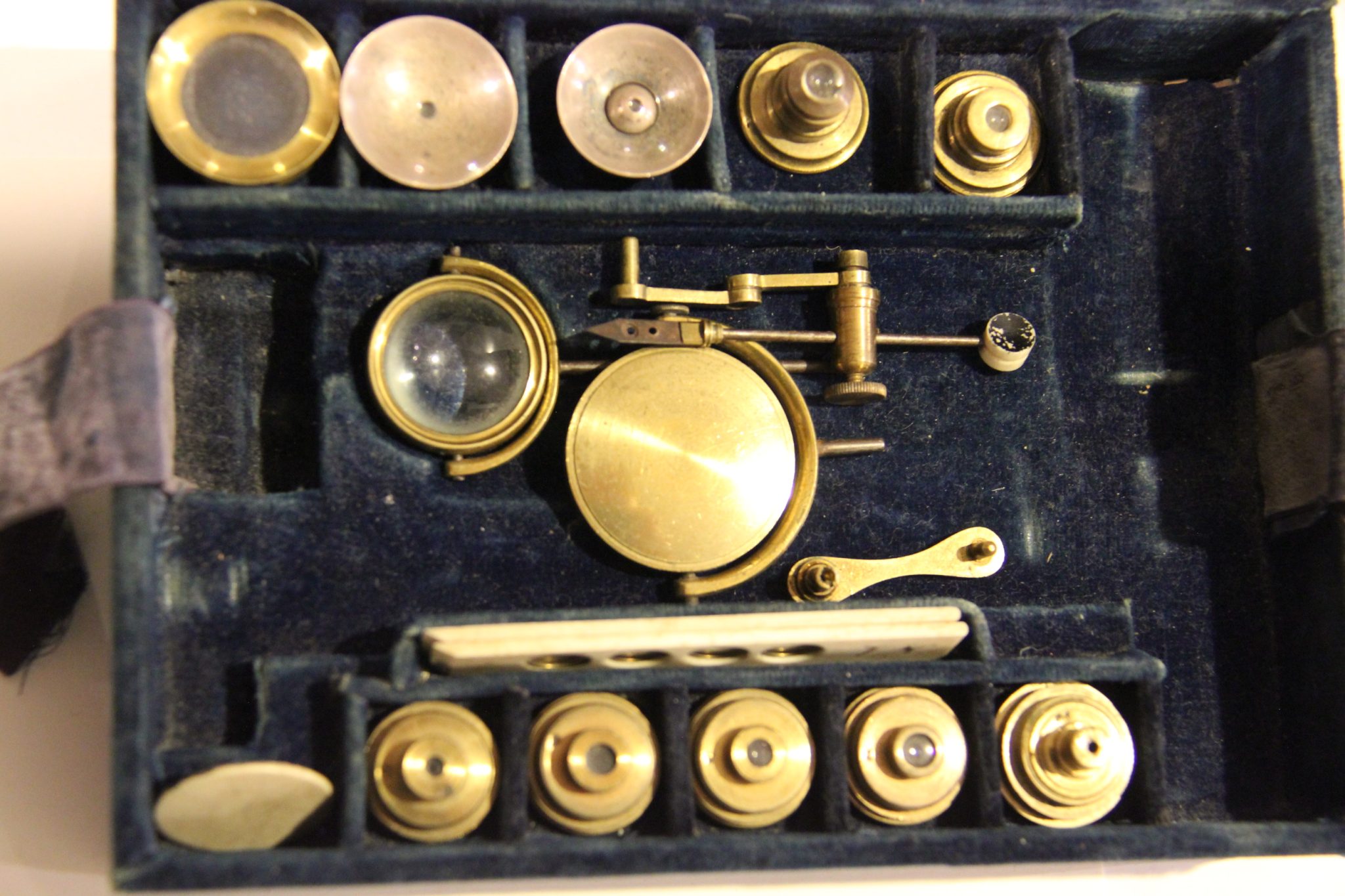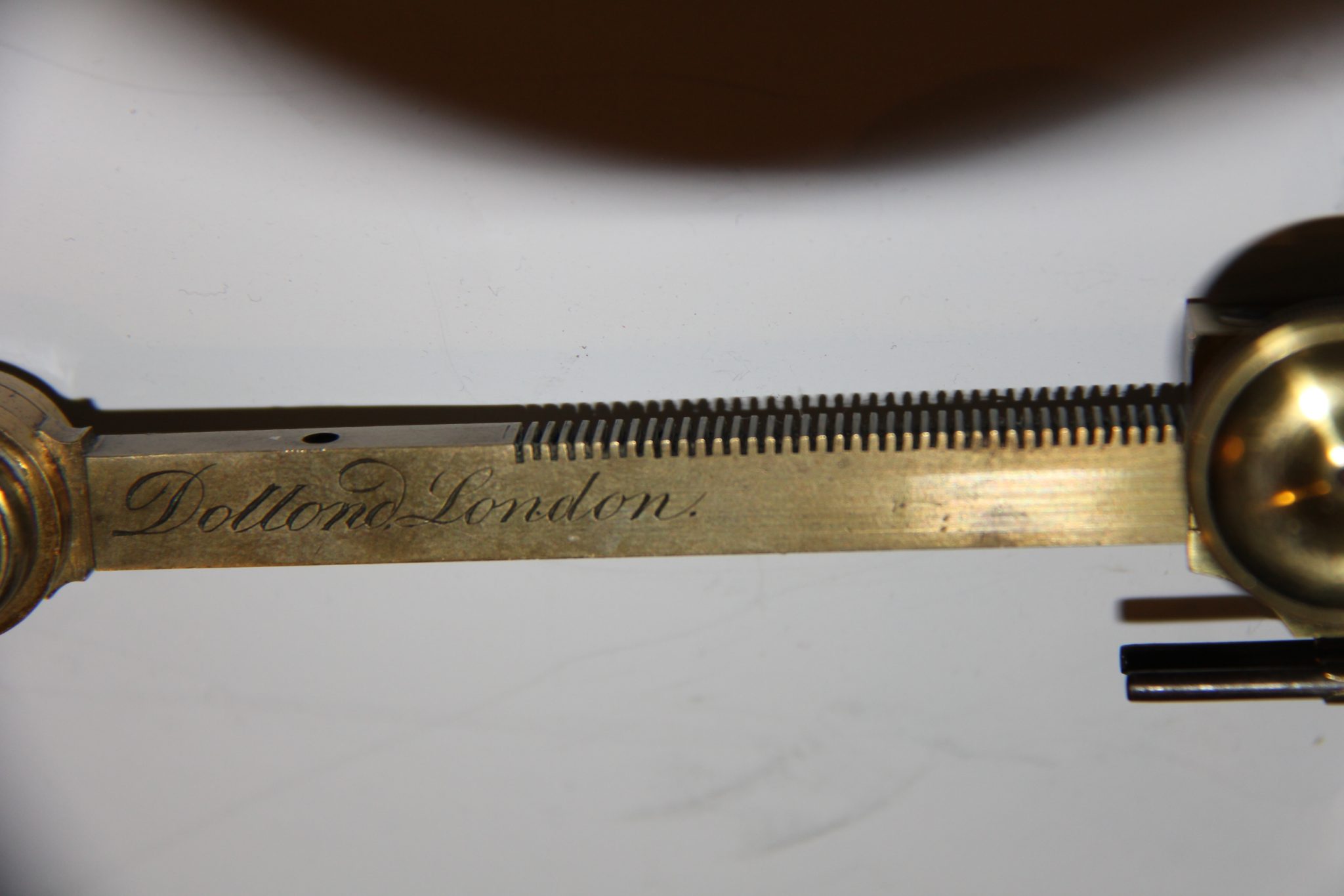 Having 2 blackened and 2 Lieberkuhned objectives for use as a simple microscope and 5 numbered and stacking objectives (bead for number 1 lacking) for compound use, this microscope was obviously a special order. Signed Dollond, London in flowing script.