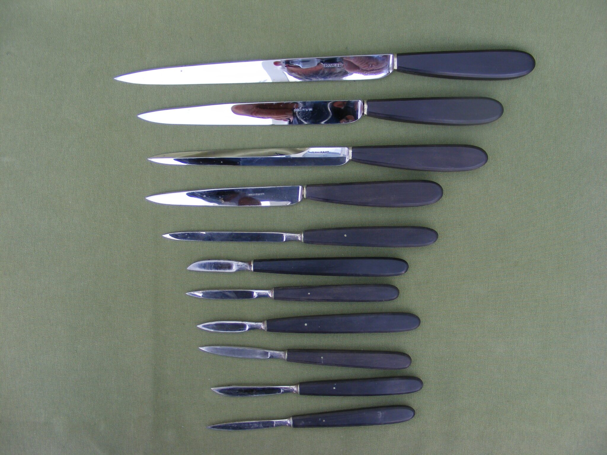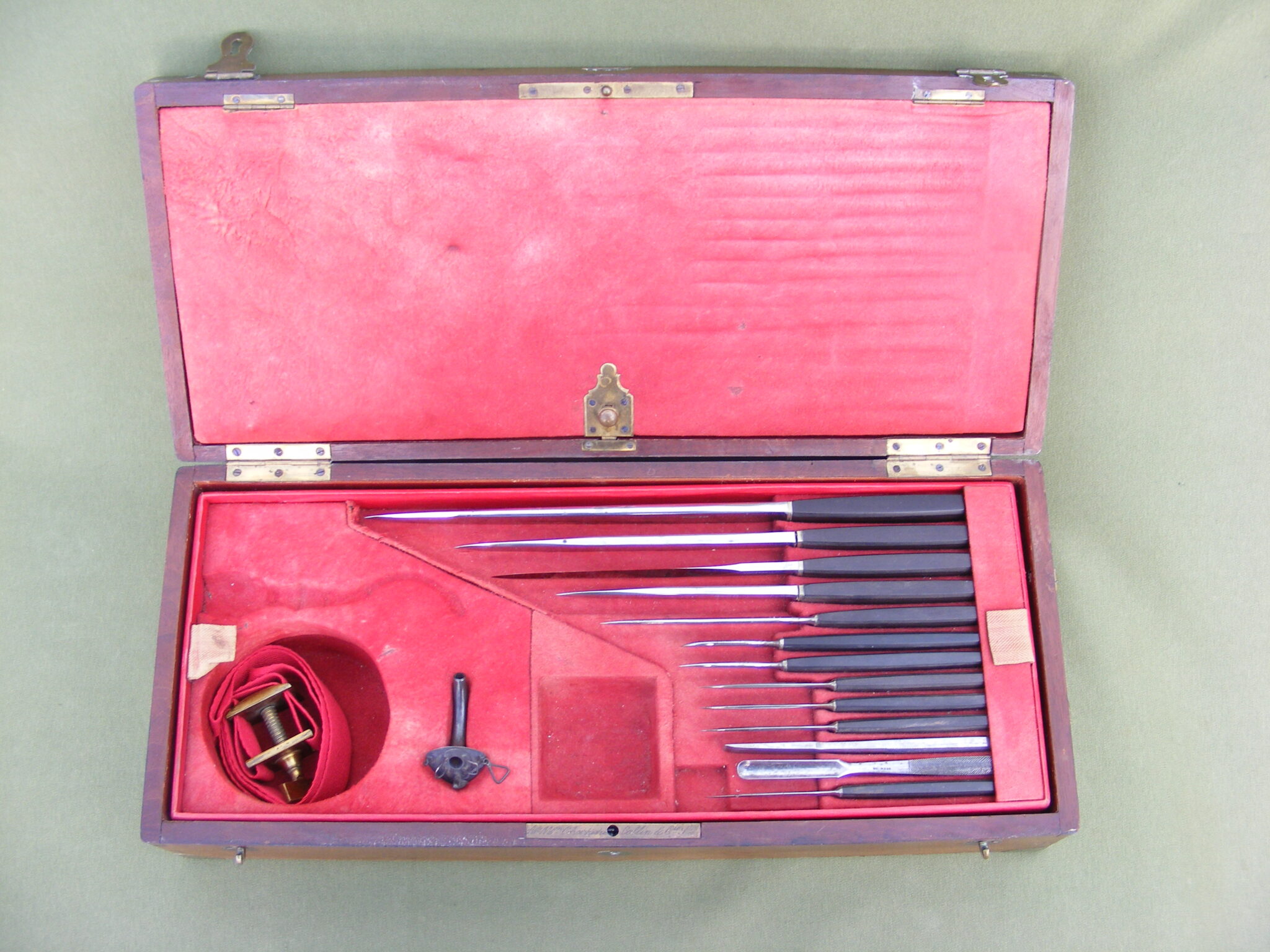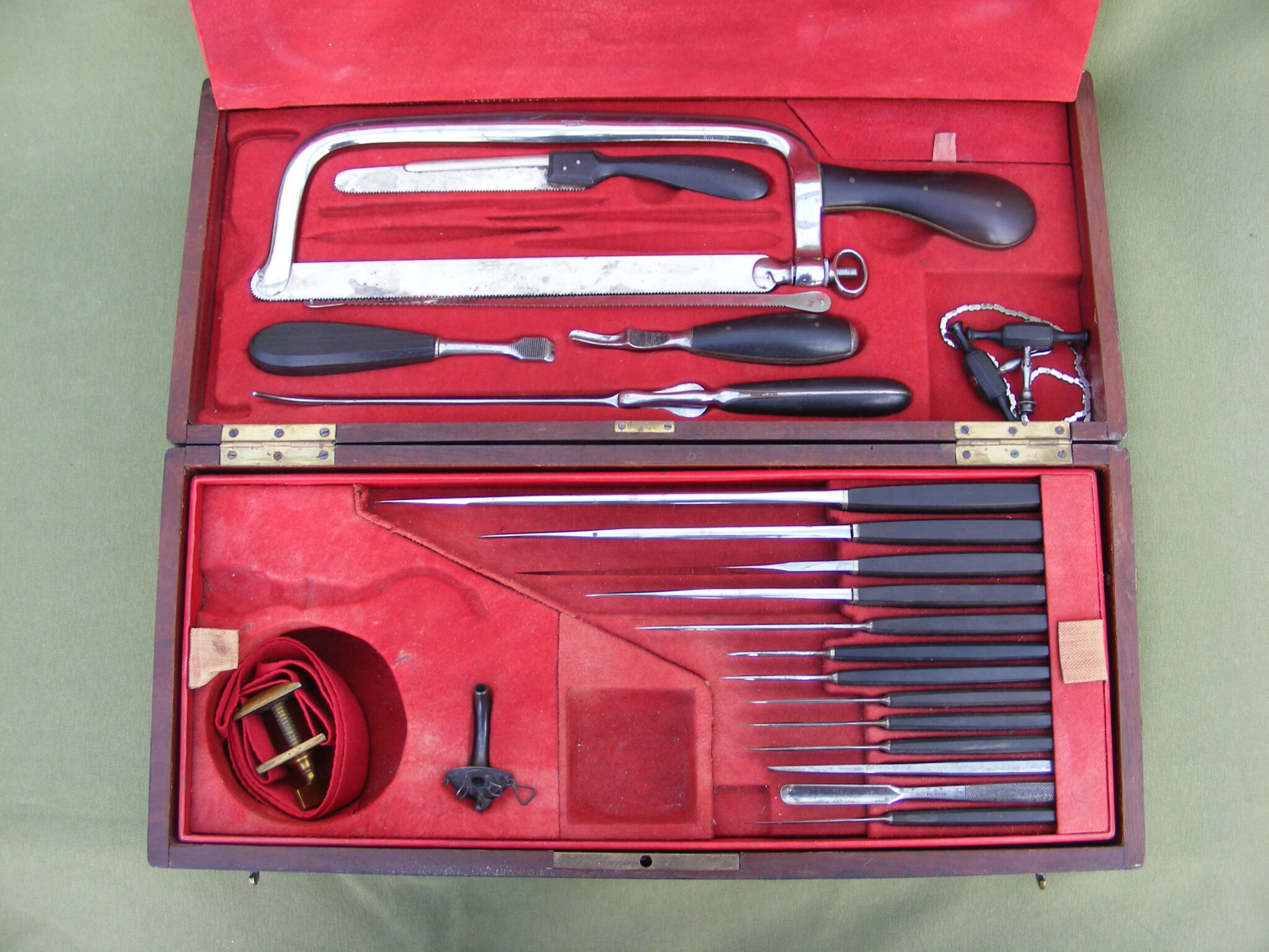GOOD THREE LAYER CASE OF SURGICAL INSTRUMENTS FOR TREPANNING, AMPUTATIONS, TRACHEOTOMY, ETC. GOOD SET OF LISTON KNIVES AND SCALPELS ETC. ALL SIGNED INSTRUMENTS SIGNED: COLLIN & CO. NOT THE TOURNIQUET, THE BOX IS SIGNED: A & Mon CHARRIERE & COLLIN & CO. BRASS BOUND BOX 44 x 19 x 10 CM. FAIRLY COMPLETE WITH
