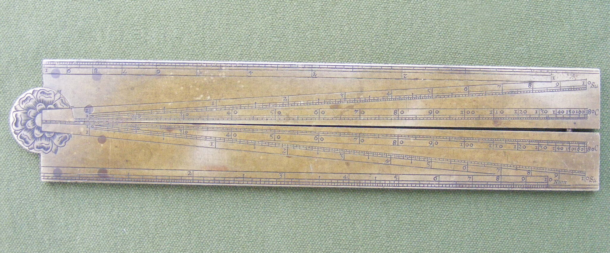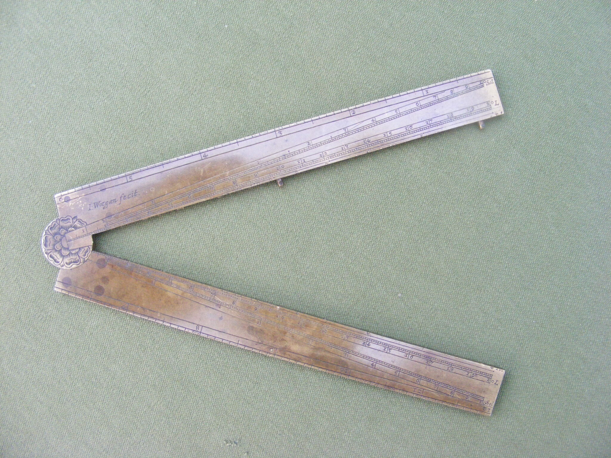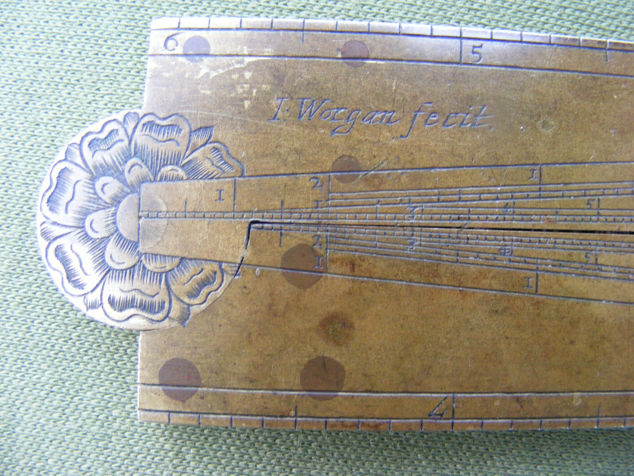 VERY GOOD BRASS SECTOR SIGNED: J WORGAN. FECIT. 6.3/4" OVERALL. WITH NUMEROUS SCALES & LINES COMPRISING OF: CHORDS, NUMBERS, SOLIDS, POLYGONS, LINES AND RARE LINES OF SUPERFICIES SU THESE SCALES WERE RARELY SEEN AFTER 1730. PLEASE NOTE THE TUDOR ROSE EACH SIDE OF THE HINGE. THERE IS A 12" INCH ENGLISH RULE ON THE SECTORS EDGE. GOOD COLOUR & ENGRAVING. JOHN WORGAN 1682-1700. SIX RIVET CONSTRUCTION.