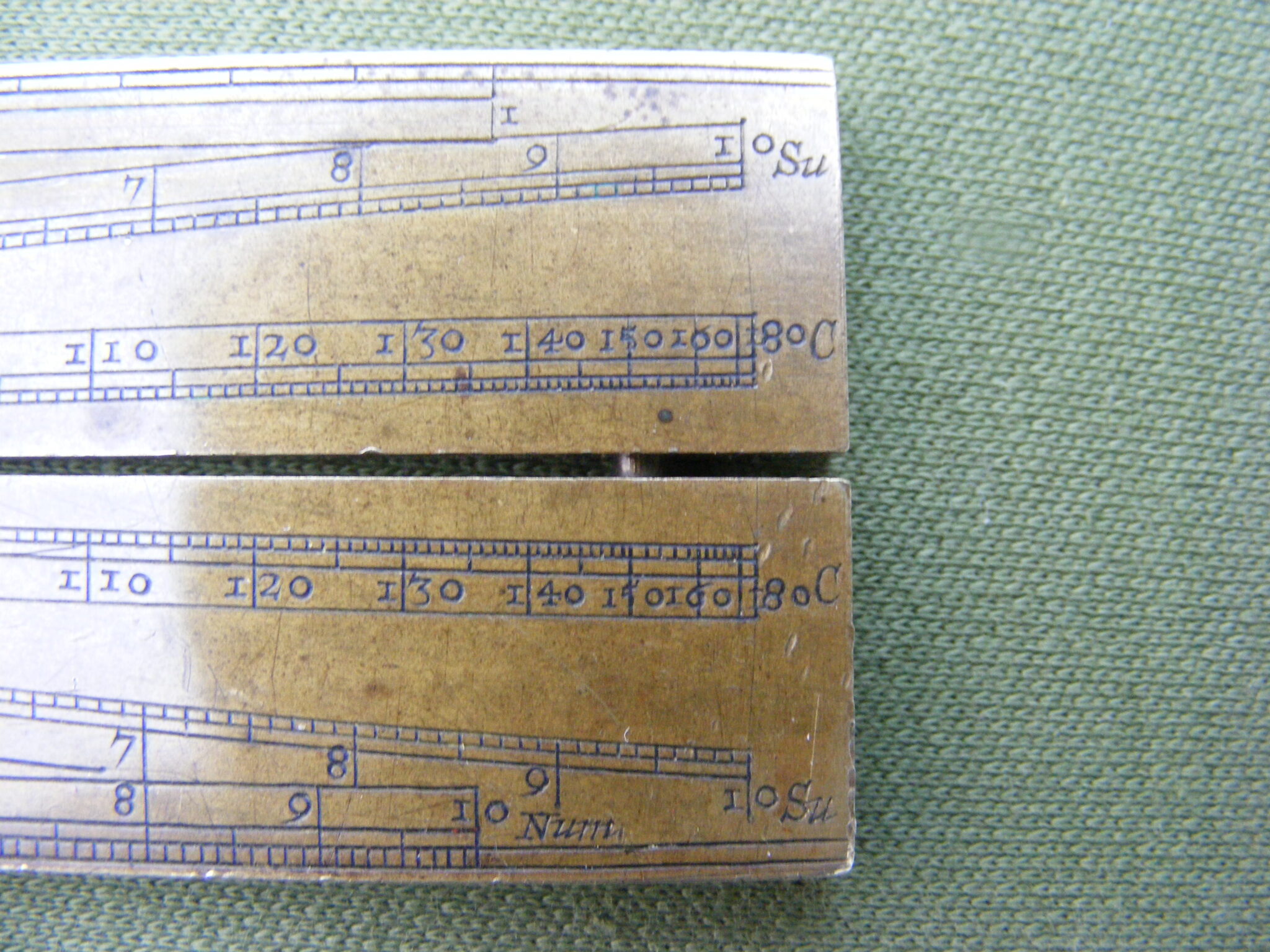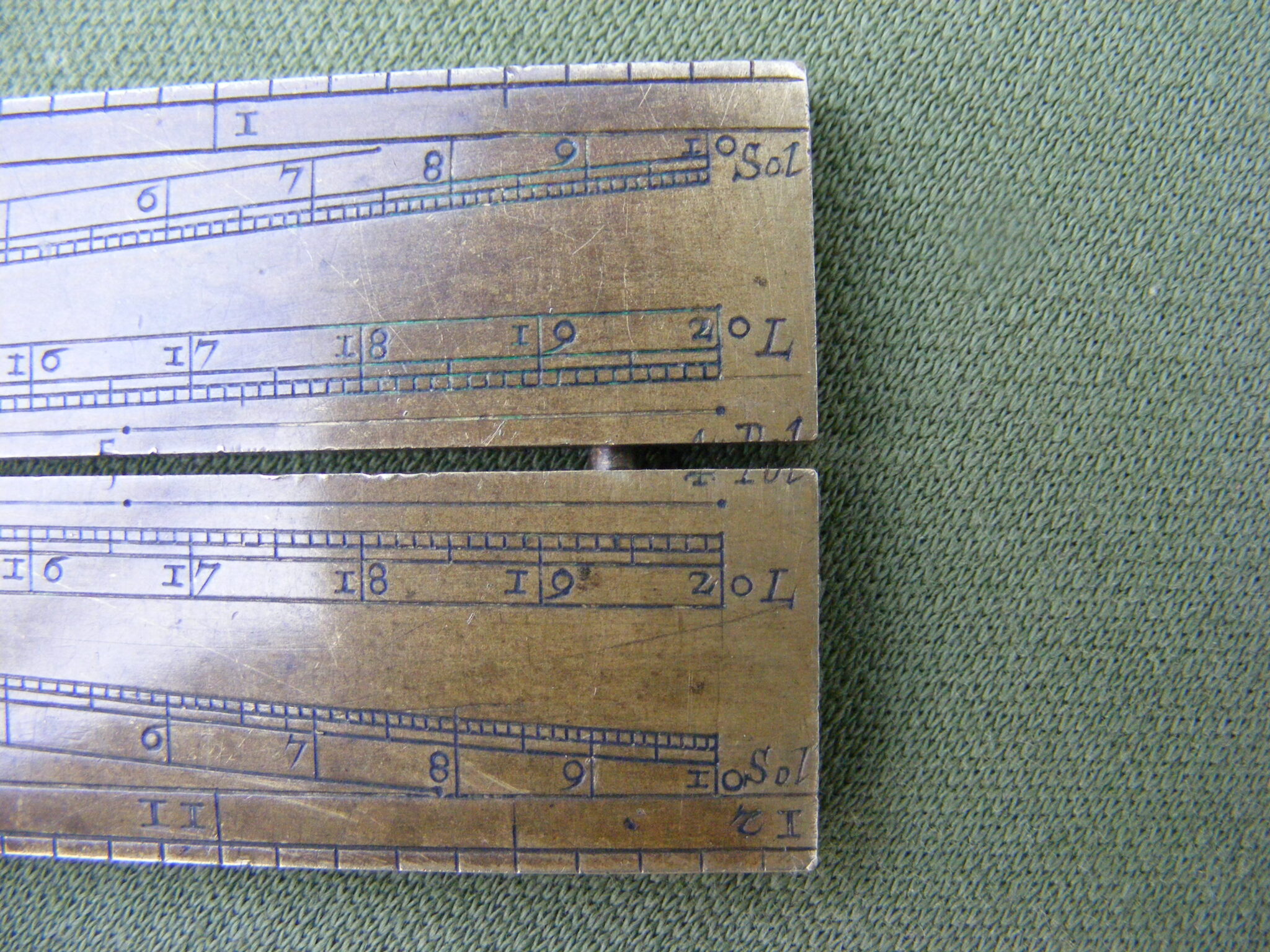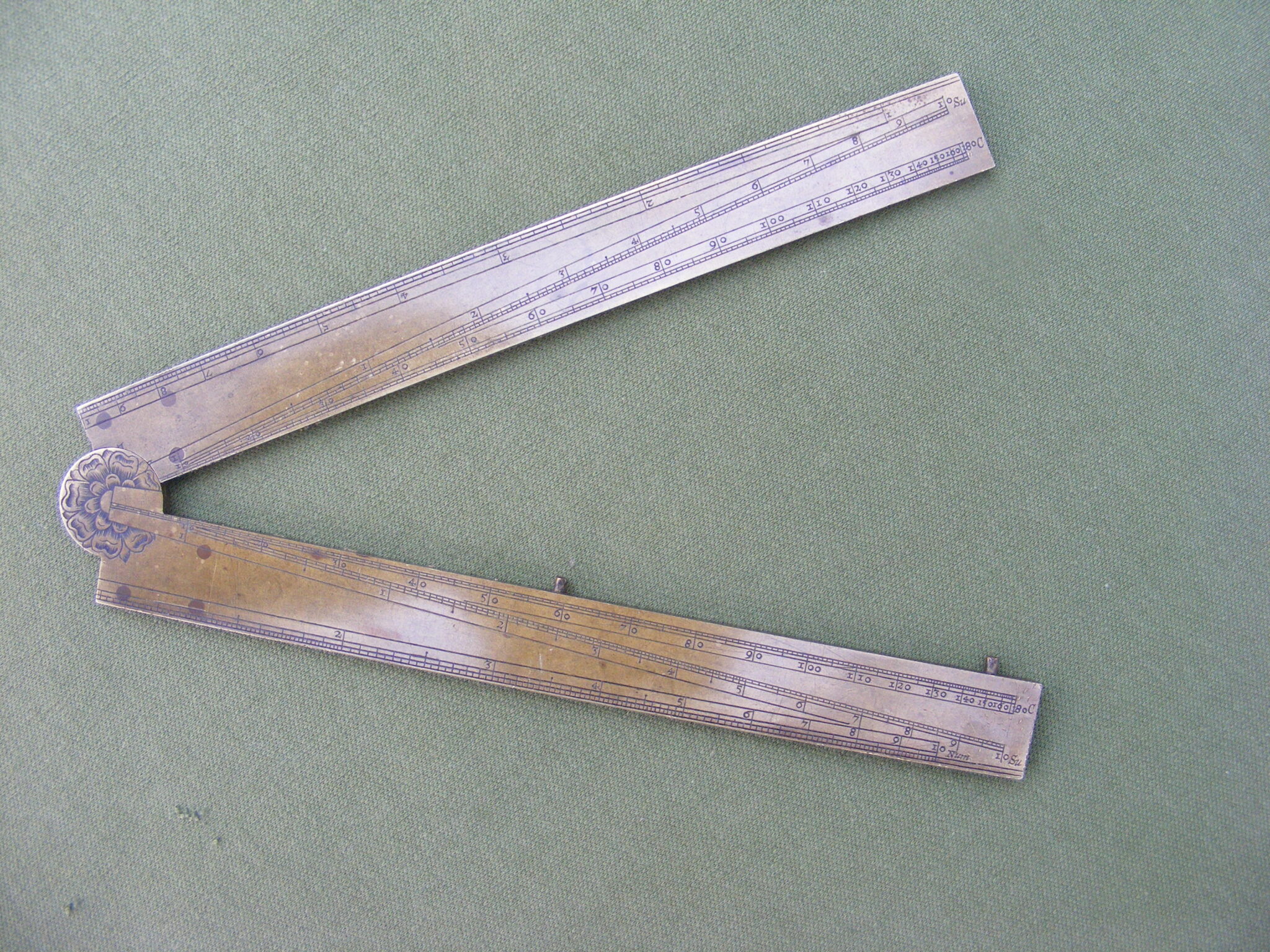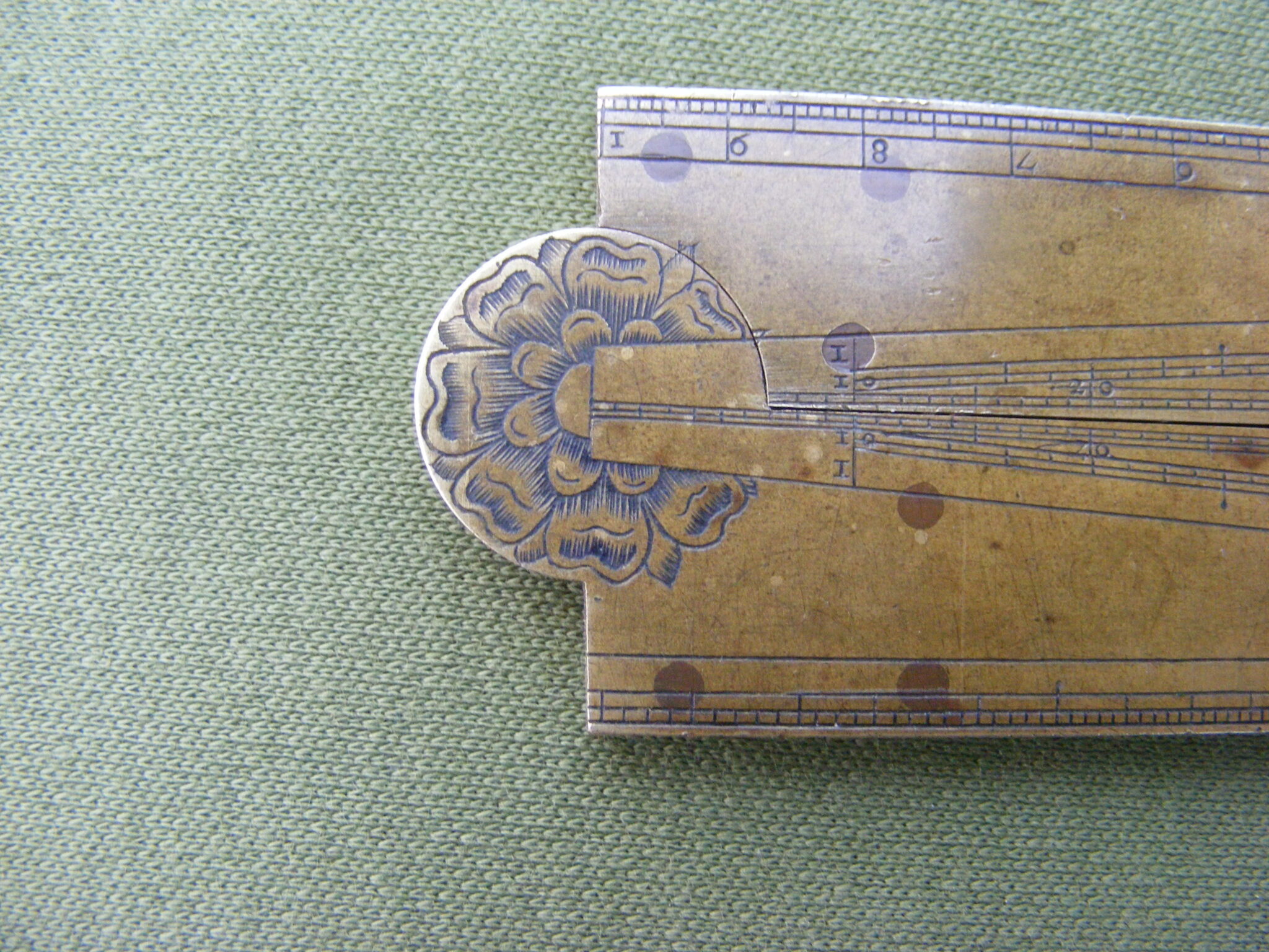 VERY GOOD BRASS SECTOR SIGNED: J WORGAN. FECIT. 6.3/4" OVERALL. WITH NUMEROUS SCALES & LINES COMPRISING OF: CHORDS, NUMBERS, SOLIDS, POLYGONS, LINES AND RARE LINES OF SUPERFICIES SU THESE SCALES WERE RARELY SEEN AFTER 1730. PLEASE NOTE THE TUDOR ROSE EACH SIDE OF THE HINGE. THERE IS A 12" INCH ENGLISH RULE ON THE SECTORS EDGE. GOOD COLOUR & ENGRAVING. JOHN WORGAN 1682-1700. SIX RIVET CONSTRUCTION.