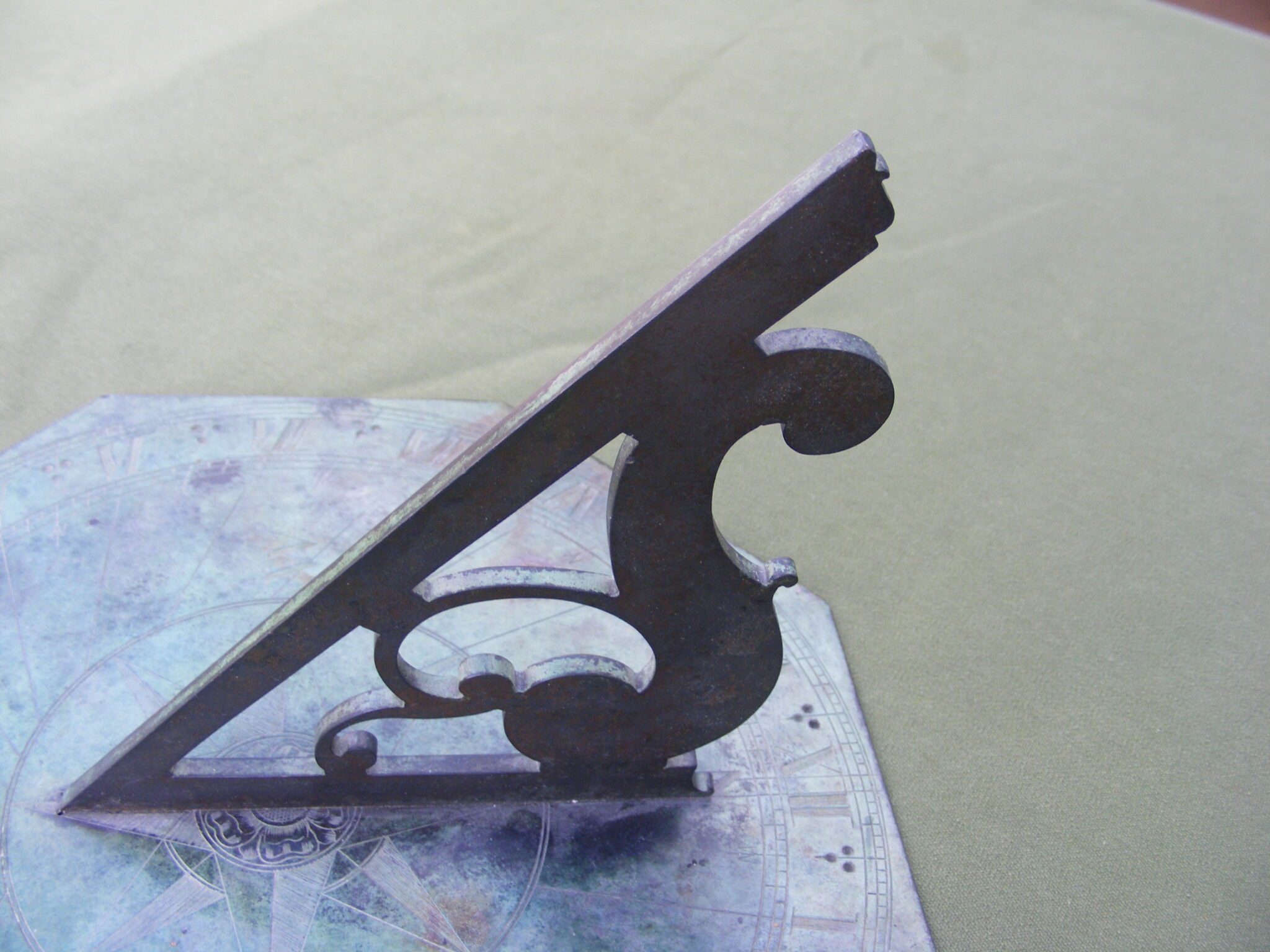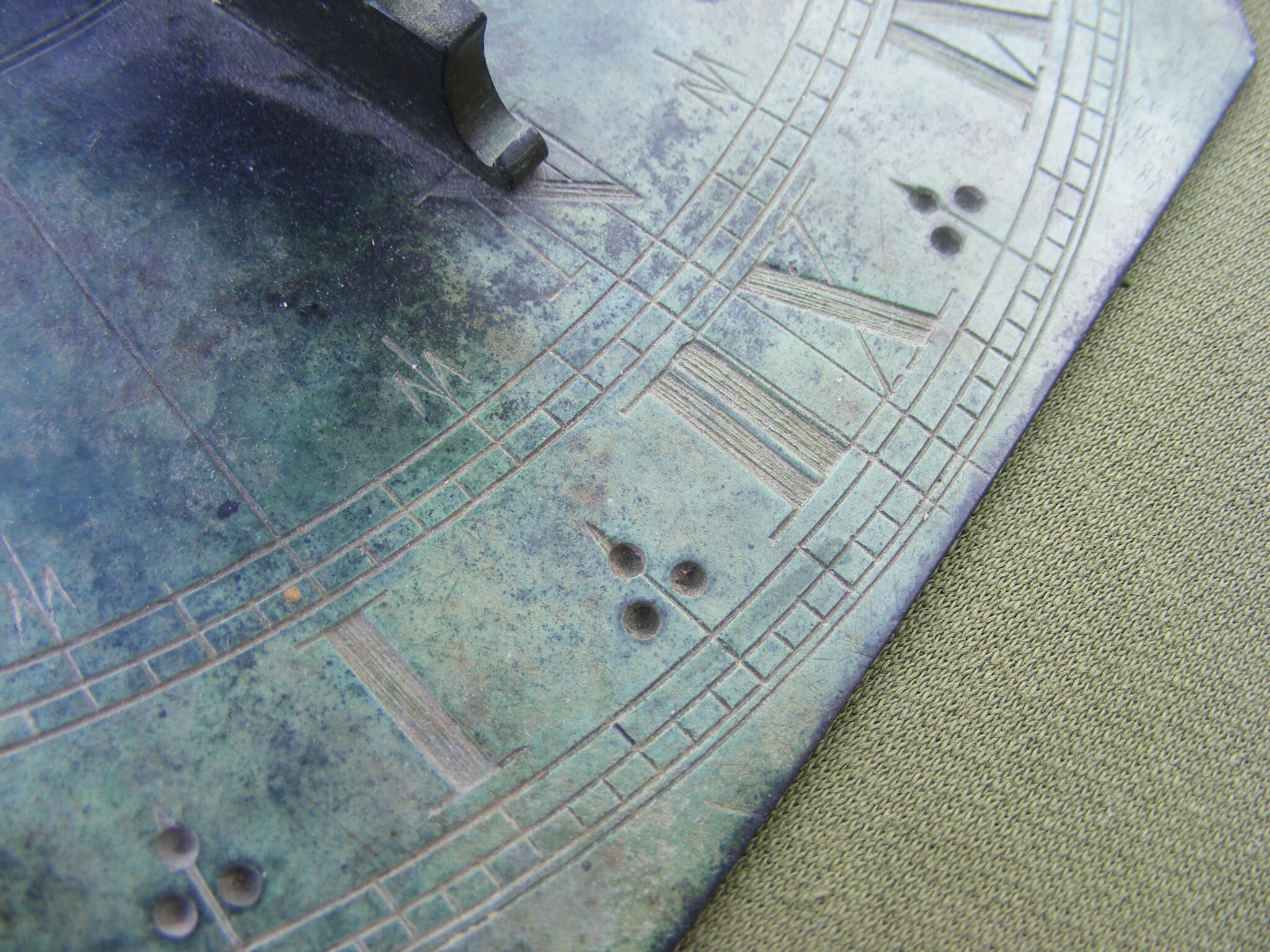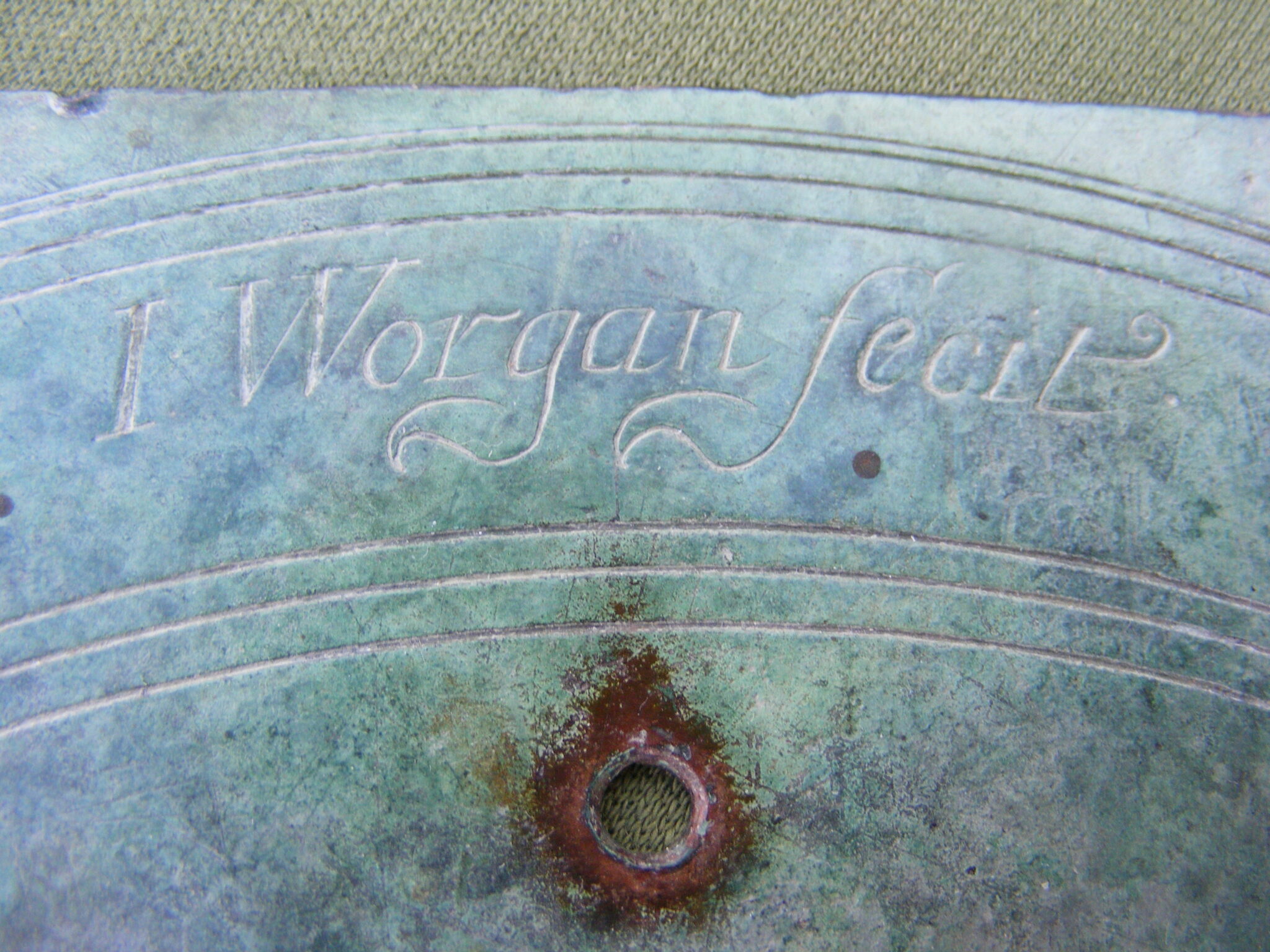 EARLY ENGLISH HORIZONTAL BRONZE SUNDIAL SIGNED : J WORGAN. FECIT. CHAPTER RING 10" INCHES, PIERCED GNOMON, GOOD ENGRAVING, COLOUR & PATINA. WORGAN W.1782-1700 LATITUDE 51 DEGREES N. APPROX. PLEASE NOTE