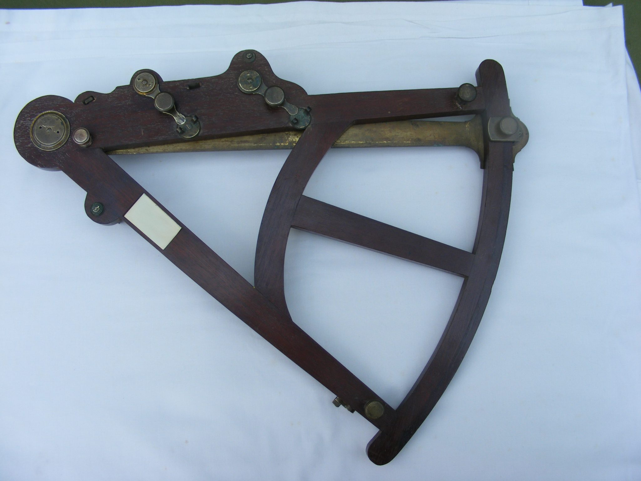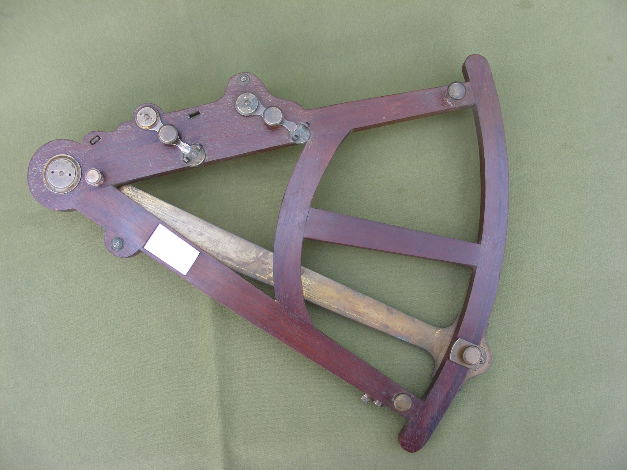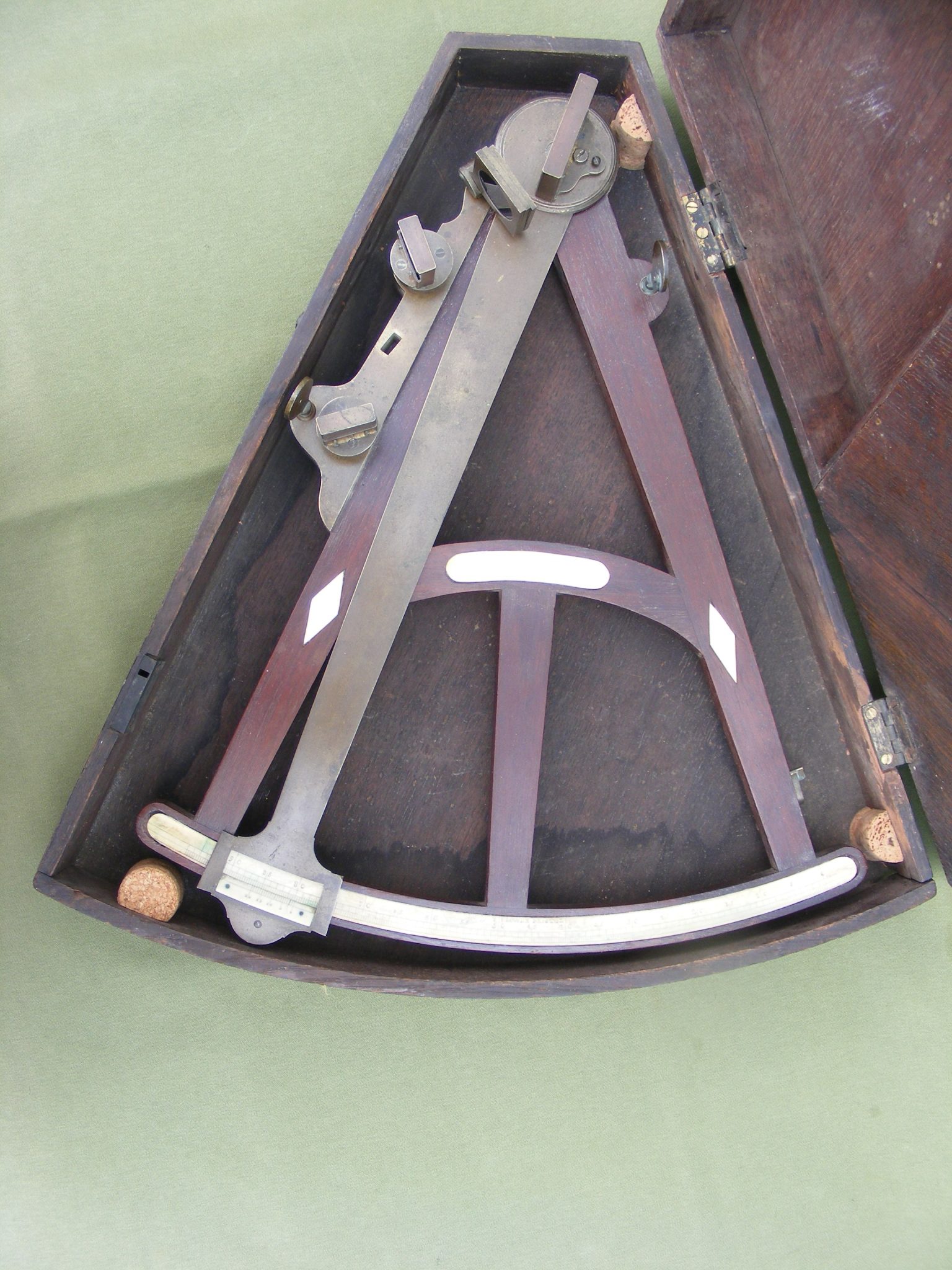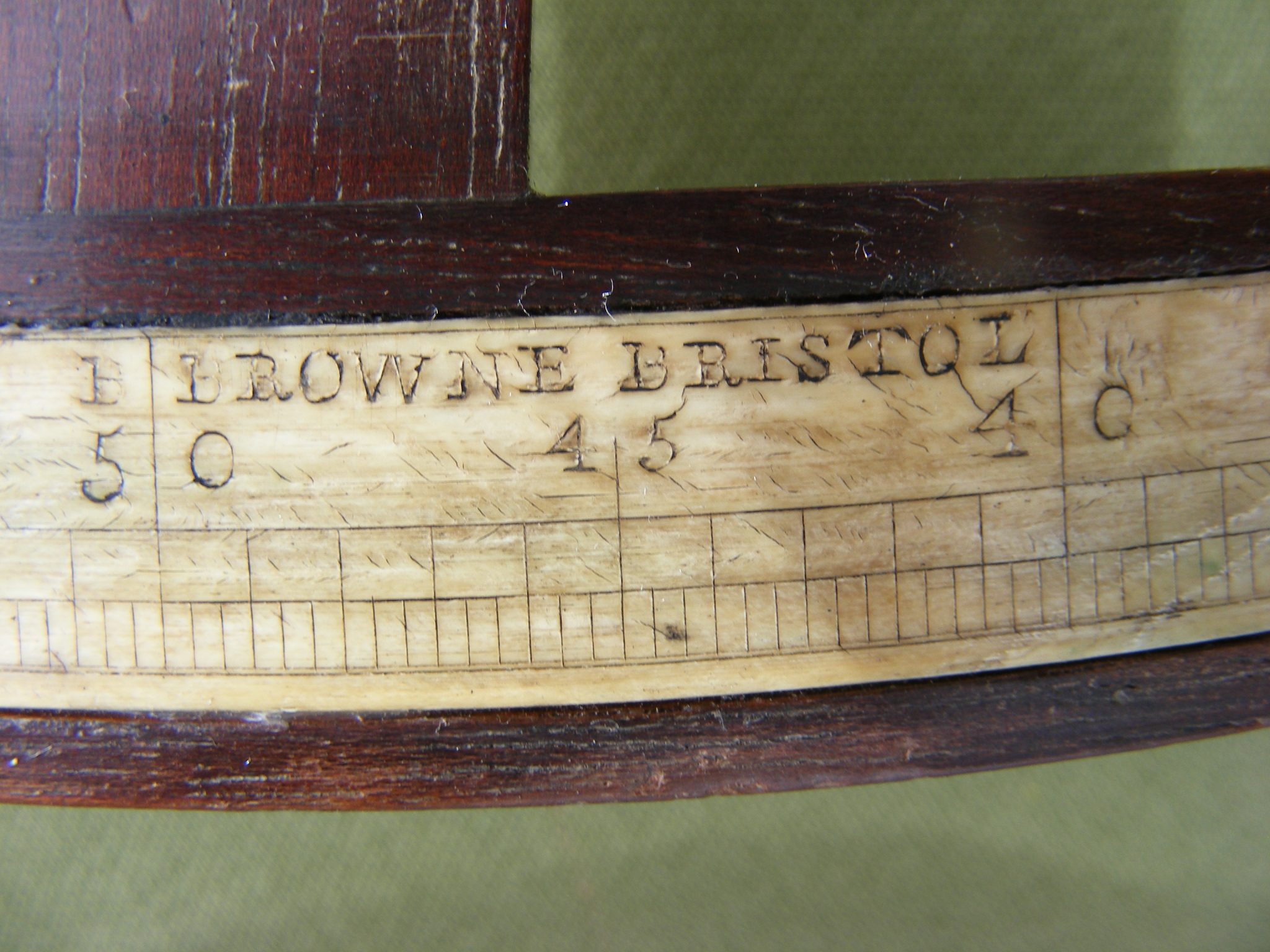 GOOD LARGE ENGLISH MAHOGANY OCTANT SIGNED: B BROWNE. BRISTOL. INDEX ARM 17" INCHES LONG, 15" INCH RADIUS, SCALE 0 TO 97 DEGREES IN 20' MINUTE DIVISIONS, VERNIER READ TO 1' MINUTE OF ARC, INTERCHANGEABLE FILTERS USUAL ONE GREEN & TWO RED. IN ORIGINAL OAK STEPPED BOX.