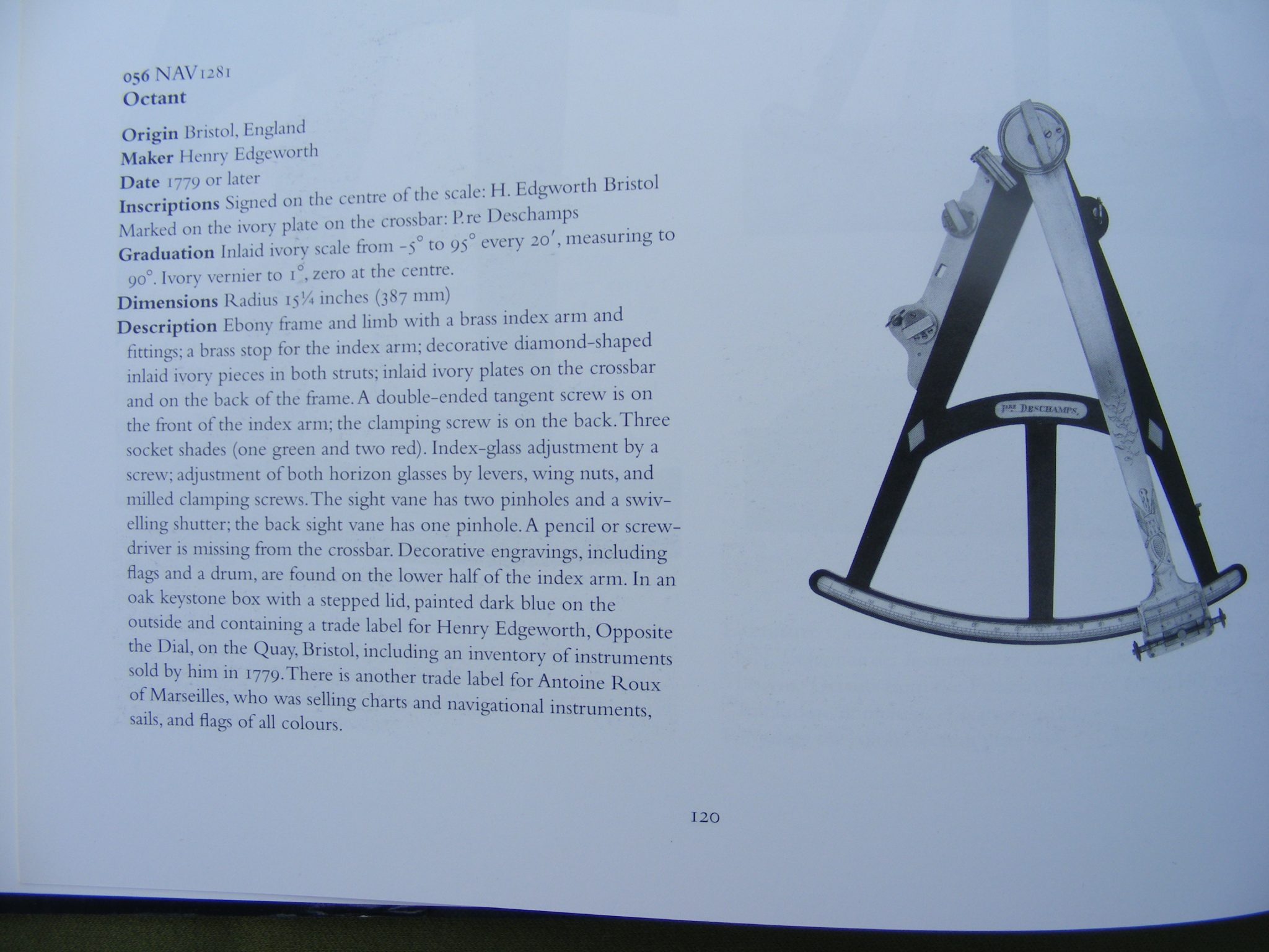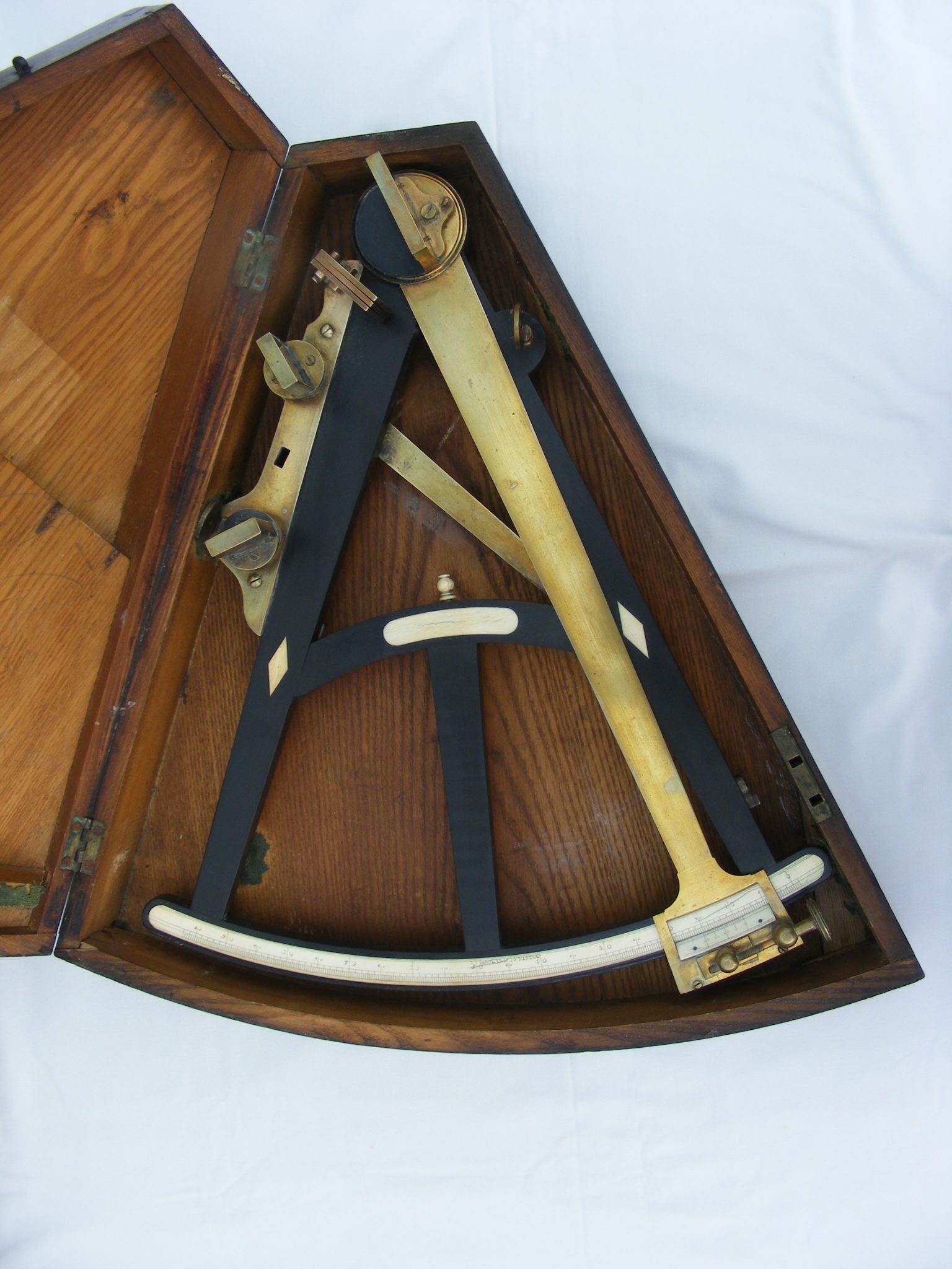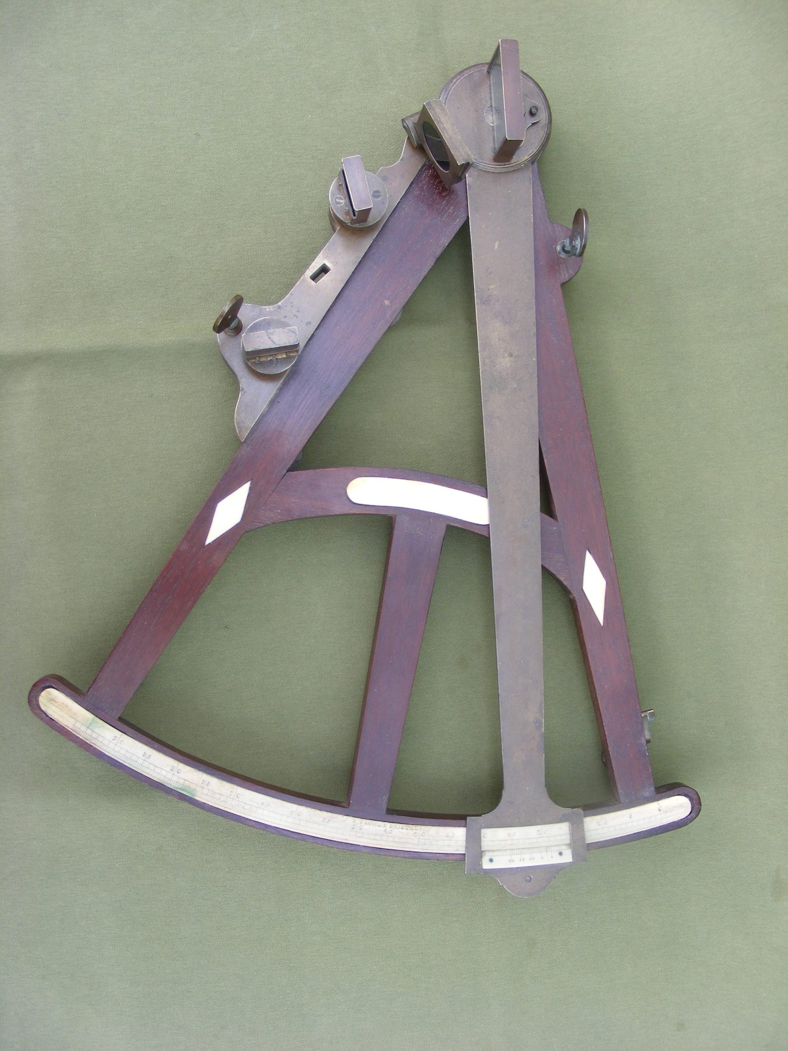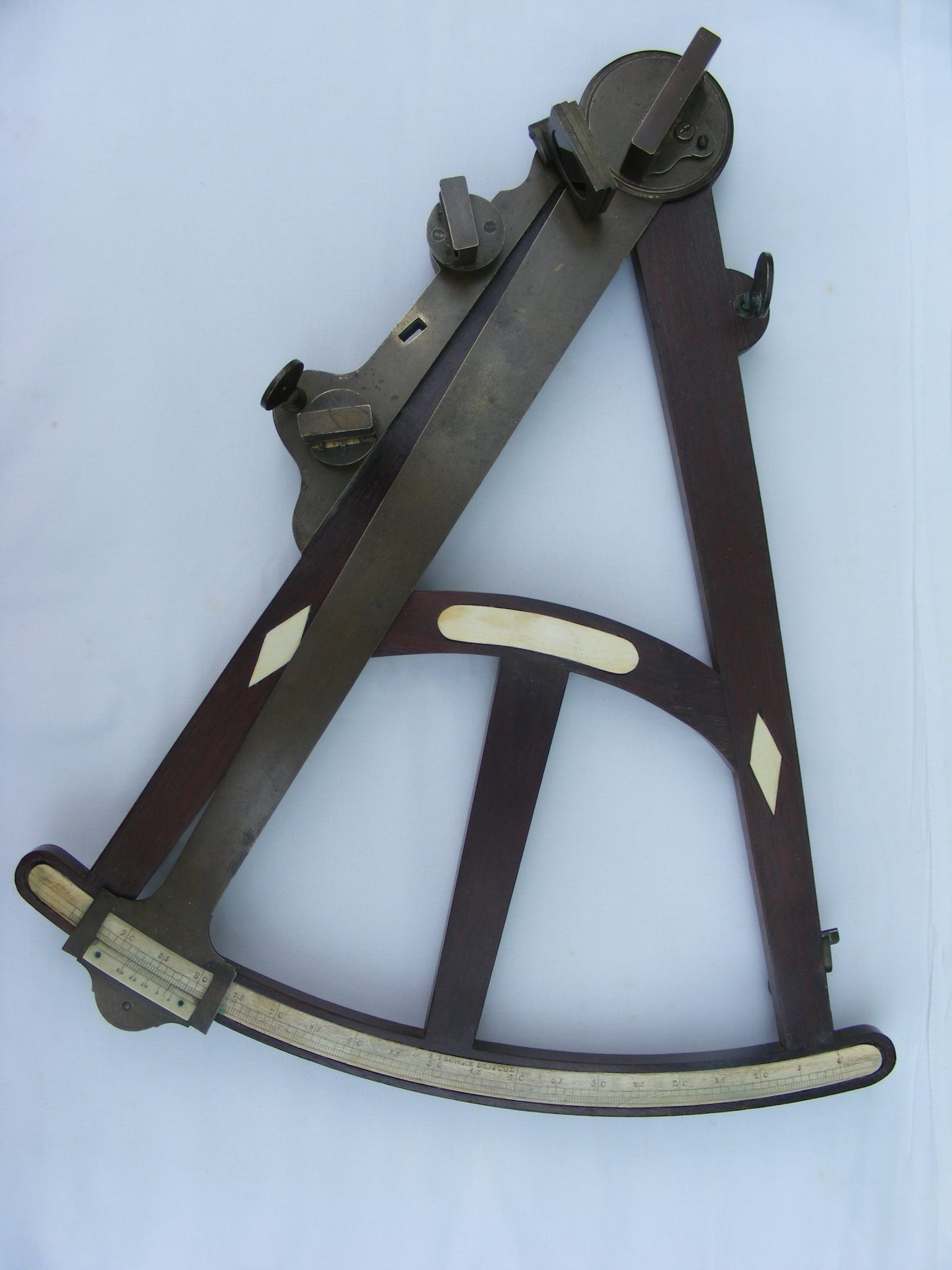 GOOD LARGE ENGLISH MAHOGANY OCTANT SIGNED: B BROWNE. BRISTOL. INDEX ARM 17" INCHES LONG, 15" INCH RADIUS, SCALE 0 TO 97 DEGREES IN 20' MINUTE DIVISIONS, VERNIER READ TO 1' MINUTE OF ARC, INTERCHANGEABLE FILTERS USUAL ONE GREEN & TWO RED. IN ORIGINAL OAK STEPPED BOX.