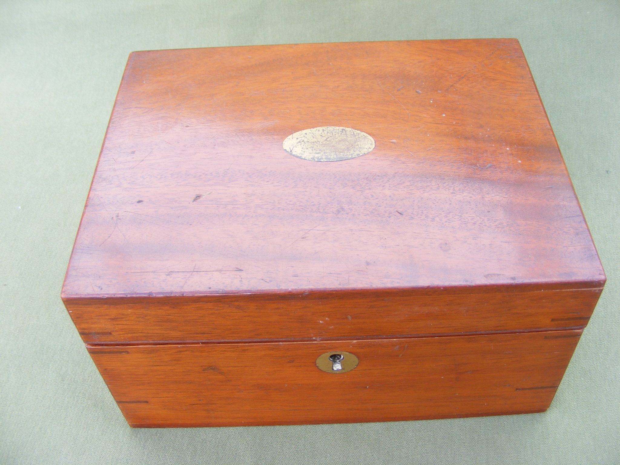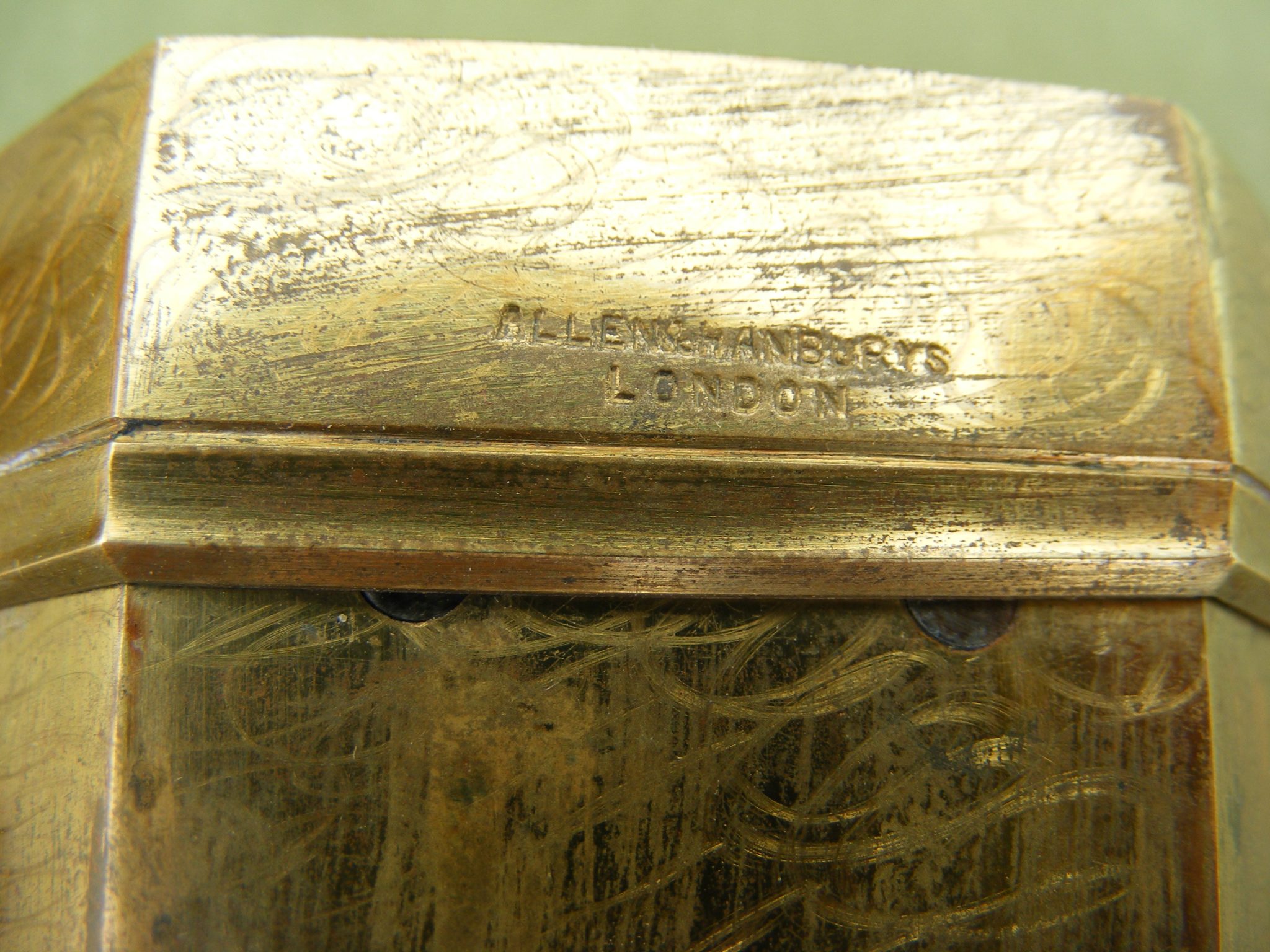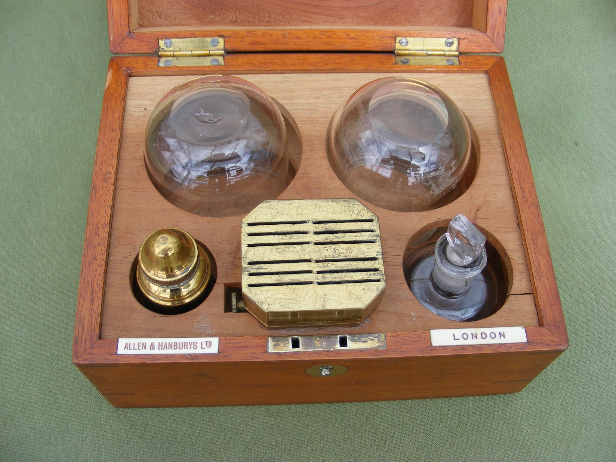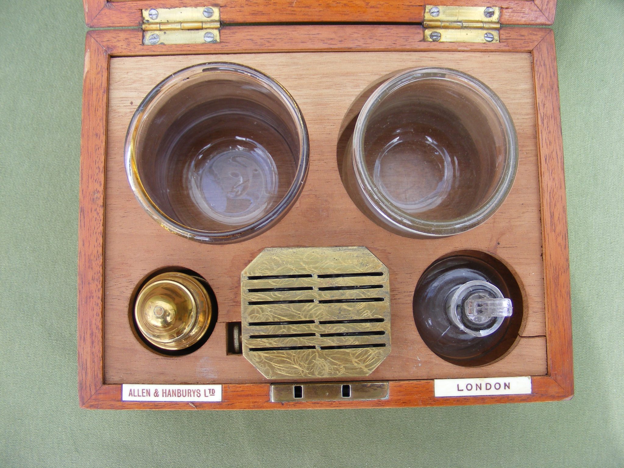 GOOD CUPPING SET SIGNED: ALLEN & HANBURYS. LONDON ON THE BOX & ON THE 12 BLADE SCARIFIER WITH ALL BLADES INTACT, WITH SPIRIT LAMP, SPIRIT FLASK & 2 CUPPING GLASS'S. ALL IN ORIGINAL MAHOGANY BOX 7.1/2" x 6" x 4" INCHES.