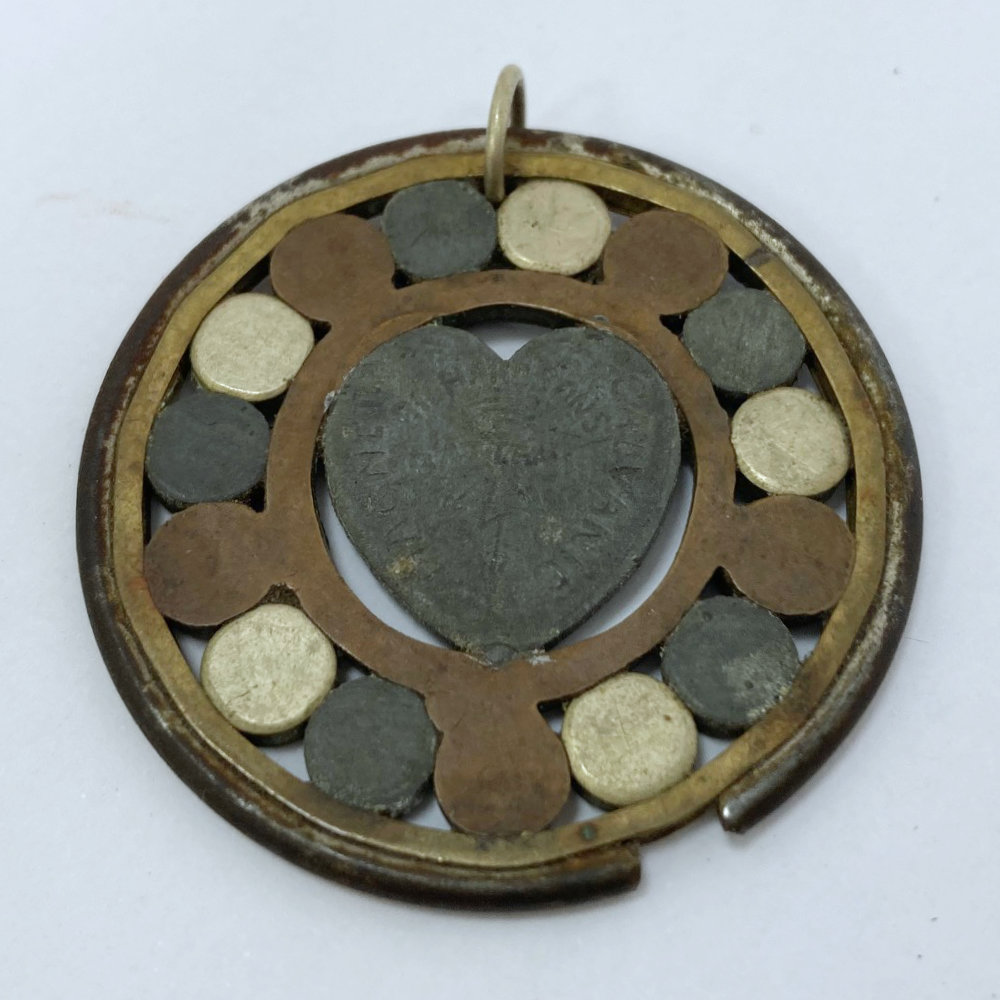 This fascinating Victorian quack medicine device is formed as a medallion comprised of a mixture of metals including nickel, zinc, copper and brass. The medal has concentric rings of metal with a series of circular discs of metal on the inner circle formed around a heart in the centre. The cross is engraved to the front with, “Richardson’s Magneto Galvanic Battery” with lightning bolt motifs in the remaining space to denote the healing qualities of the electrical effects produced by wearing this medical aid when it is activated through the body’s perspiration.