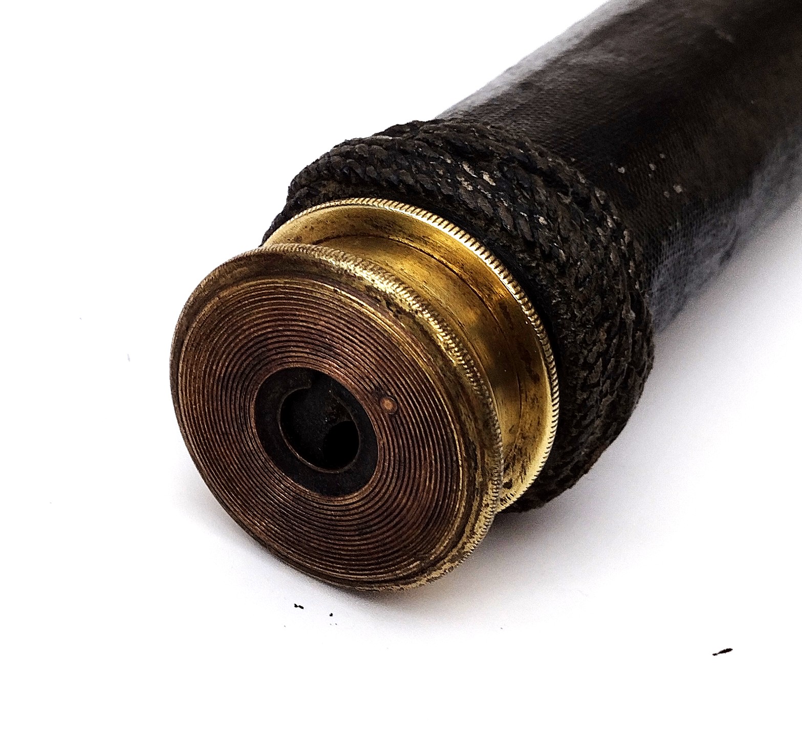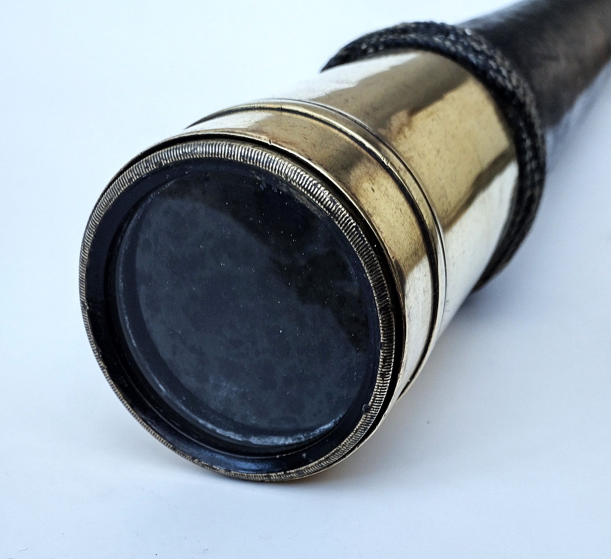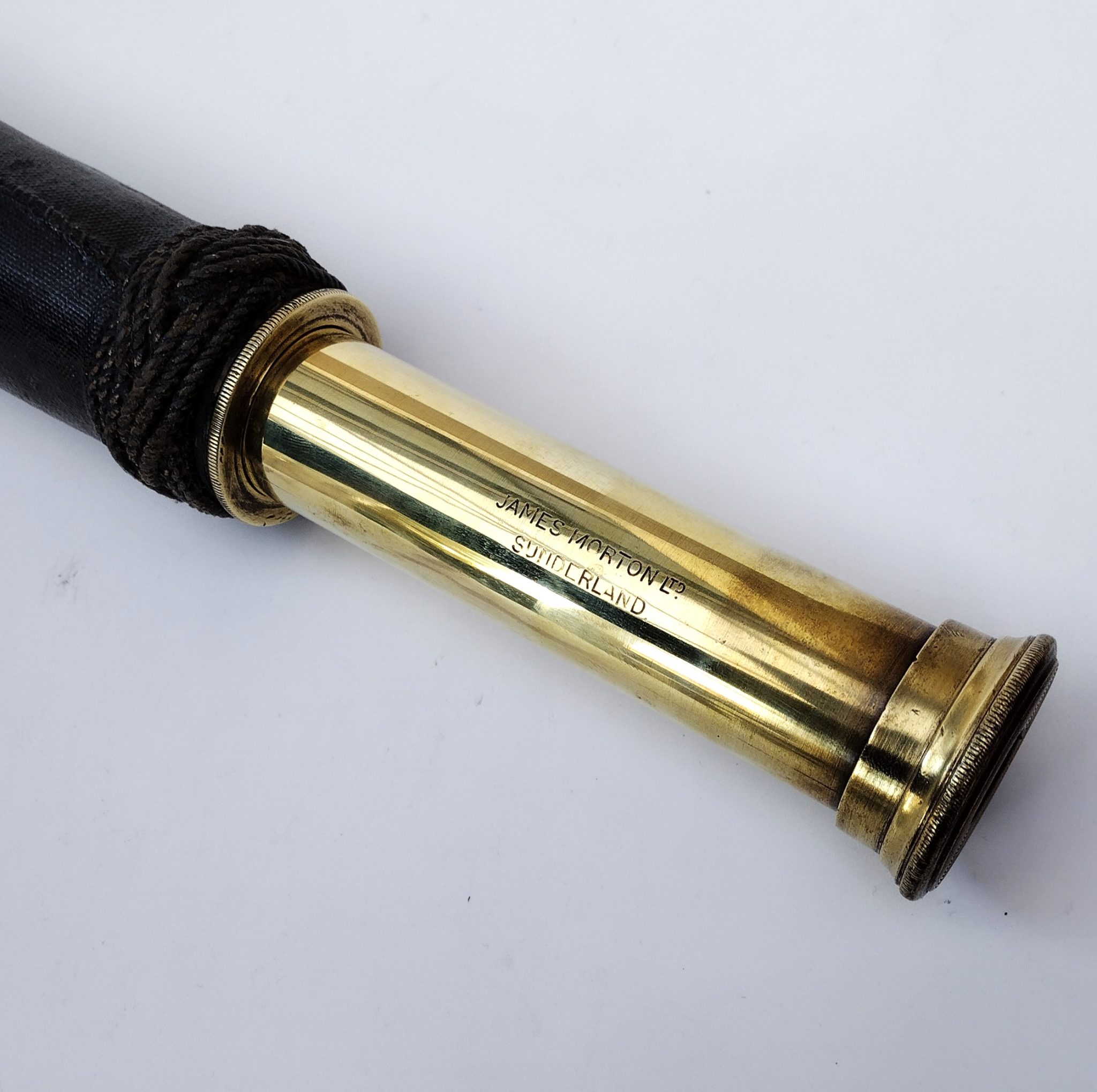 Engraved, ‘James Morton Ltd, Sunderland’, the telescope has a sliding ray shade and dust slider to the eye piece. The barrel has a canvas covering with ‘Turks head’ knots to the ends.
