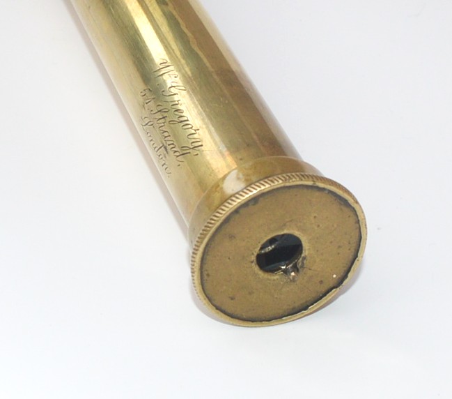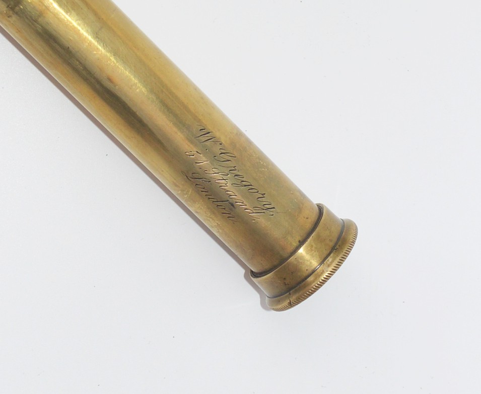 A single draw taper barrelled marine telescope signed, ‘ W. Gregory, 51 Strand, London’