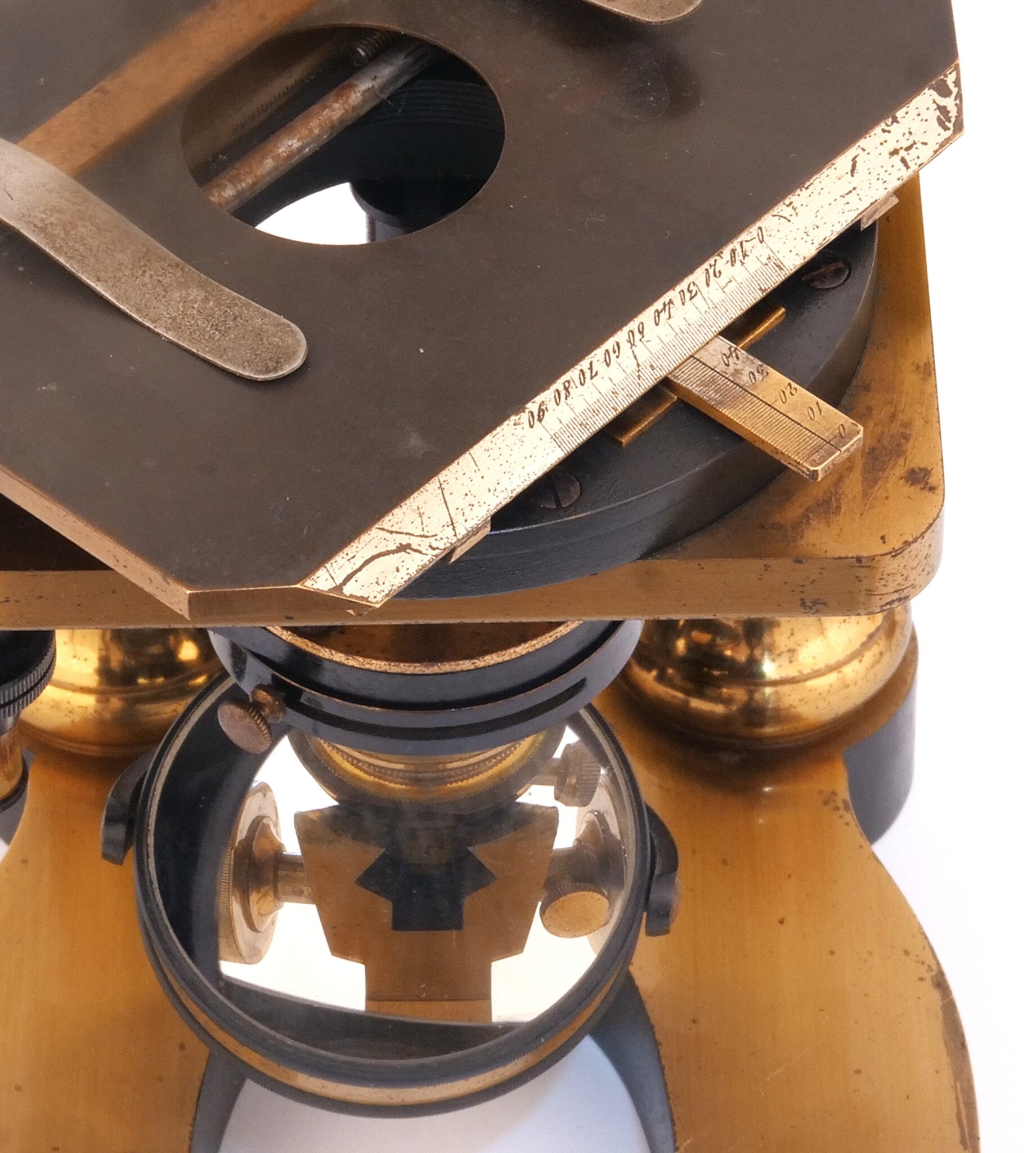 The microscope has a solid bronze base supported by two pillars that support the mechanism. It is an extraordinarily heavy instrument. Except for the base and some parts of the stage, it is made entirely of brass. The brass appears smooth, shiny, and well preserved, with the original protective clear lacquer that gives it a beautiful patina. The double mirror is still in good condition. It comes with a complete set of lenses in their brass cases and eyepieces. The storage case is a beautiful, heavy, solid mahogany box with a handle.