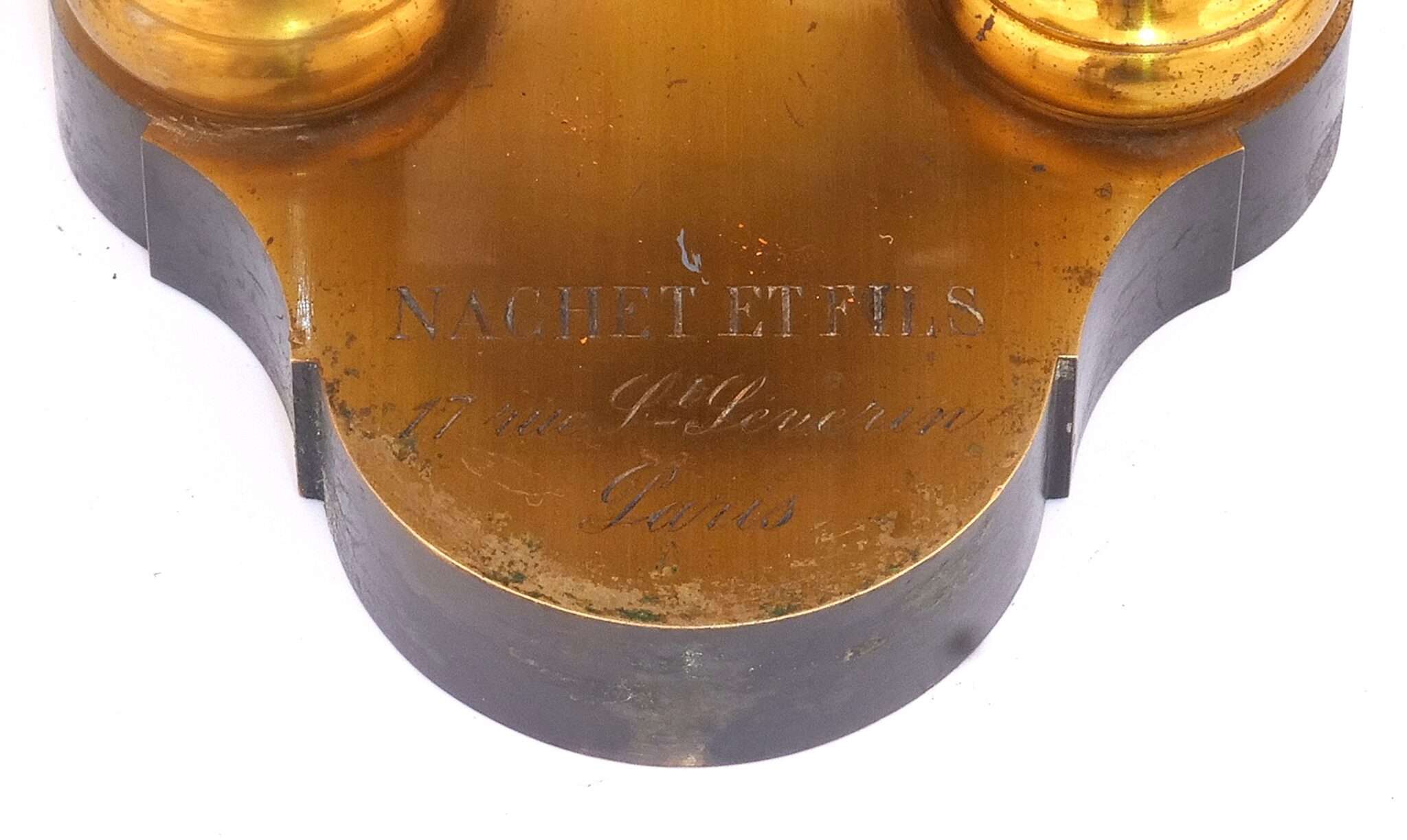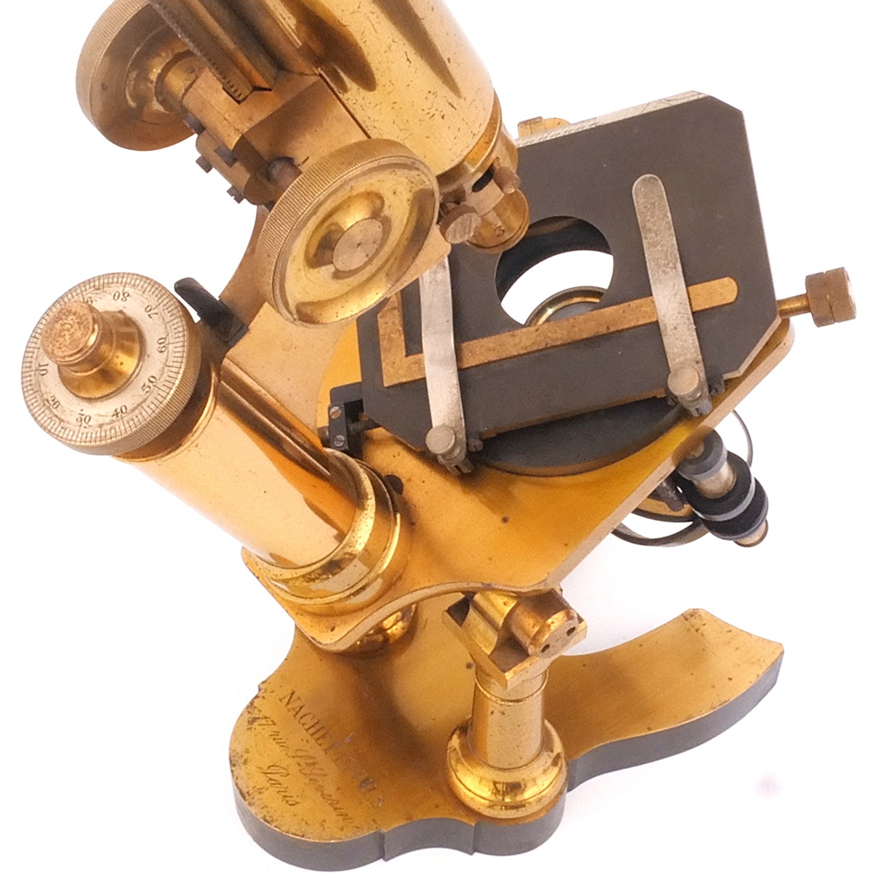 Nachet Grand Model No. 2 Microscope, superbly preserved and in its original wooden case. This is a large, complete instrument manufactured in France in 1870. The microscope appears as it was supplied from the factory more than 140 years ago. Nachet’s Grand Model was the firm’s most popular model and also its highest quality, considered the finest French microscope of the 19th century. It is in excellent working order and very good cosmetic condition. It has a mechanical stage with micrometric adjustment and horizontal rotation, and has very rare scales for reading movements on the X-Y axes.