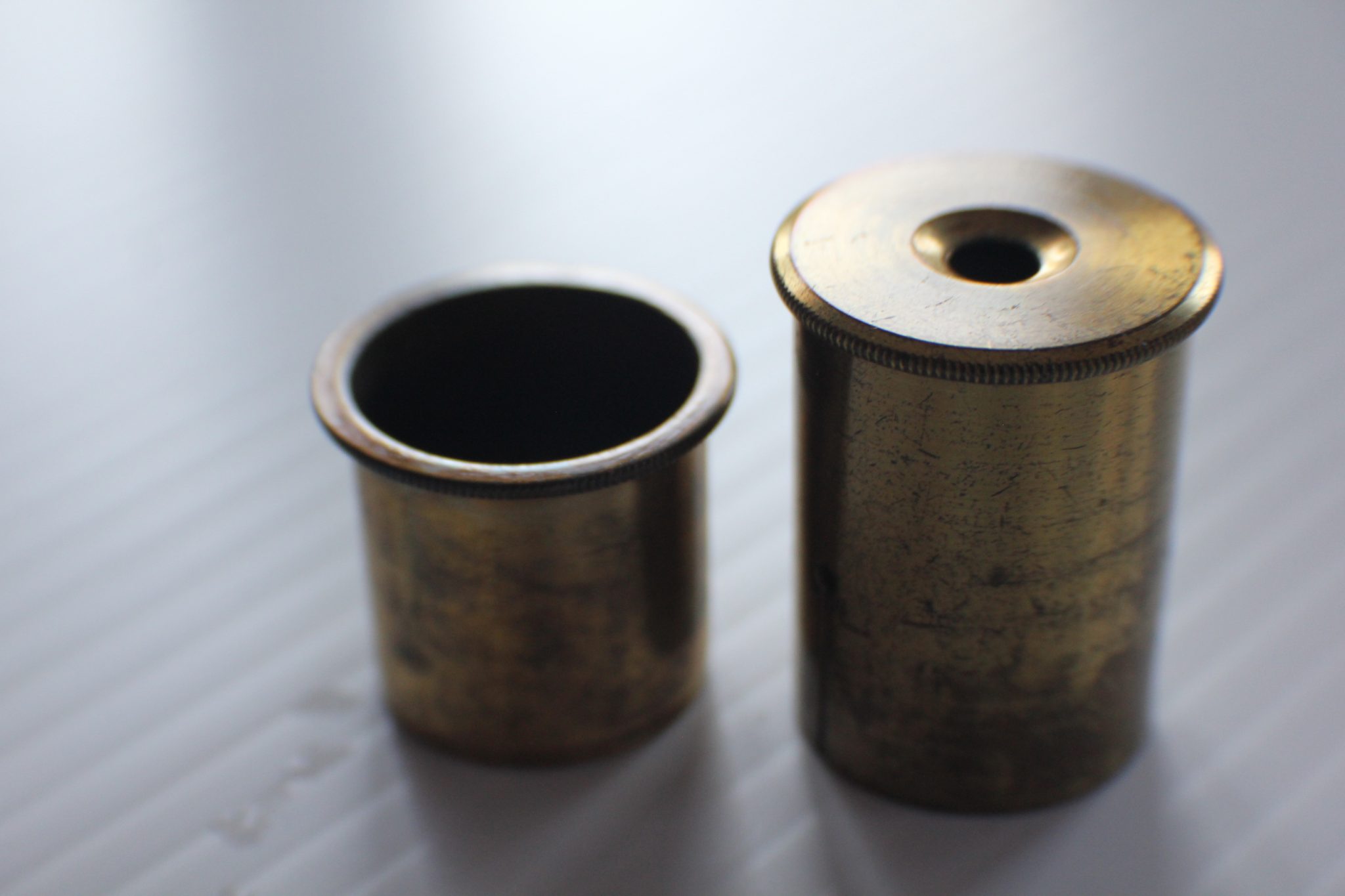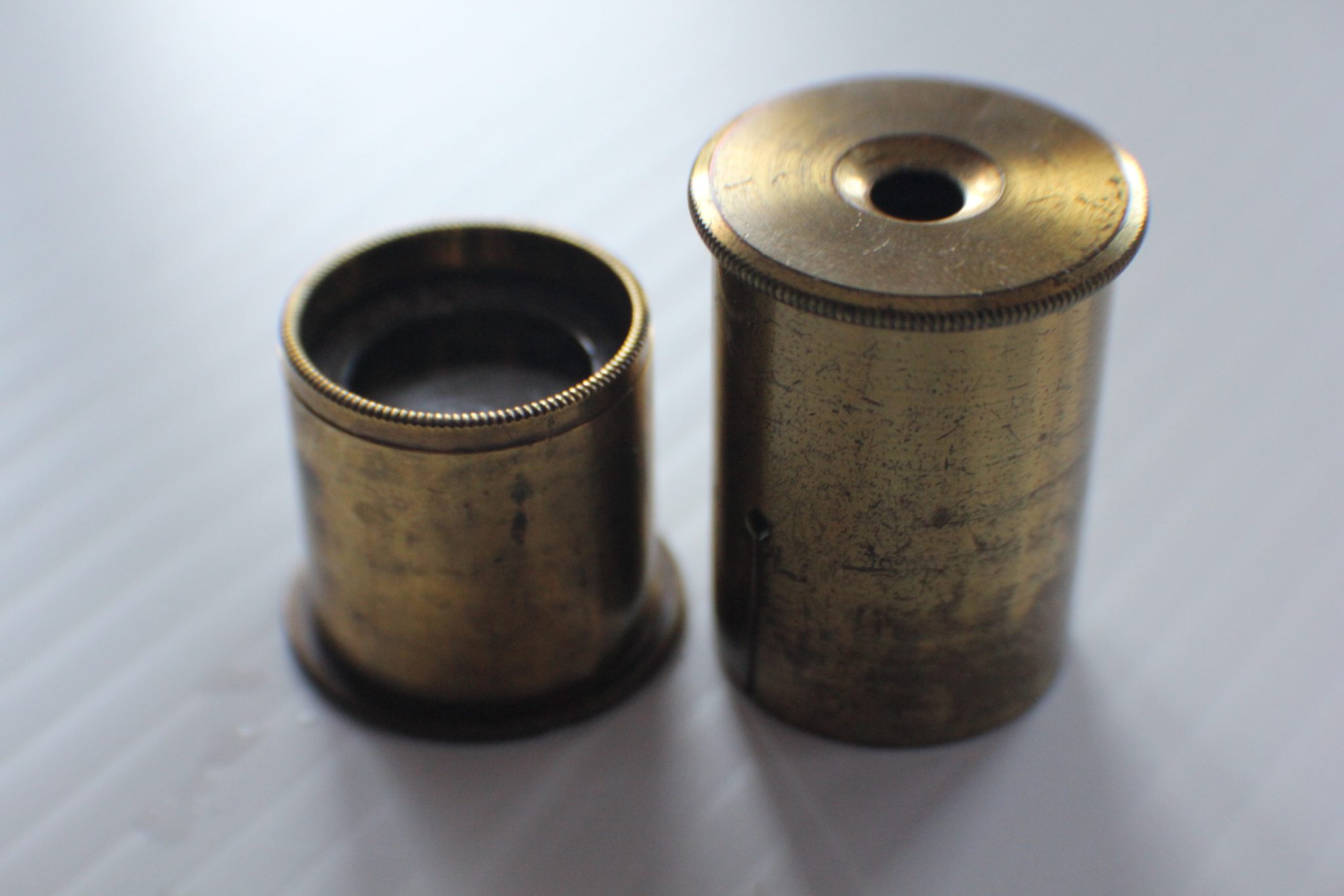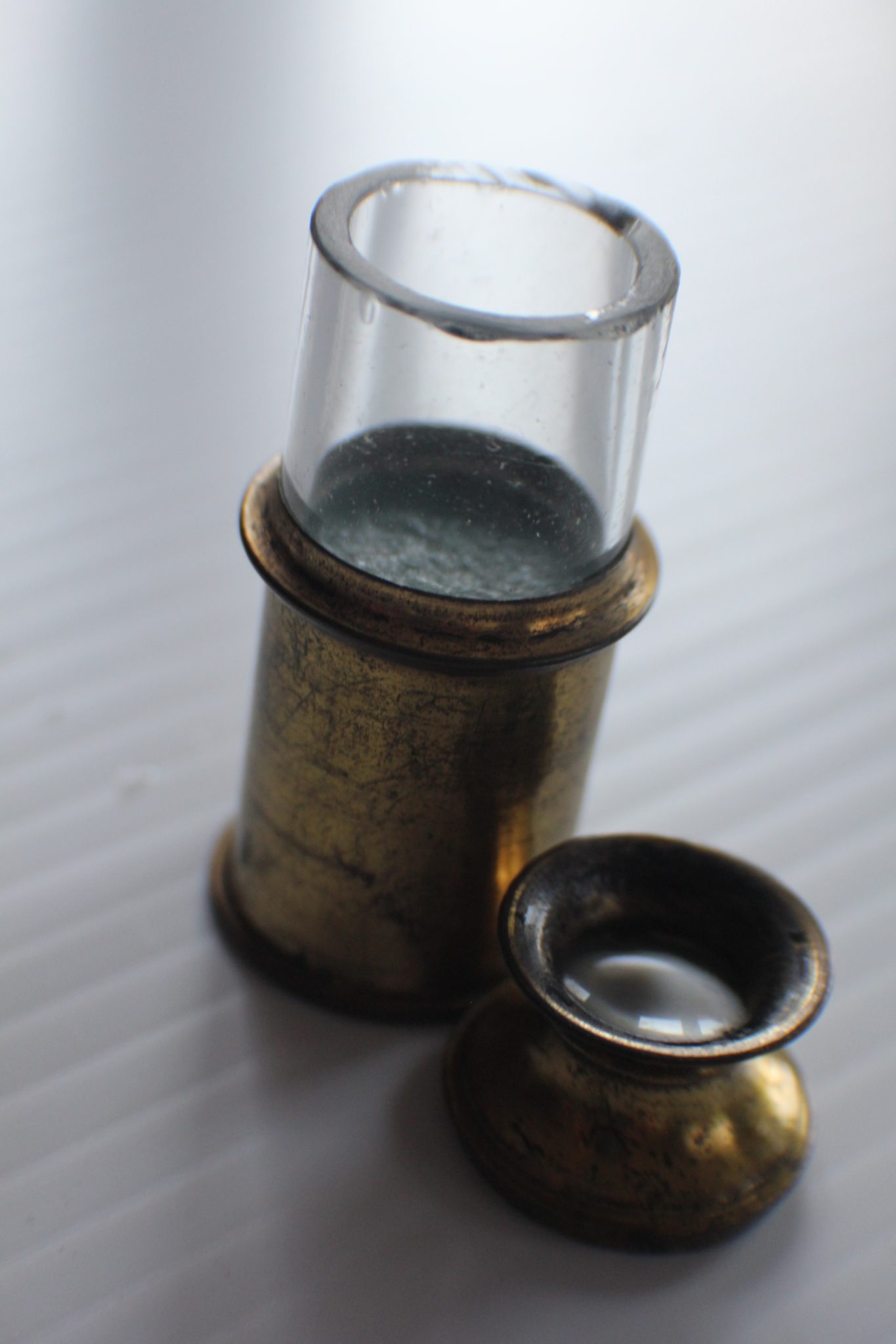 The entire ensemble fits into the pocket case with push button closure, measuring a mere 10 x 7 x 3 cm. (4 x 3 x 1 inches). Slight wear to the golden lacquer but no abuse to the instruments. Glass and lenses are perfect. Silvering is slightly oxidised.