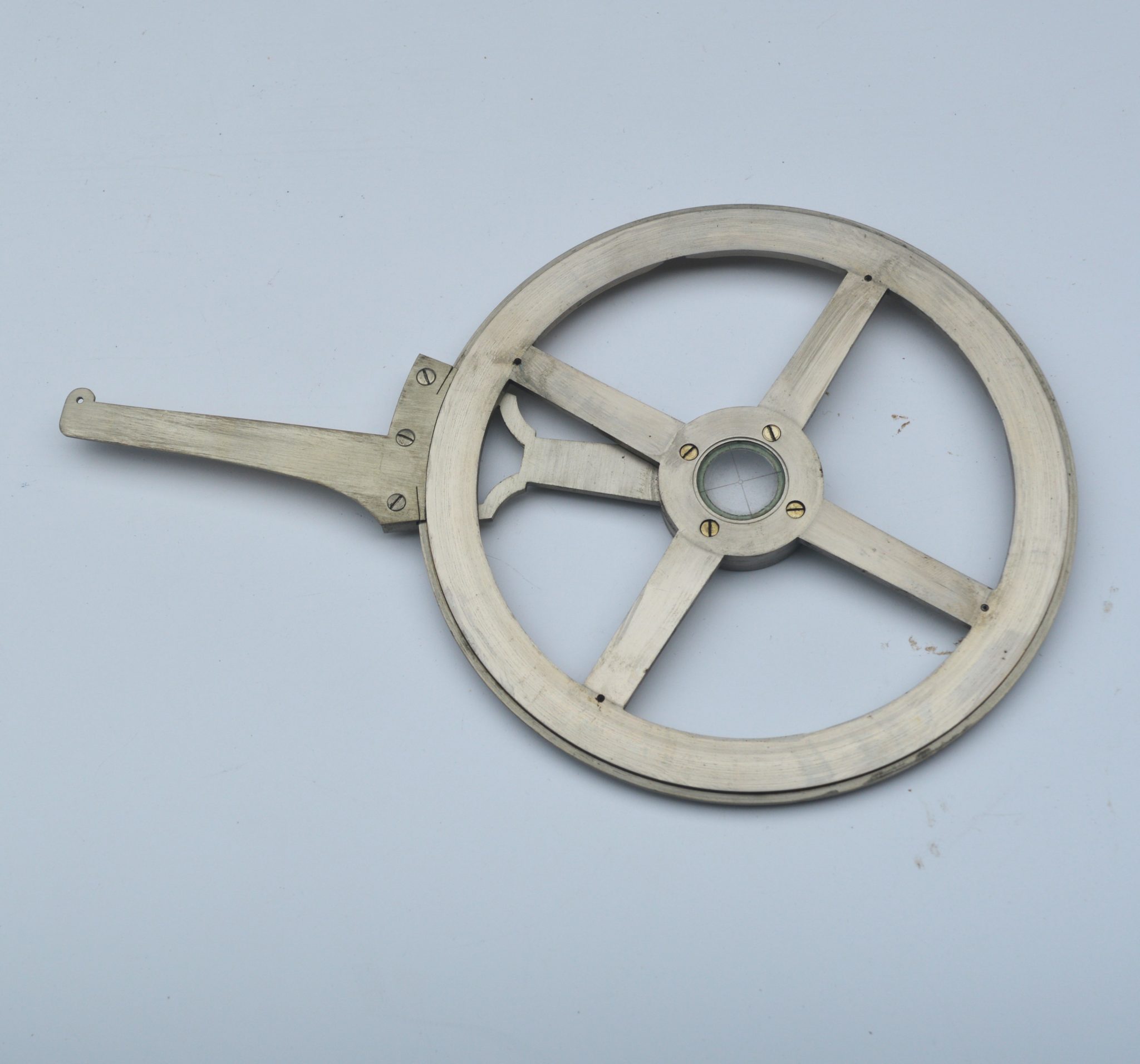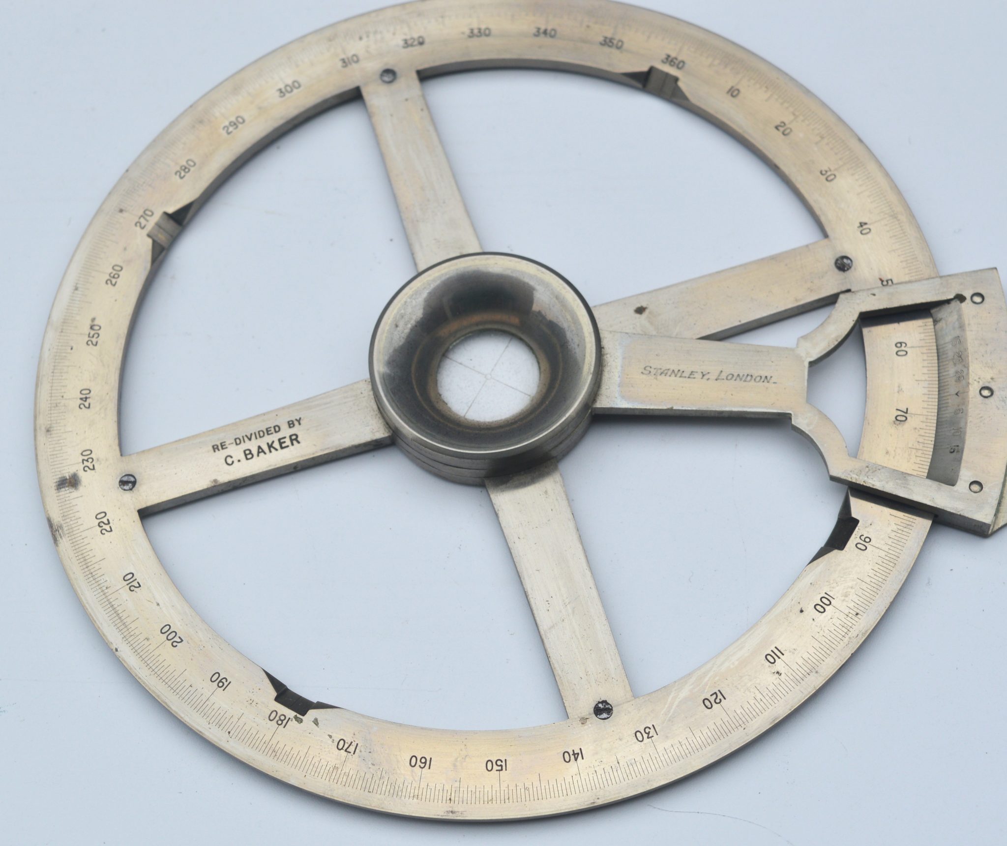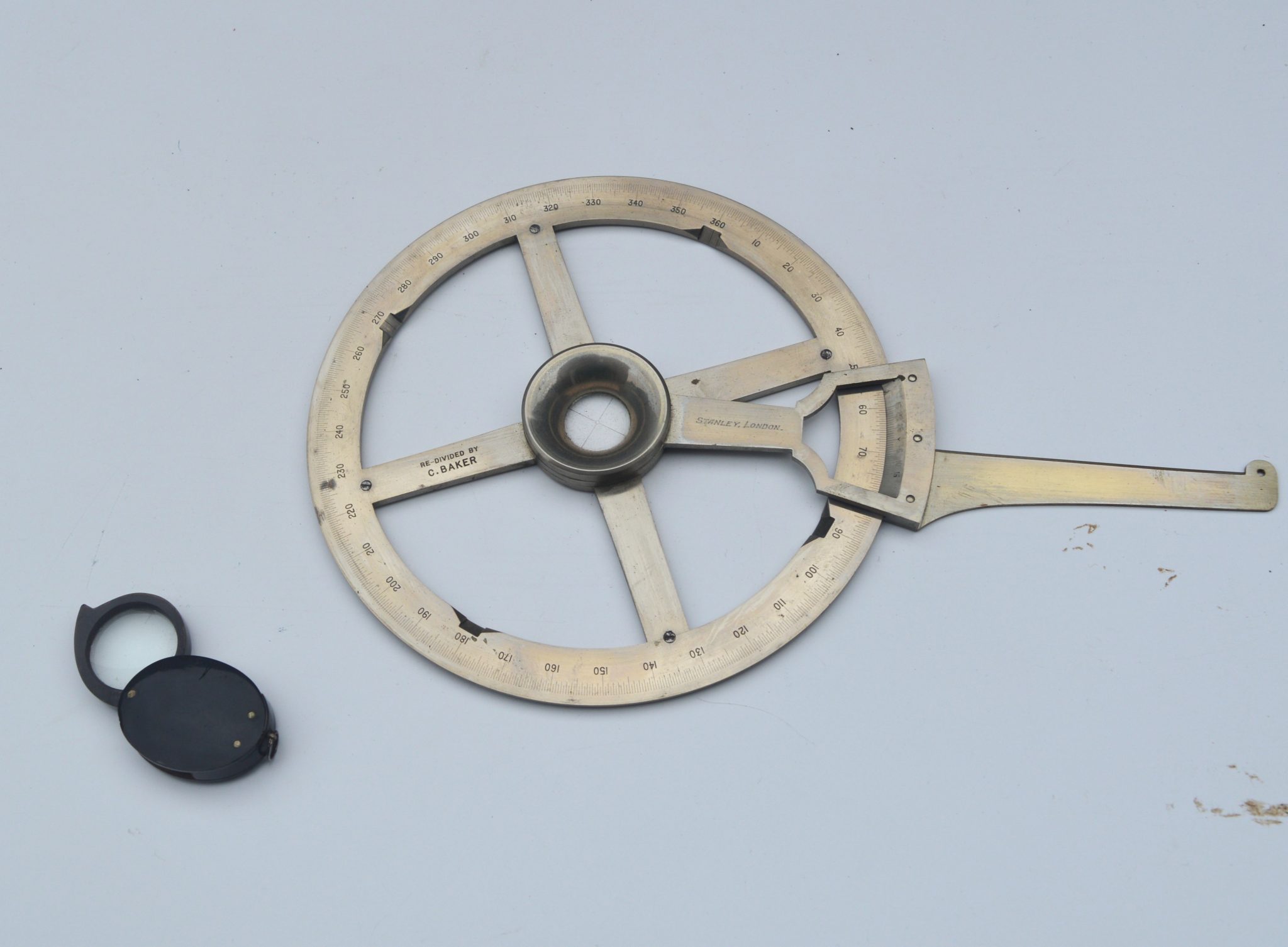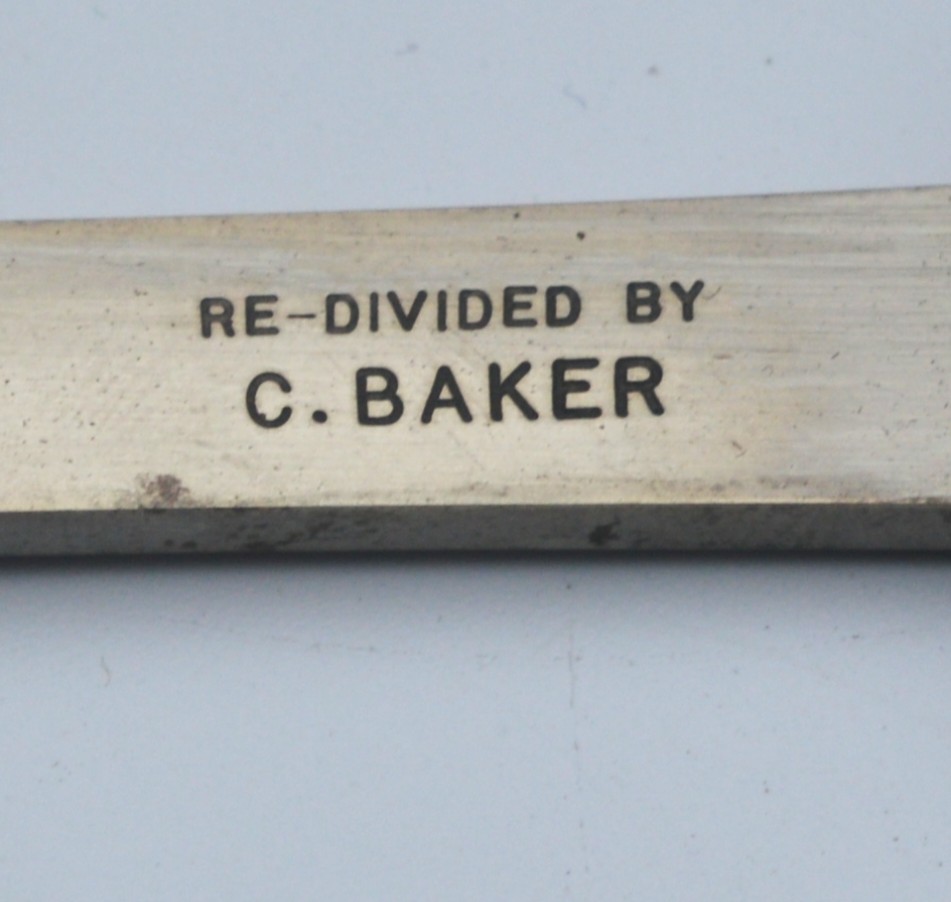 A very nice 6 inch nickel silver single arm protractor, signed on the vernier arm, ‘Stanley, London’ and also engraved on the cross bar, ‘Re-divided by C. Baker’. Contained in a felt lined mahogany case with magnifier, the lid with two fastening hooks.